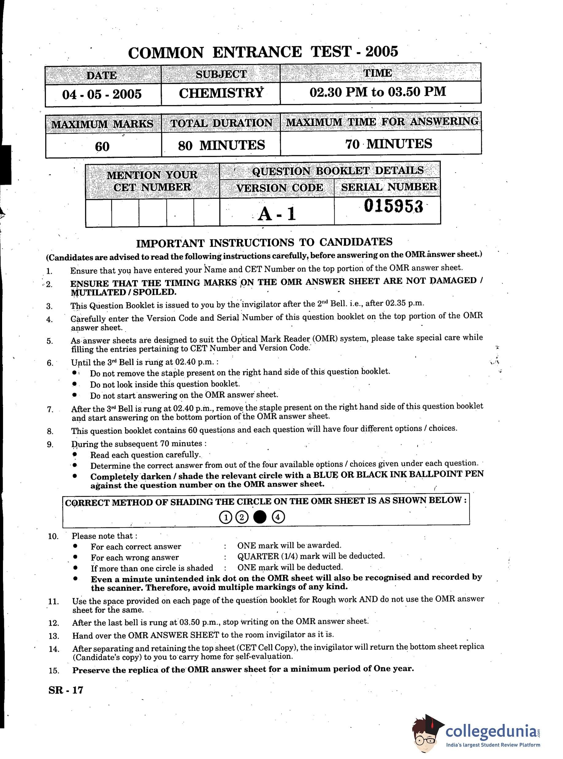 KCET 2005 Chemistry Question Paper with Answer Key pdf is available for download. The exam was conducted by Karnataka Examination Authority (KEA) on May 4, 2005 in the Afternoon Session 2:30 PM to 3:50 PM. The question paper comprised a total of 60 questions.