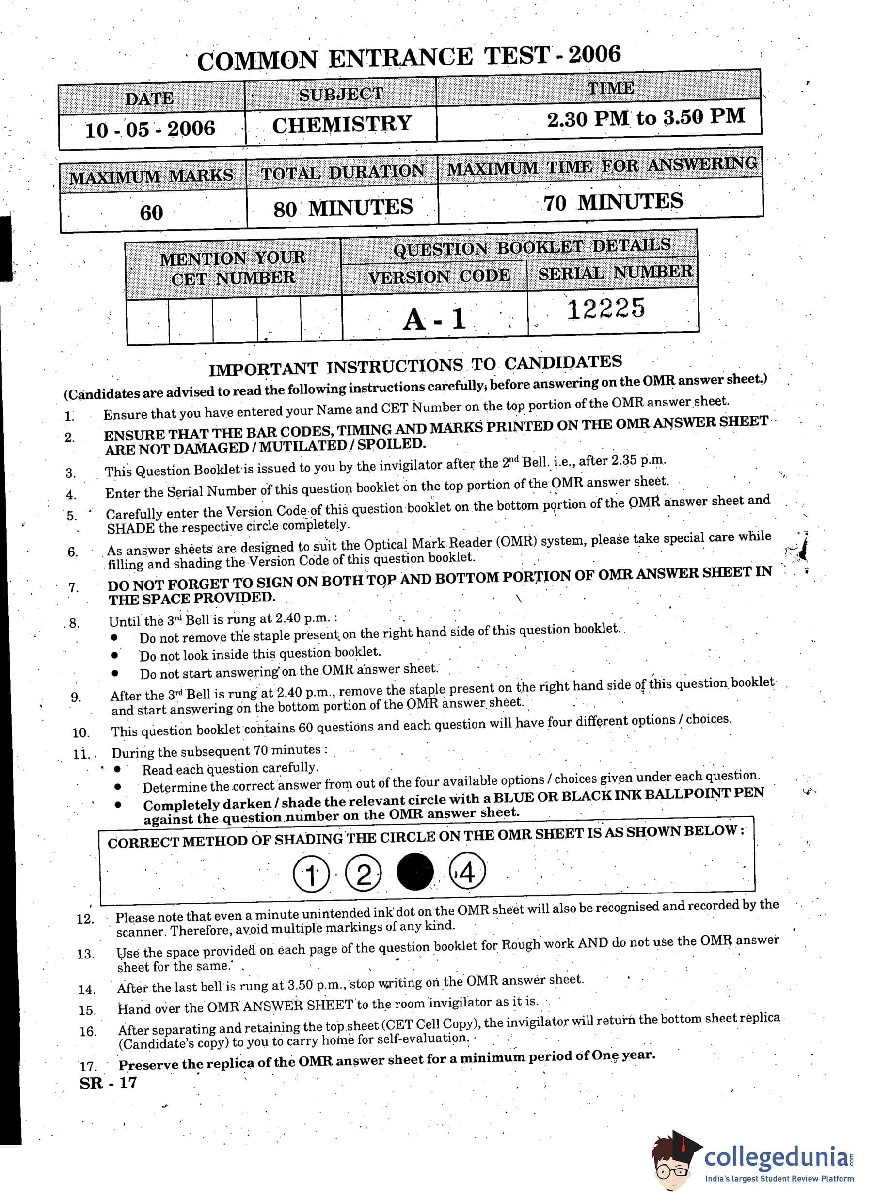 KCET 2006 Chemistry Question Paper with Answer Key pdf is available for download. The exam was conducted by Karnataka Examination Authority (KEA) on May 10, 2006 in the Afternoon Session 2:30 PM to 3:50 PM. The question paper comprised a total of 60 questions.
