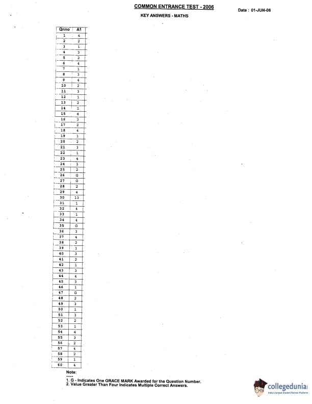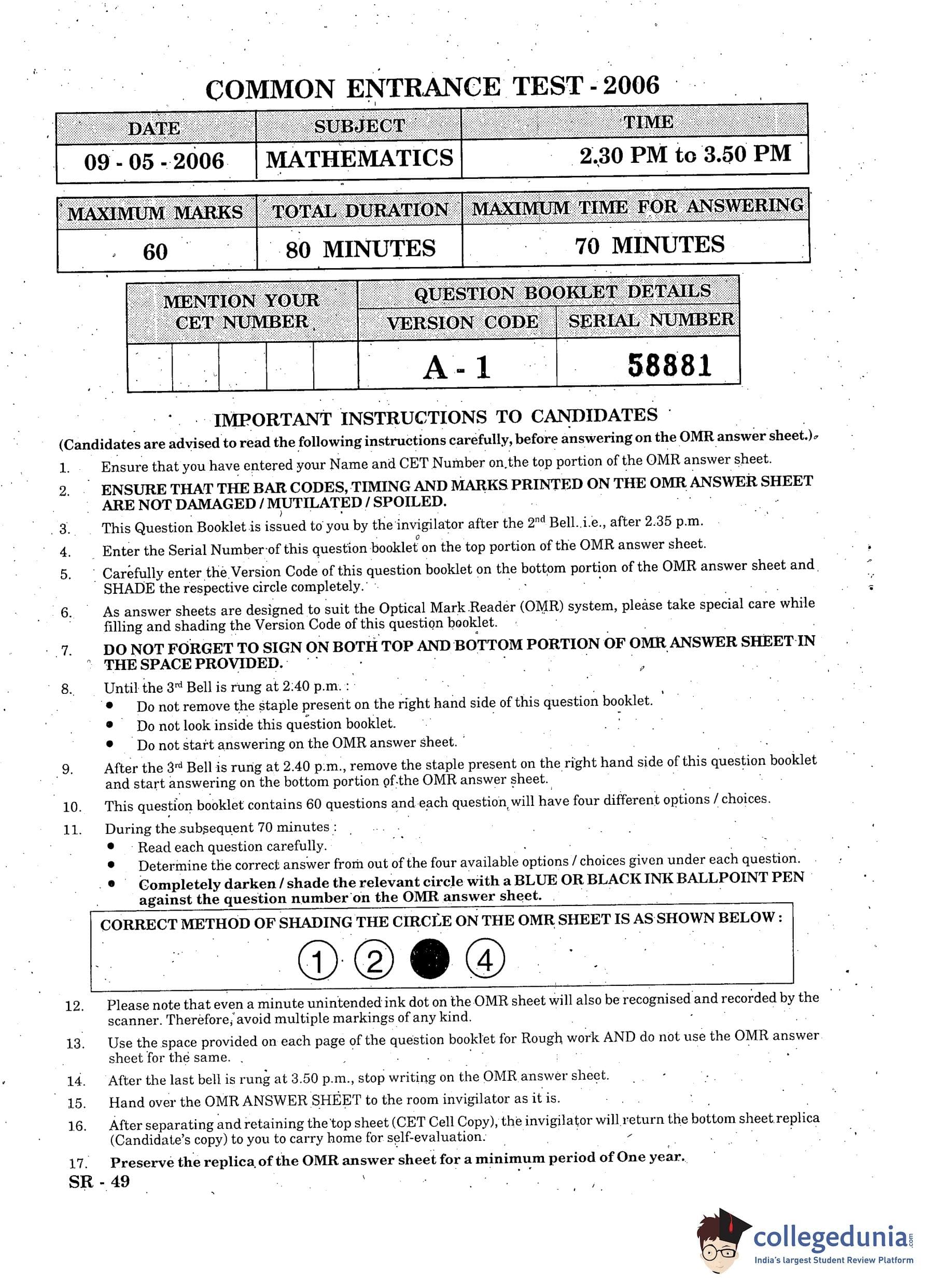 KCET 2006 Mathematics Question Paper with Answer Key pdf is available for download. The exam was conducted by Karnataka Examination Authority (KEA) on May 9, 2006 in the Afternoon Session 2:30 PM to 3:50 PM. The question paper comprised a total of 60 questions.