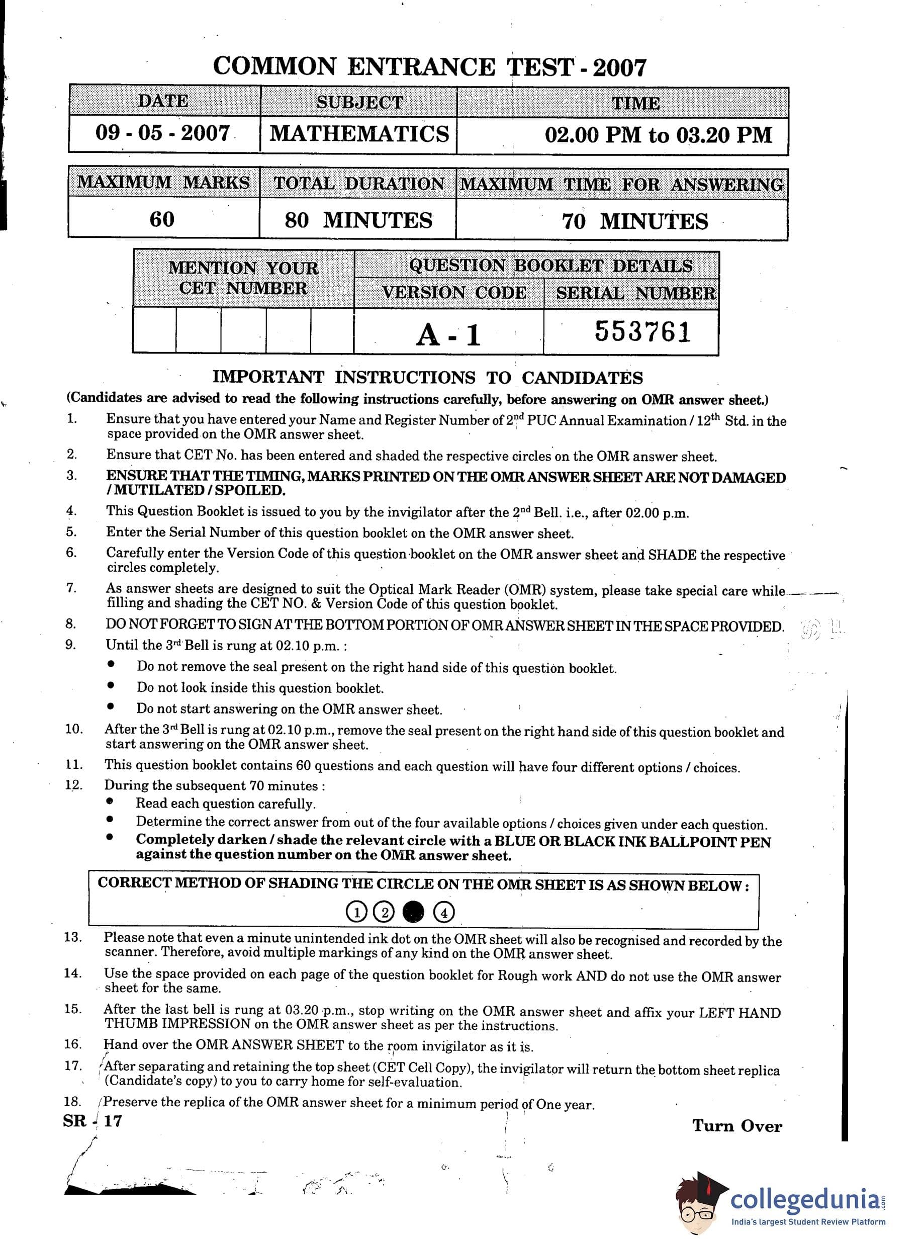 KCET 2007 Mathematics Question Paper with Answer Key pdf is available for download. The exam was conducted by Karnataka Examination Authority (KEA) on May 9, 2007 in the Afternoon Session 2 PM to 3.20 PM. The question paper comprised a total of 60 questions.