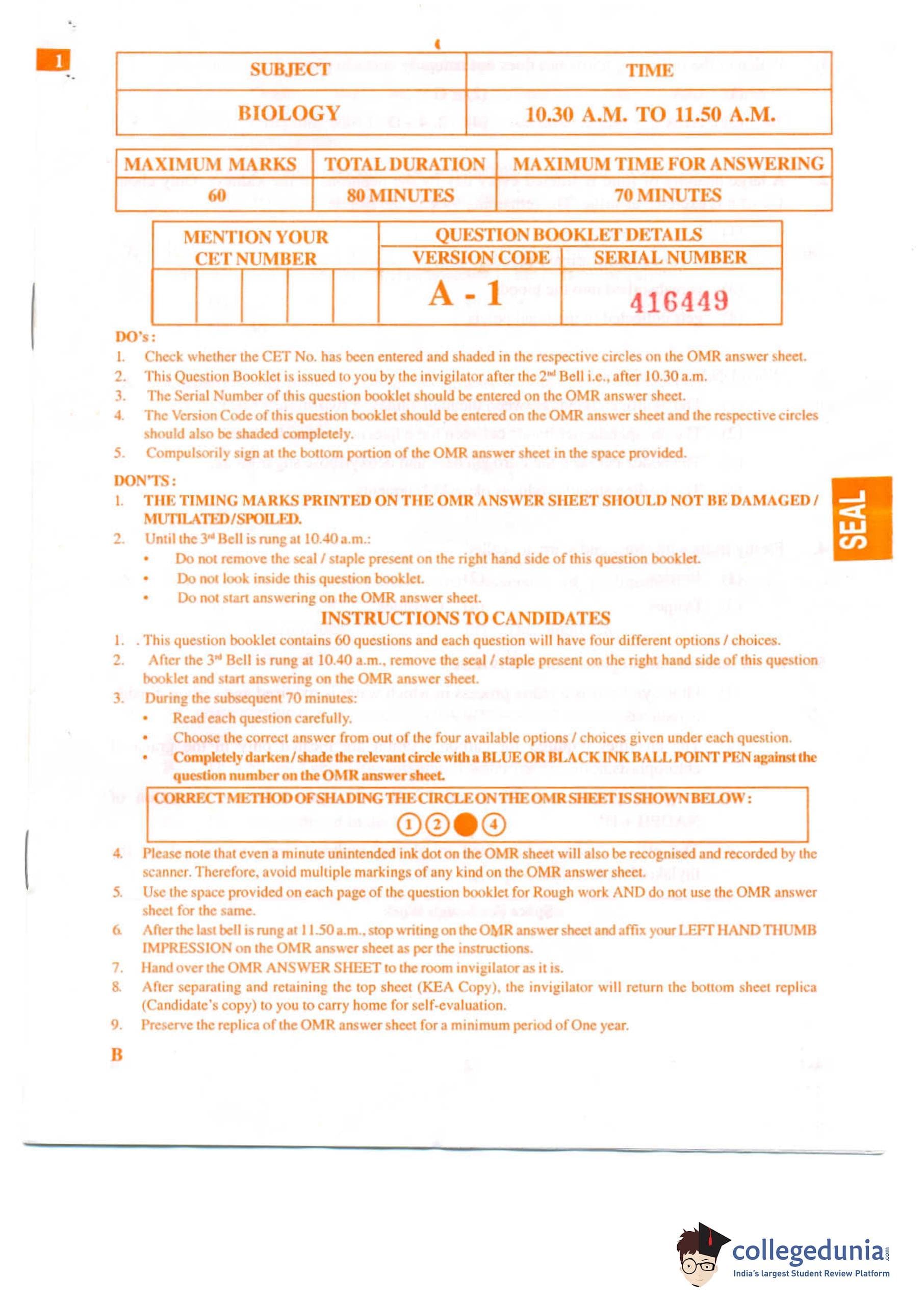 KCET 2009 Biology Question Paper with Answer Key pdf is available for download. The exam was conducted by Karnataka Examination Authority (KEA) on May 6, 2009 in the Morning Session 10:30 AM to 11:50 AM. The question paper comprised a total of 60 questions.