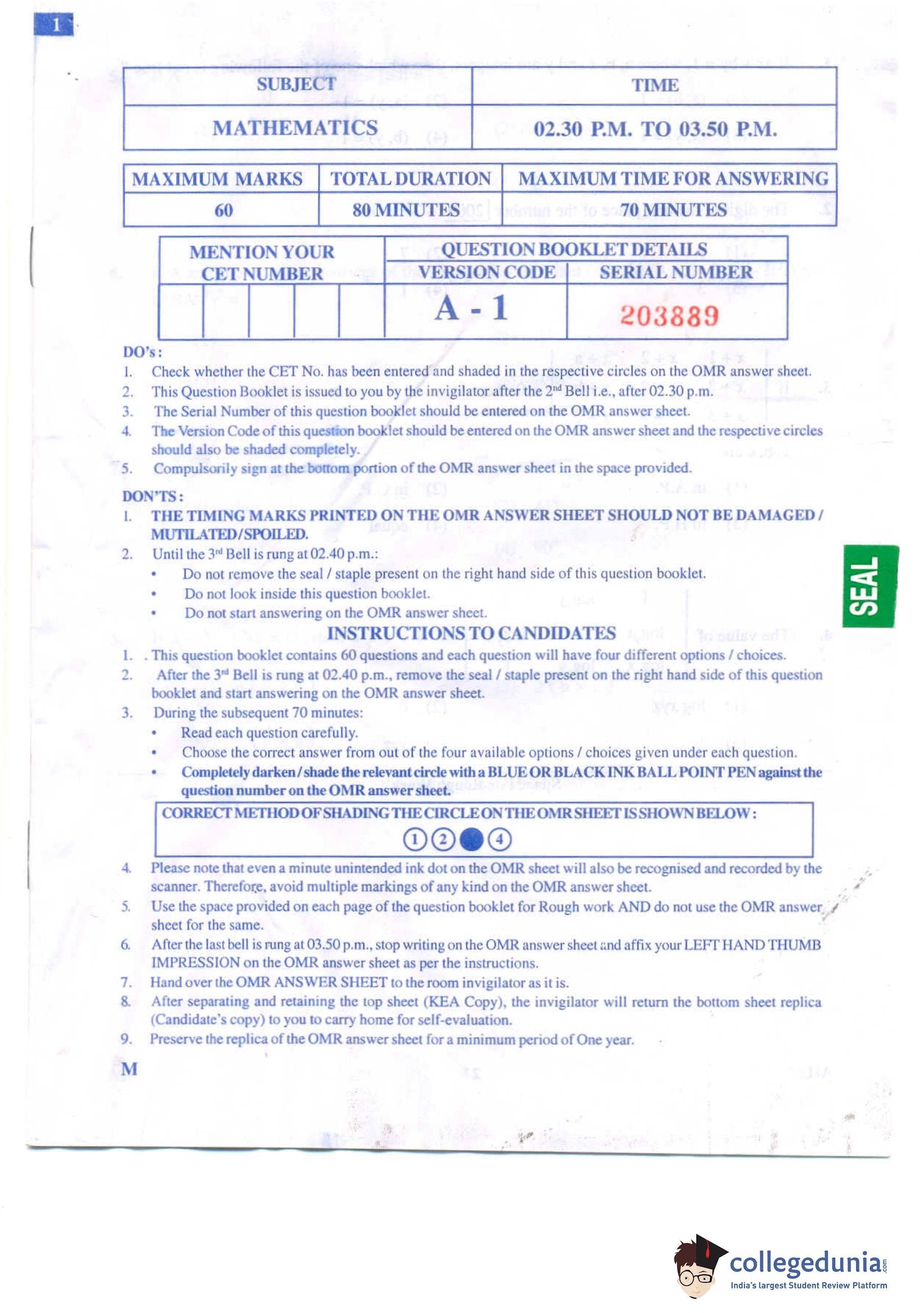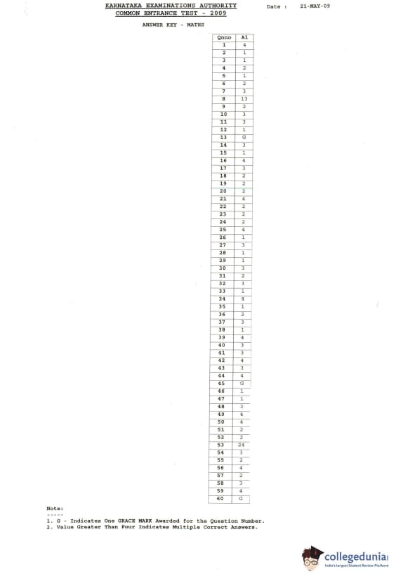 KCET 2009 Mathematics Question Paper with Answer Key pdf is available for download. The exam was conducted by Karnataka Examination Authority (KEA) on May 6, 2009 in the Afternoon Session 2:30 PM to 3:50 PM. The question paper comprised a total of 60 questions.