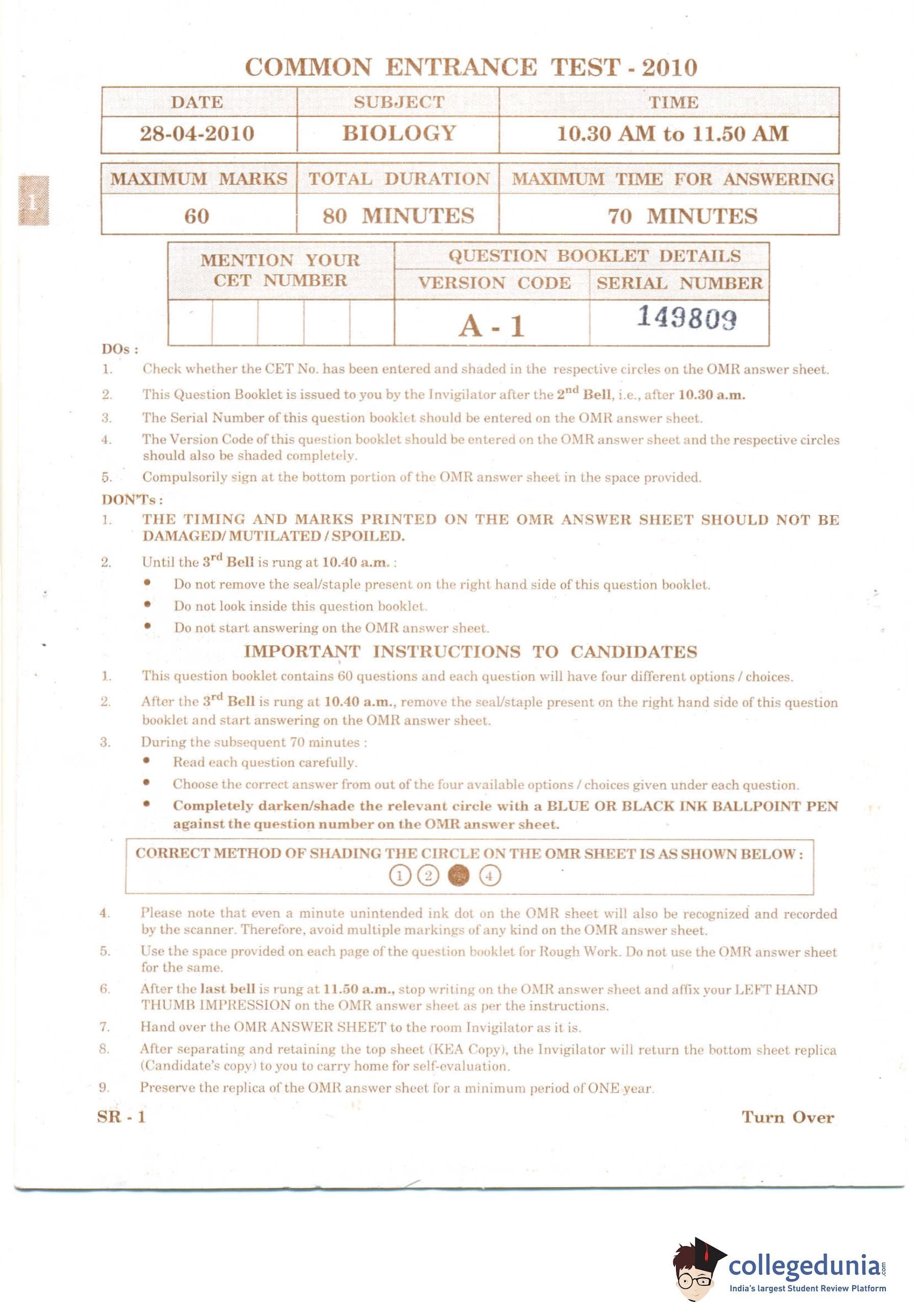 KCET 2010 Biology Question Paper with Answer Key pdf is available for download. The exam was conducted by Karnataka Examination Authority (KEA) on April 28, 2010 in the Morning Session 10:30 AM to 11:50 AM. The question paper comprised a total of 60 questions.