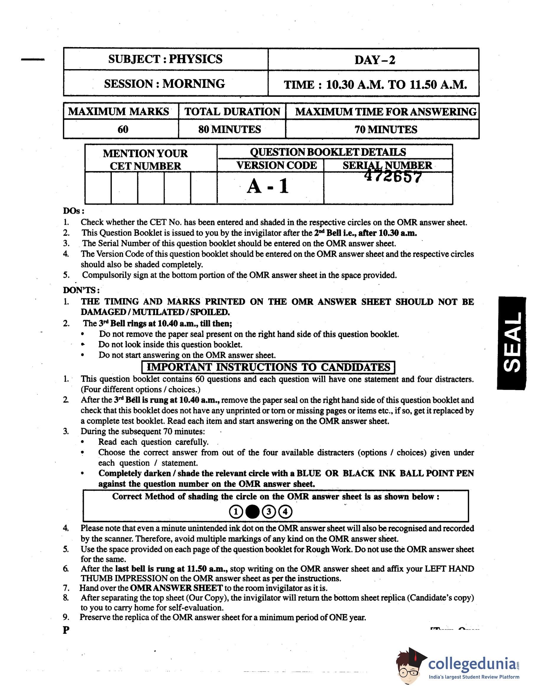 KCET 2013 Physics Question Paper with Answer Key pdf is available for download. The exam was conducted by Karnataka Examination Authority (KEA) on May 2, 2013 in the Morning Session 10:30 AM to 11:50 AM. The question paper comprised a total of 60 questions.