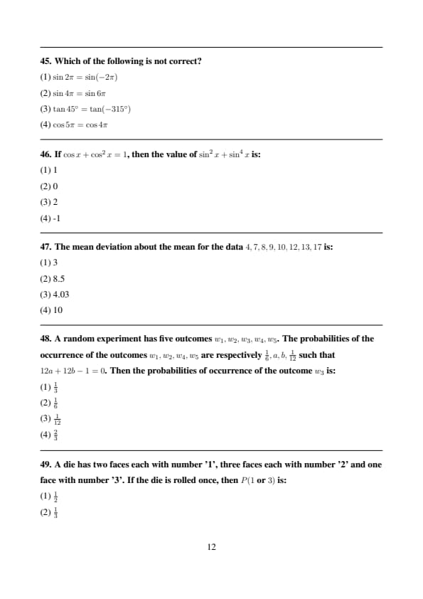 | Trigonometry | Easy to Moderate | Mostly straightforward identities and equations |
