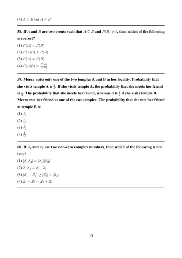 Meera visits only one of the two temples A and B in her locality. Probability that she visits temple A is \( \frac{2}{5} \). If she visits temple A, the probability that she meets her friend is \( \frac{1}{3} \). The probability that she meets her friend, whereas it is \( \frac{2}{7} \) if she visits temple B. Meera met her friend at one of the two temples. The probability that she met her friend at temple B is: