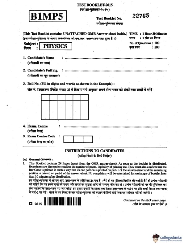 BIHAR ITICAT 2015 Physics Question Paper with Answer Key PDFs in English