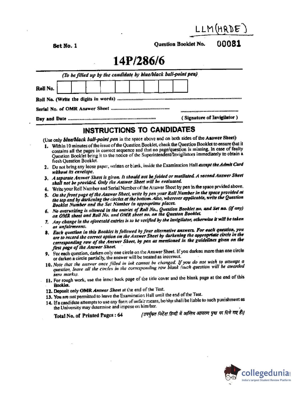 BHU PET 2014 LLM (HRDE) Question paper with answer key pdf is available for download. The exam was successfully organized by Banaras Hindu University (BHU). The question paper comprised a total of 150 questions.