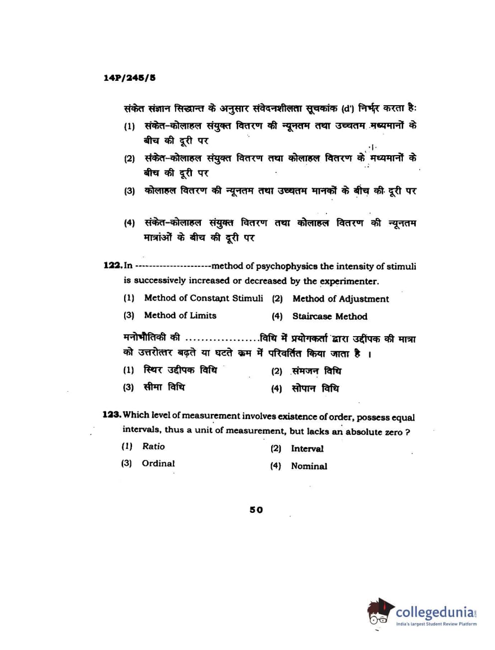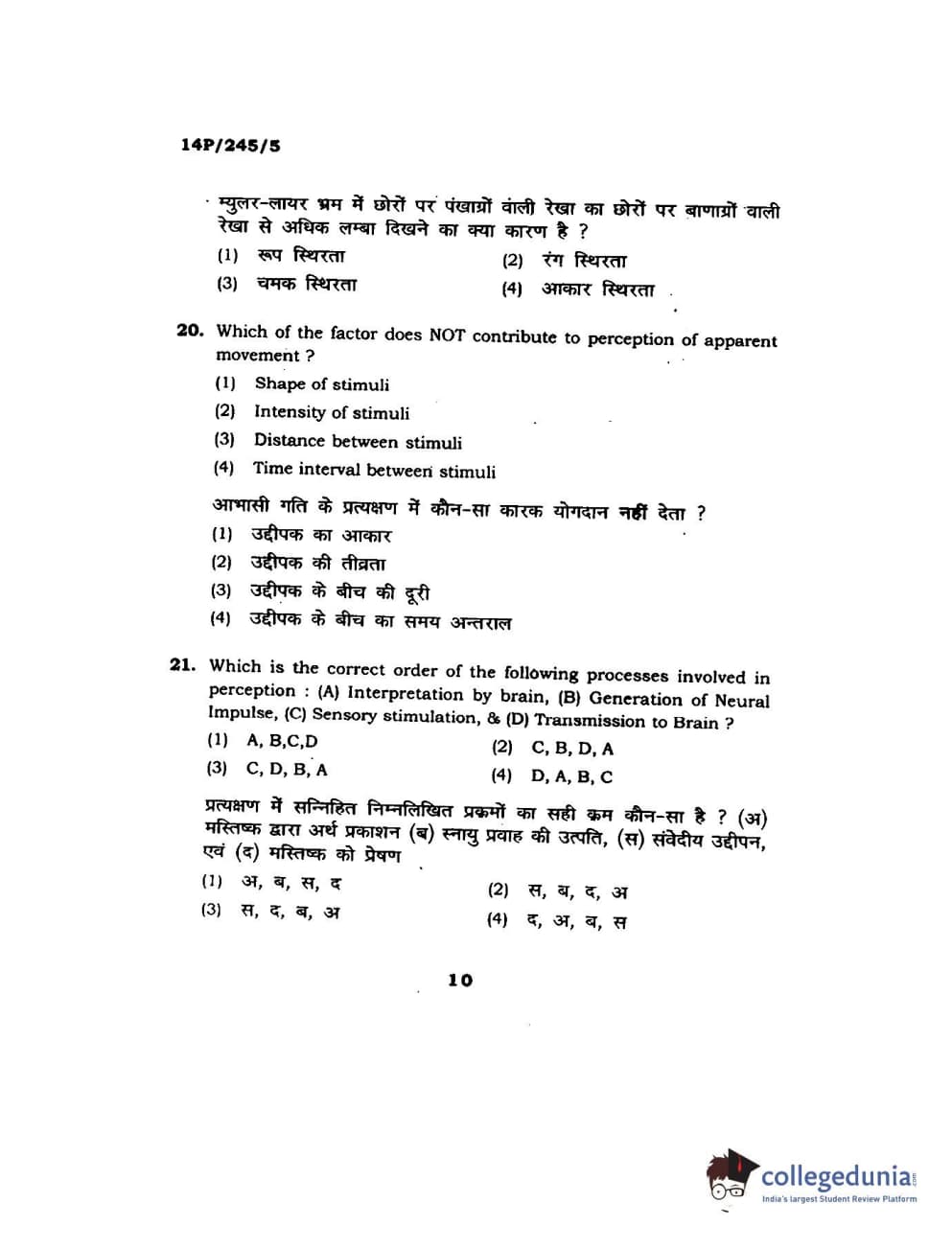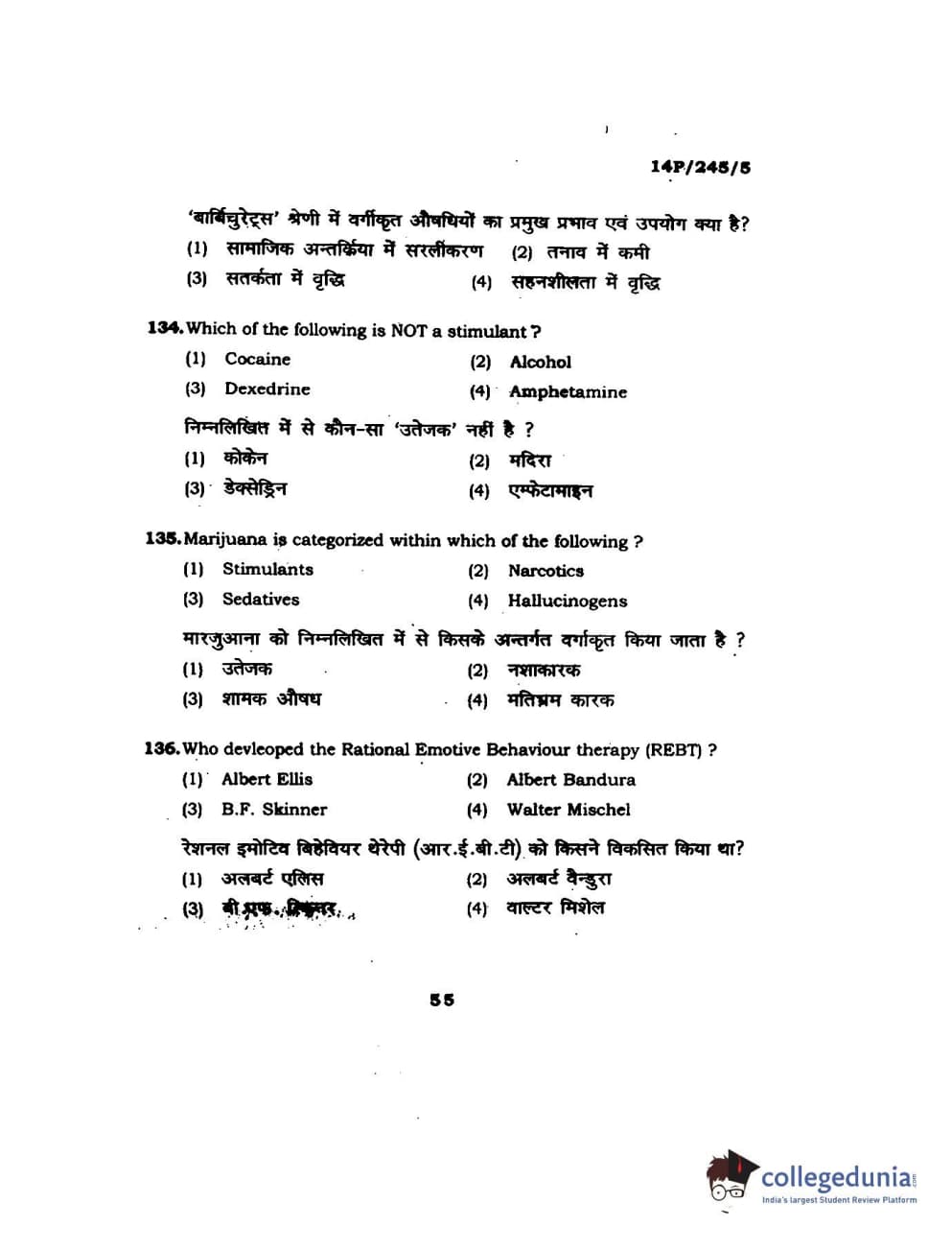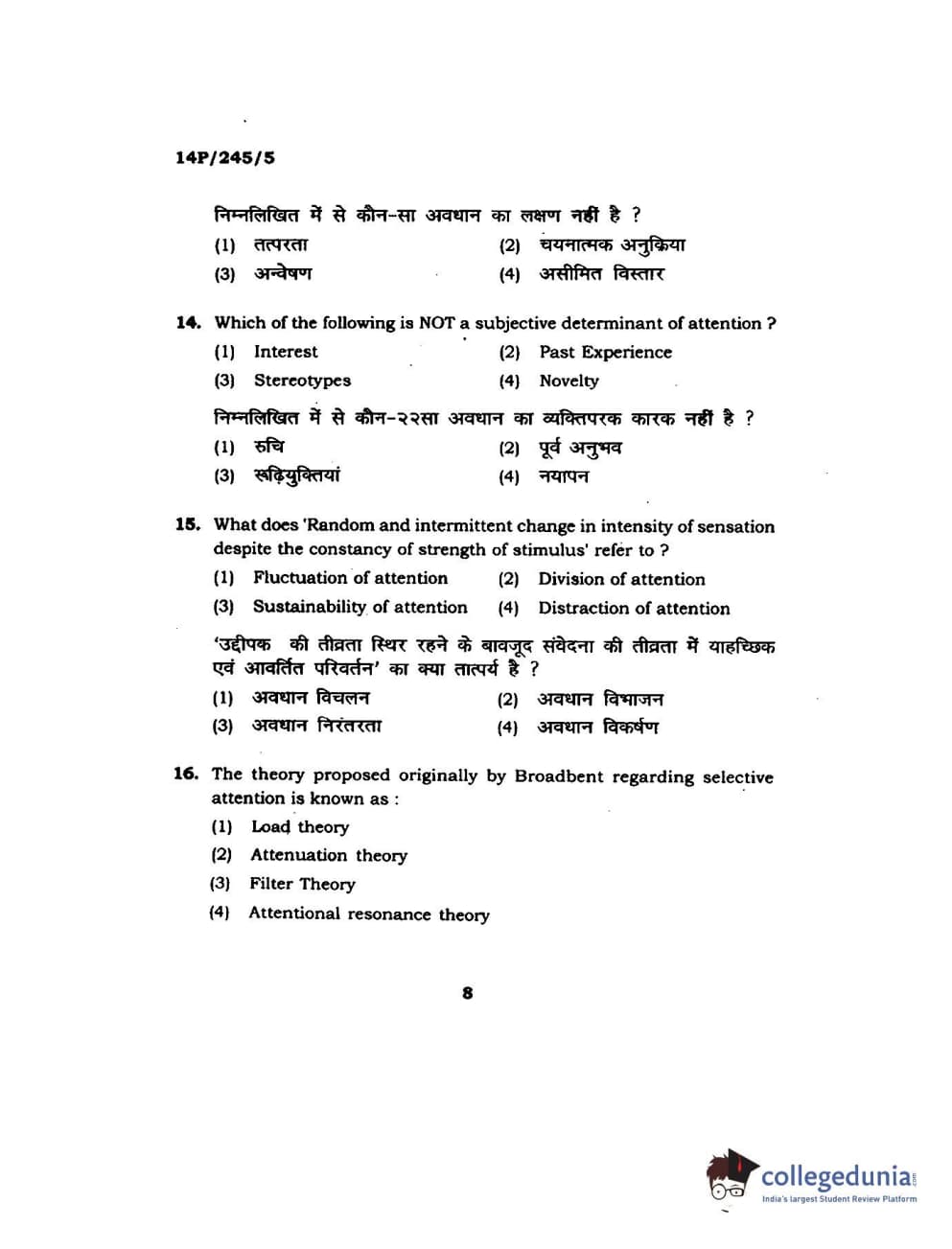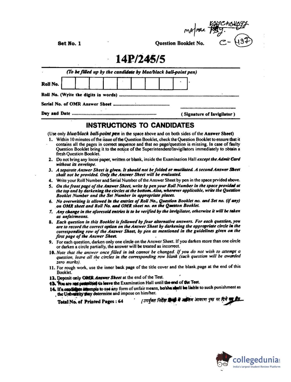 BHU PET 2014 MA Msc Psychology Question Paper with Answer Key PDFs