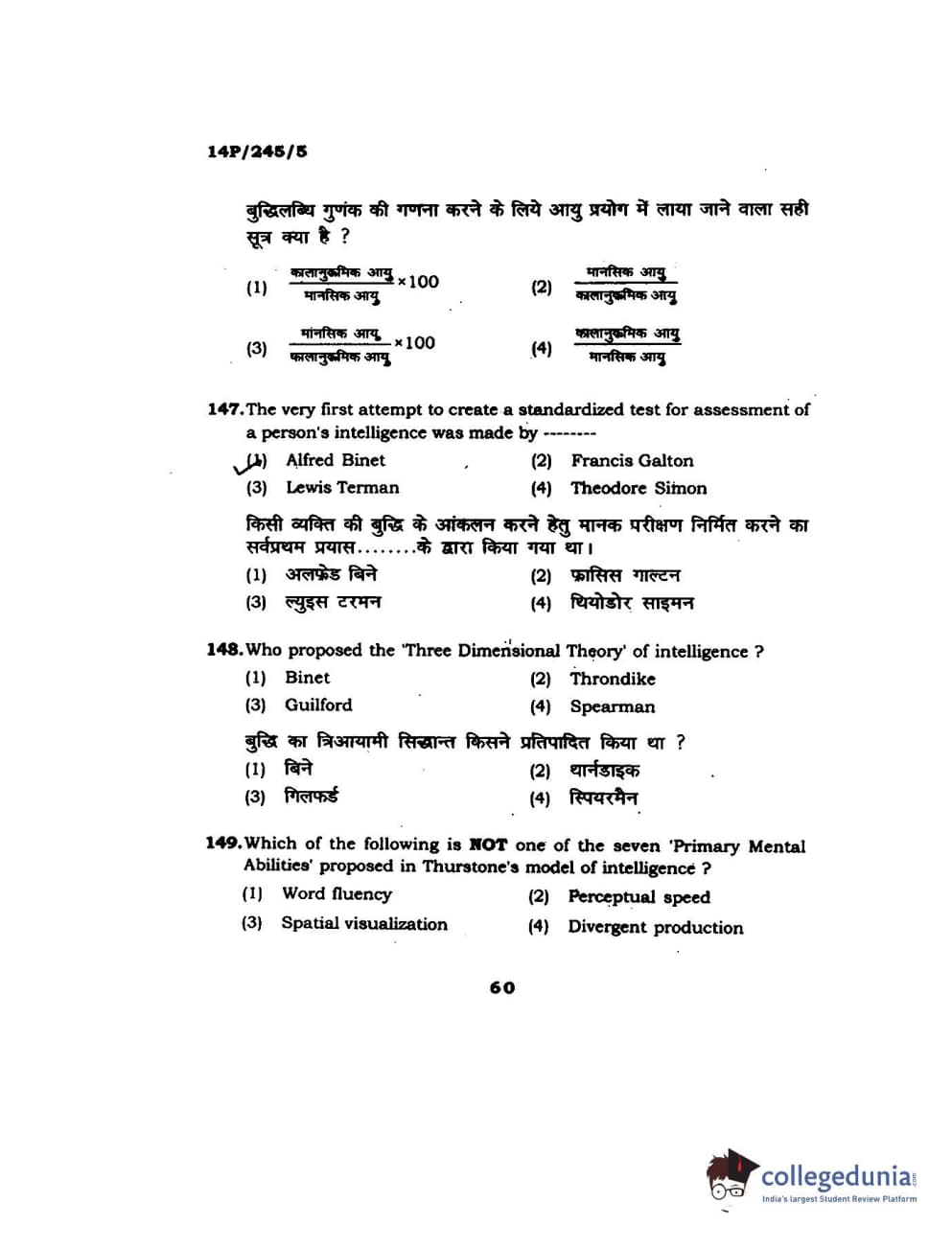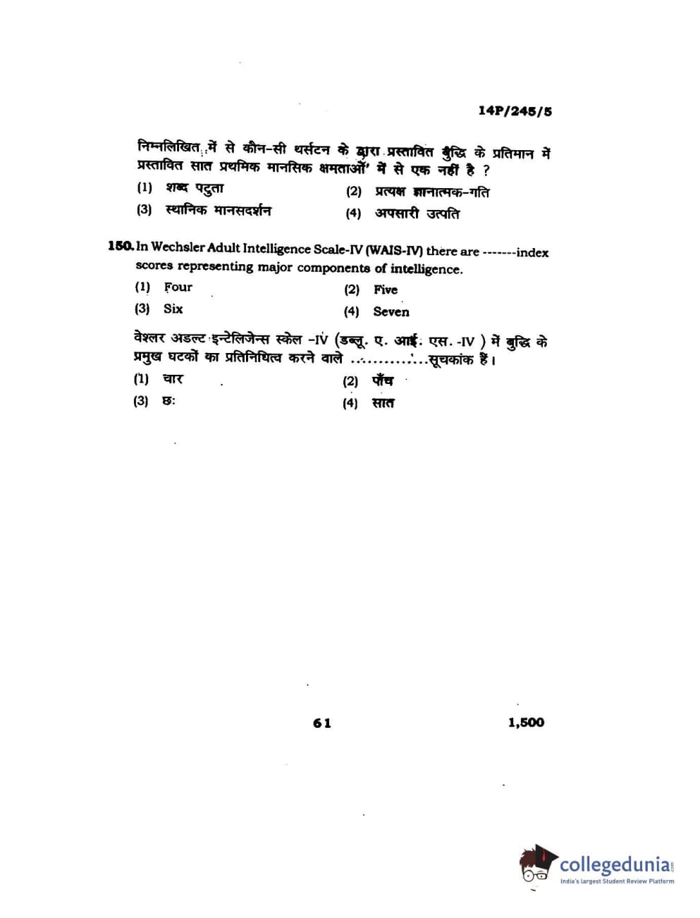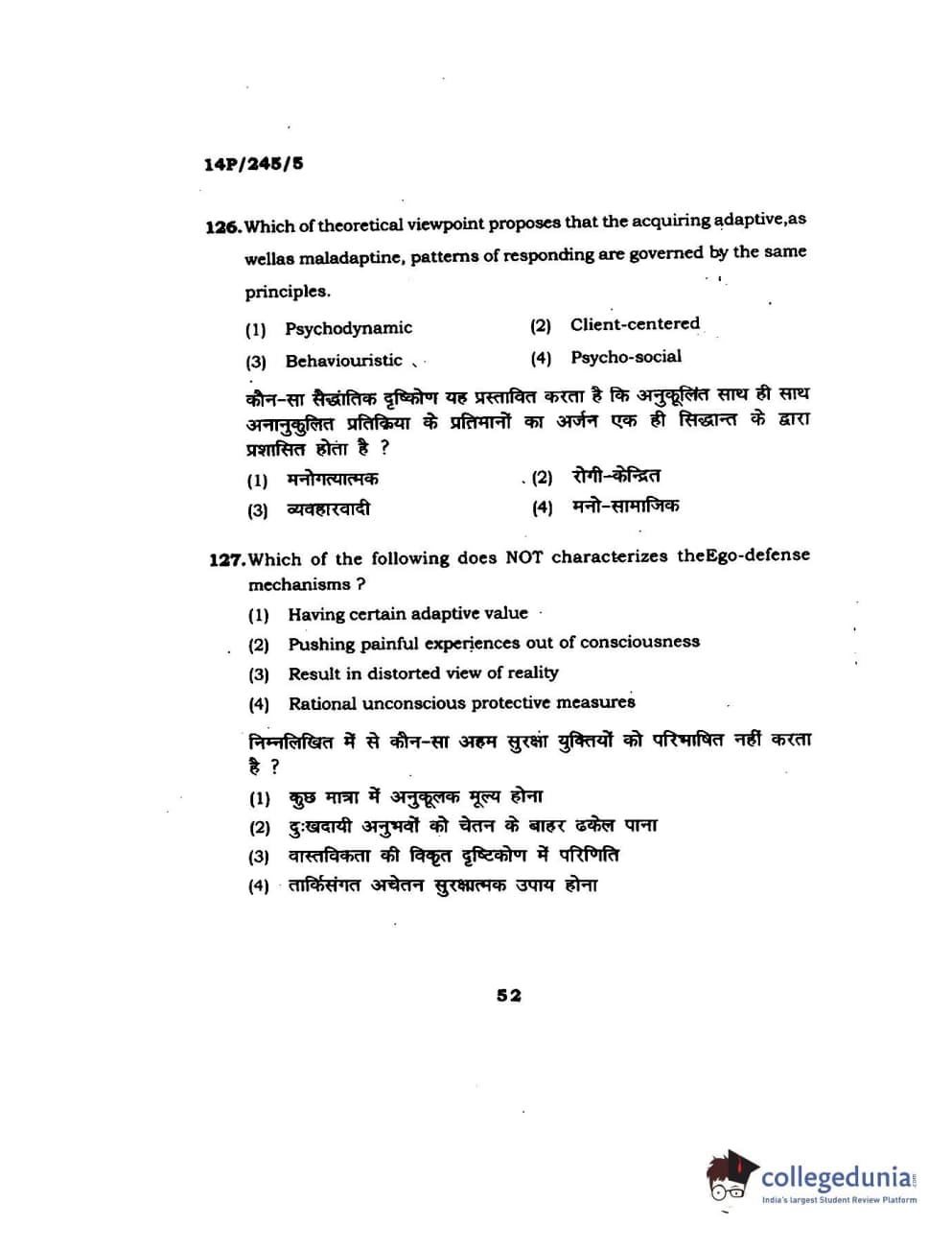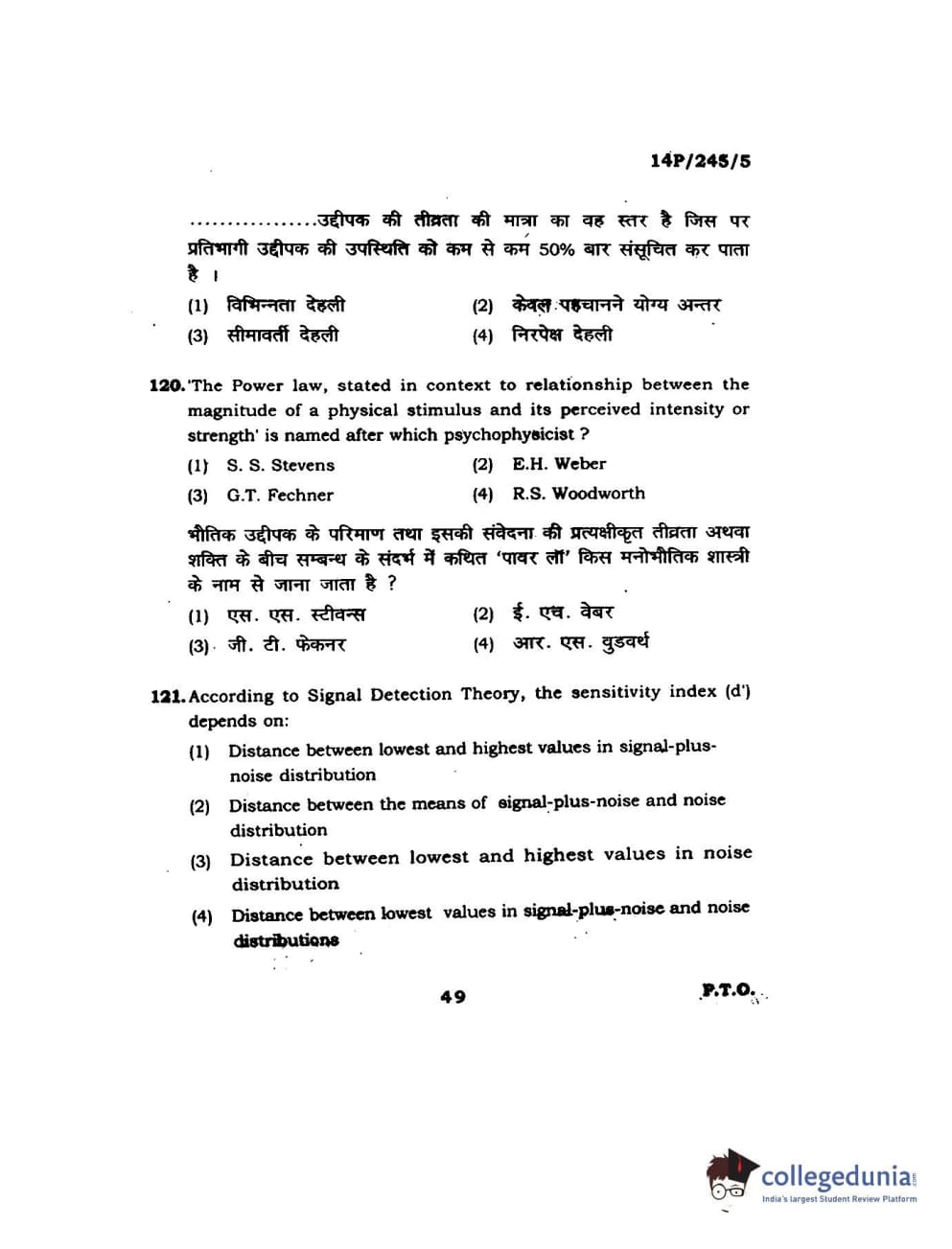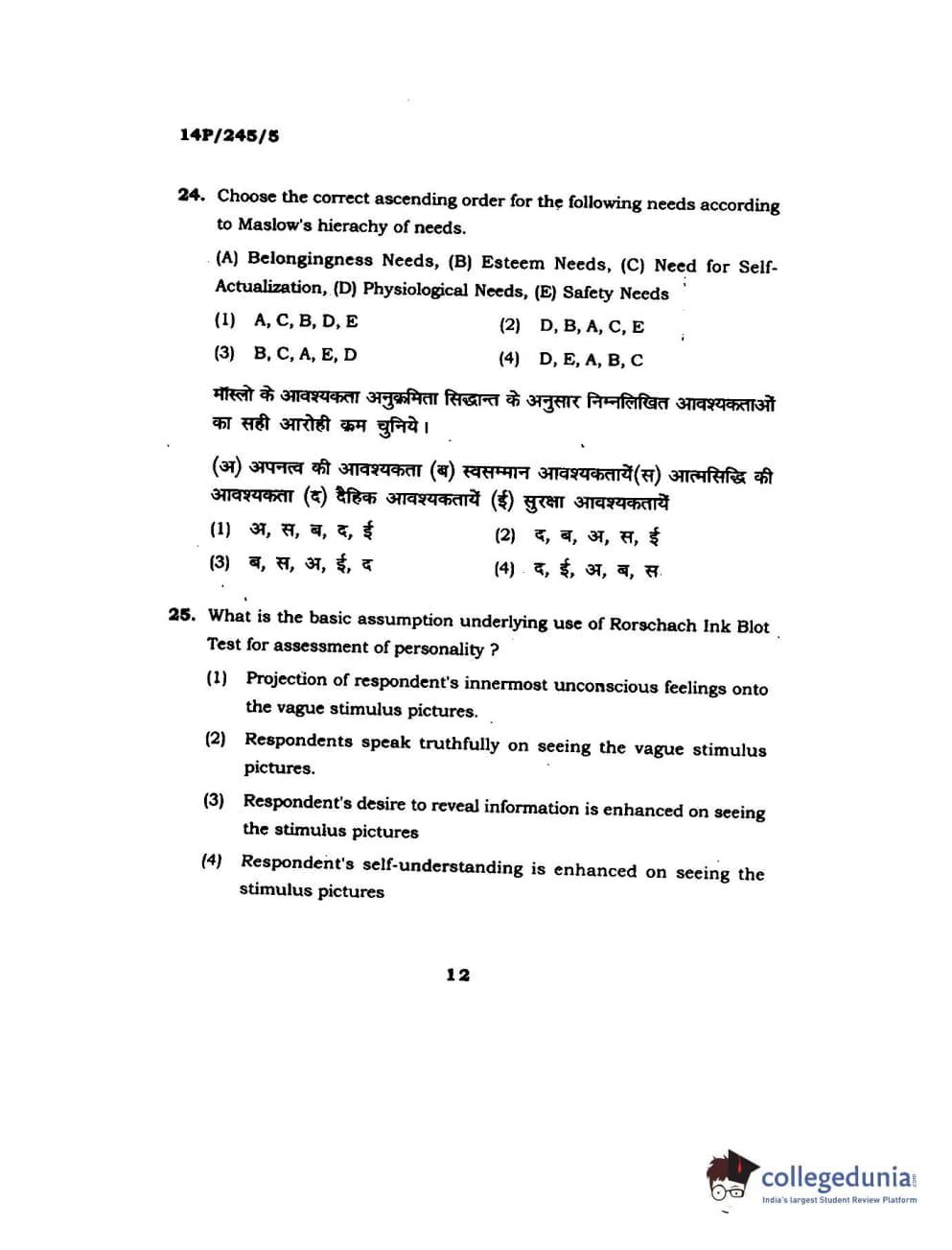 BHU PET 2014 MA Msc Psychology Question Paper with Answer Key PDFs