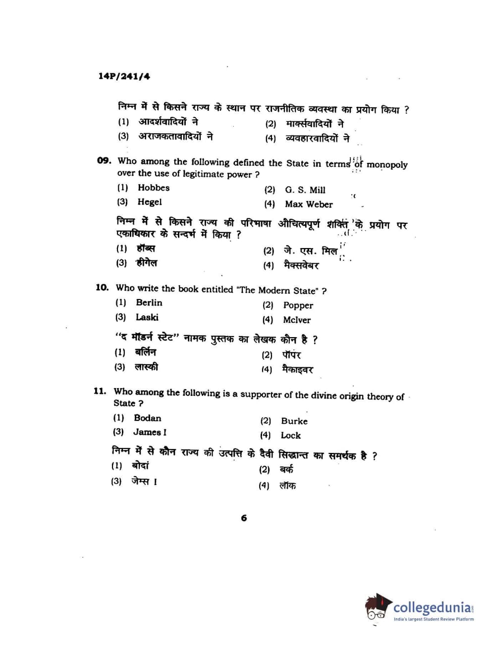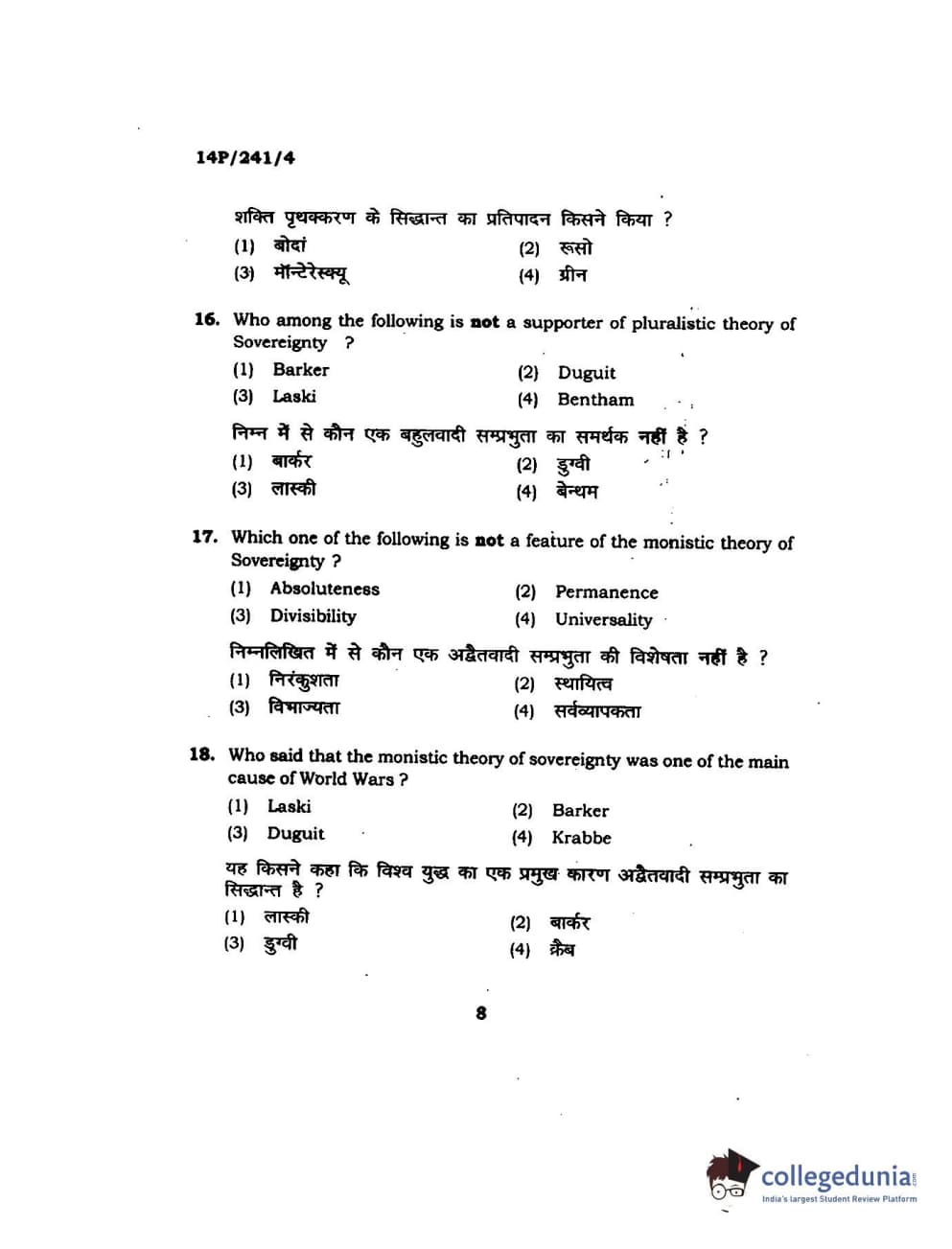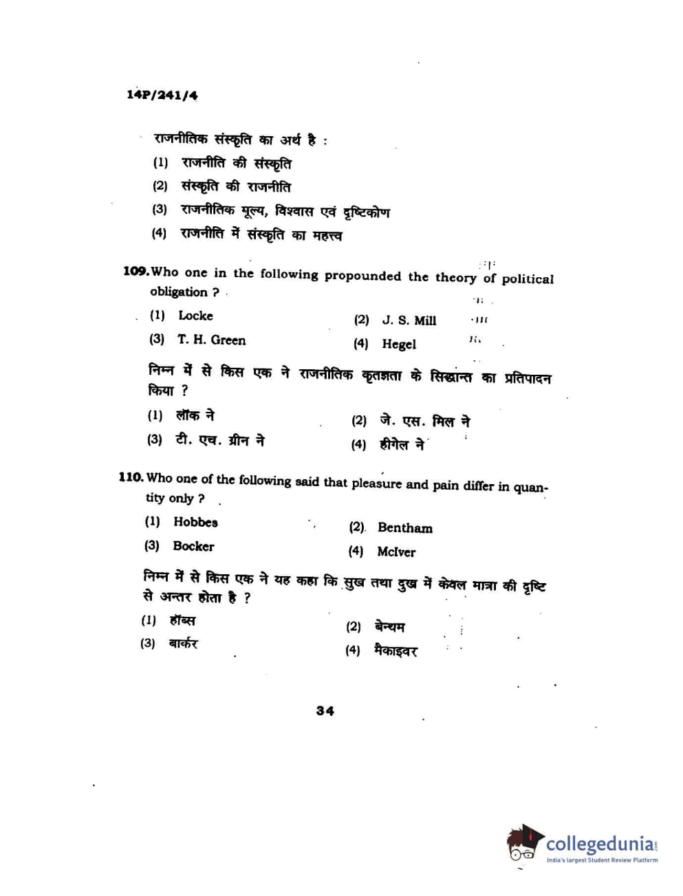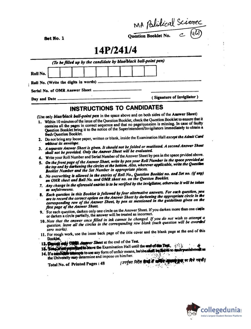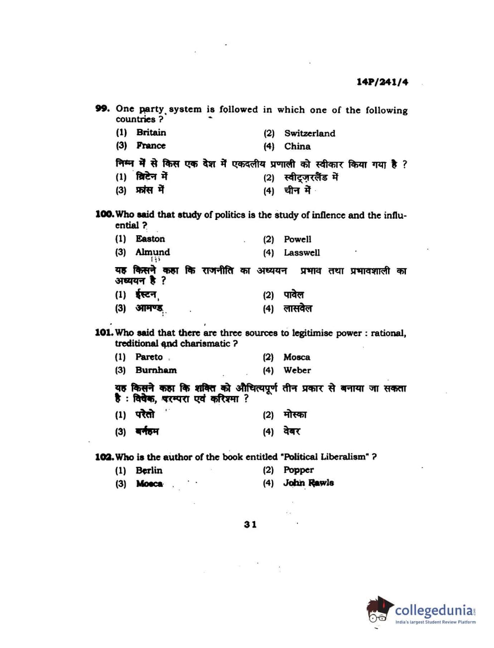 BHU PET 2014 M.A. Political Science Question Paper with Answer Key PDFs