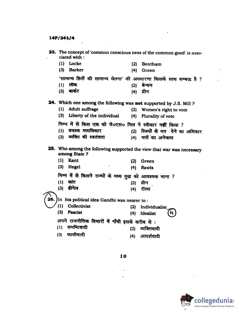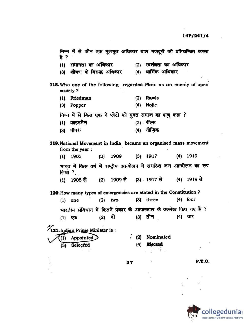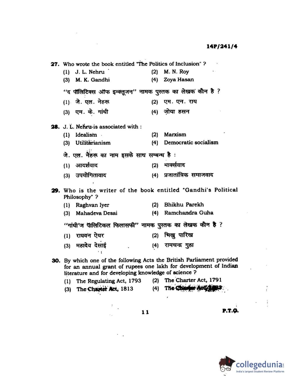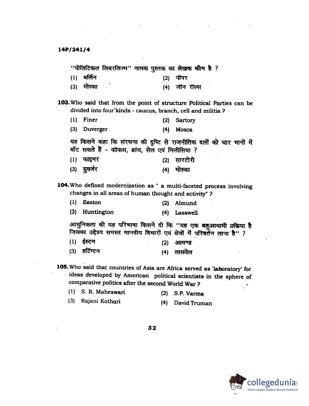 BHU PET 2014 M.A. Political Science Question Paper with Answer Key PDFs