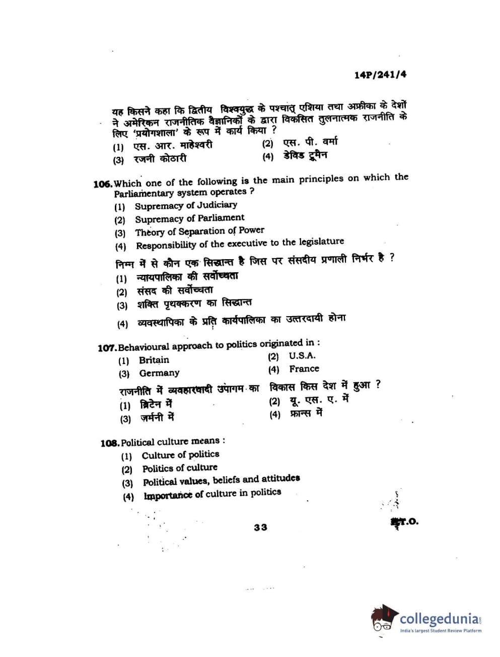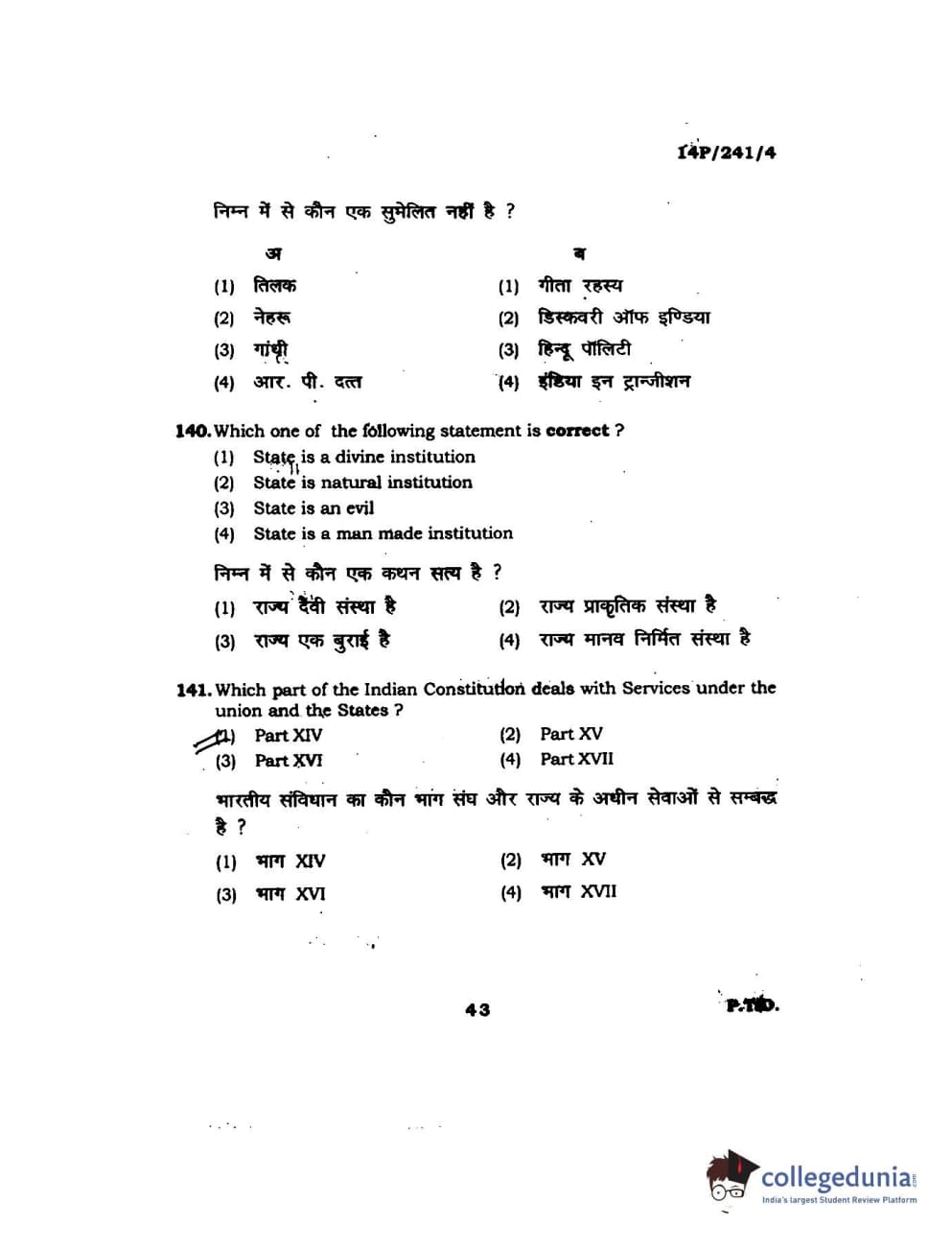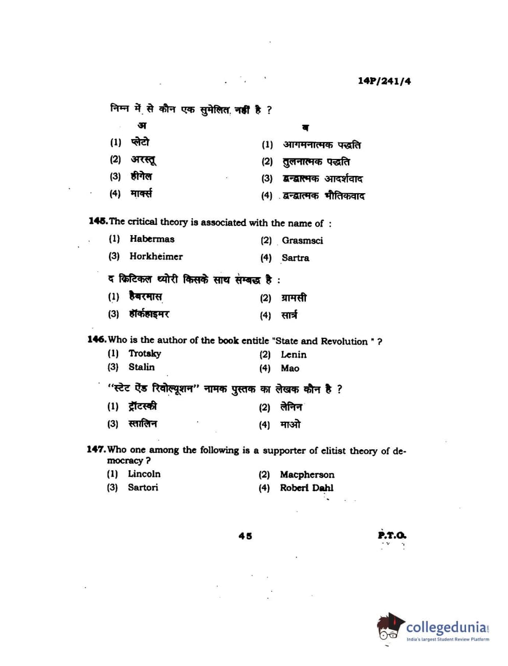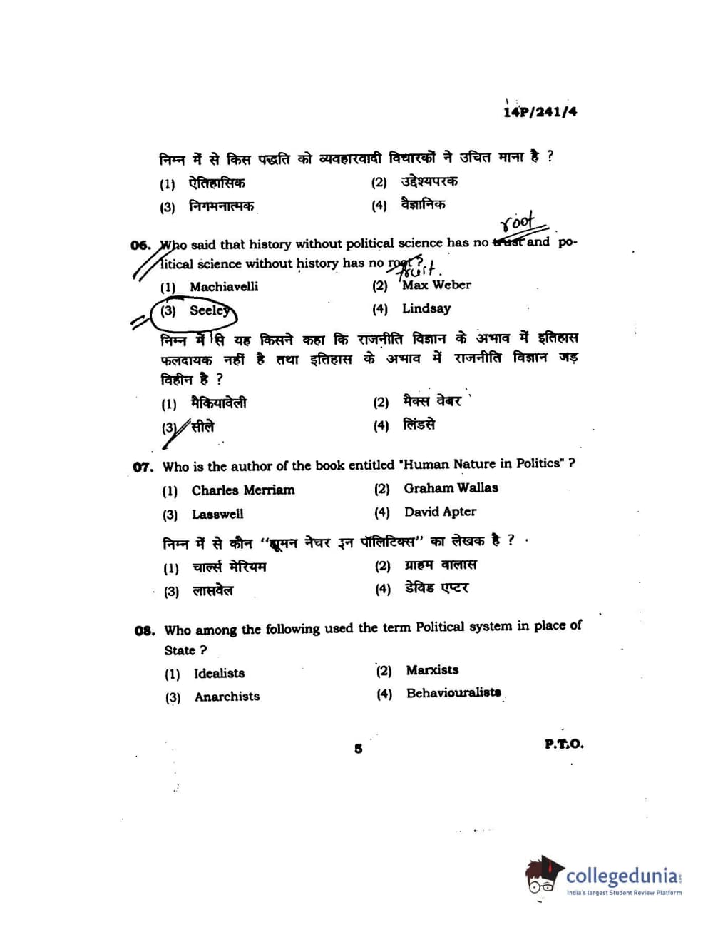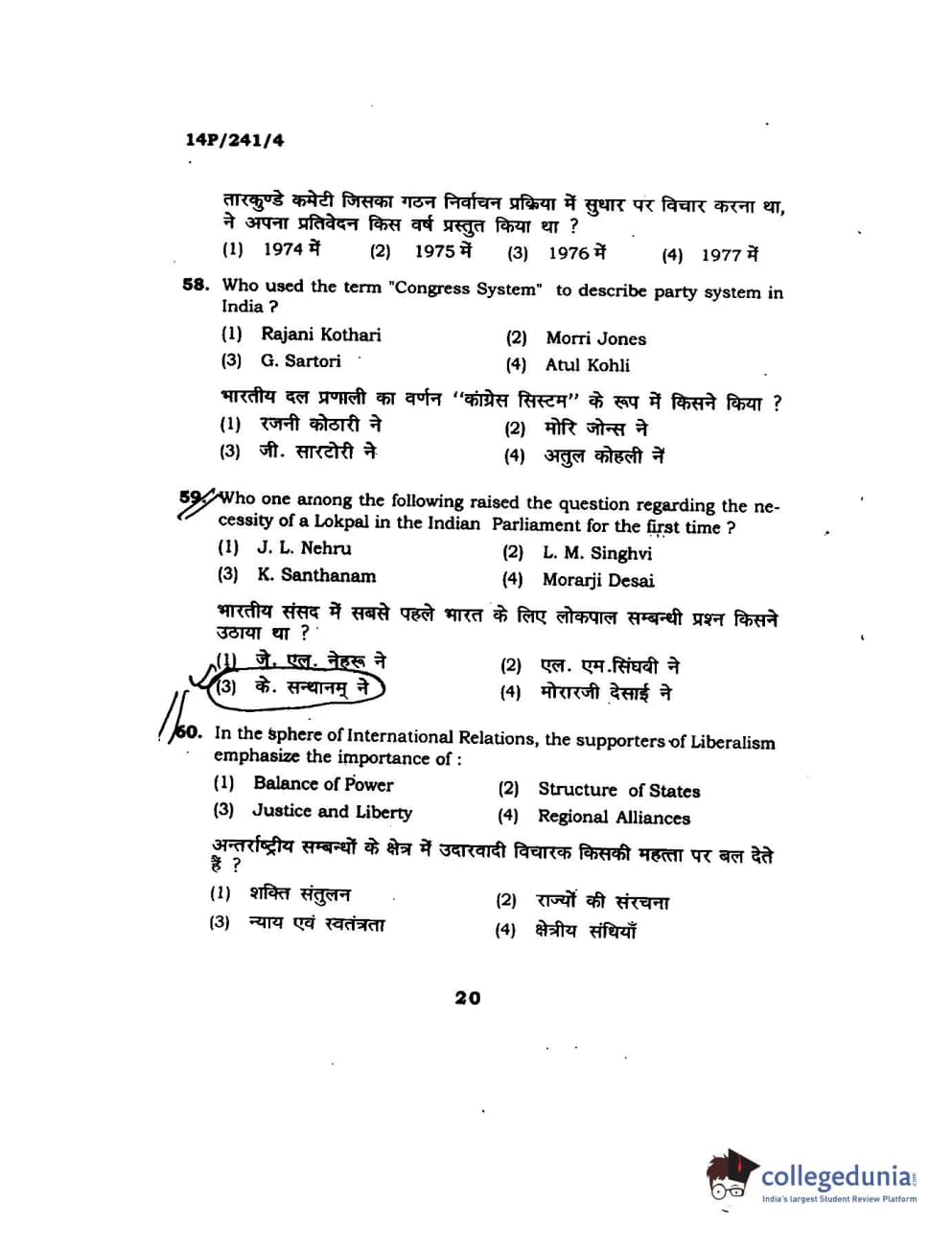 BHU PET 2014 M.A. Political Science Question Paper with Answer Key PDFs