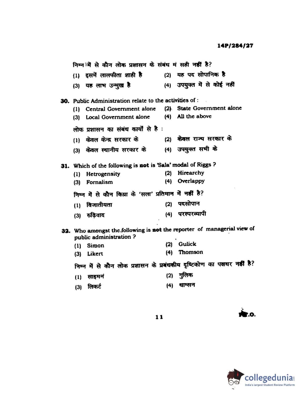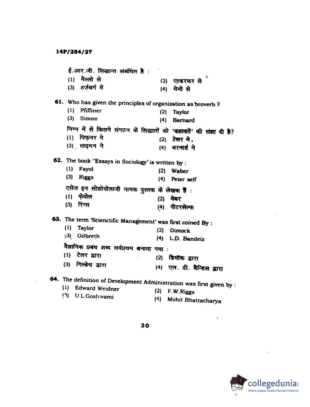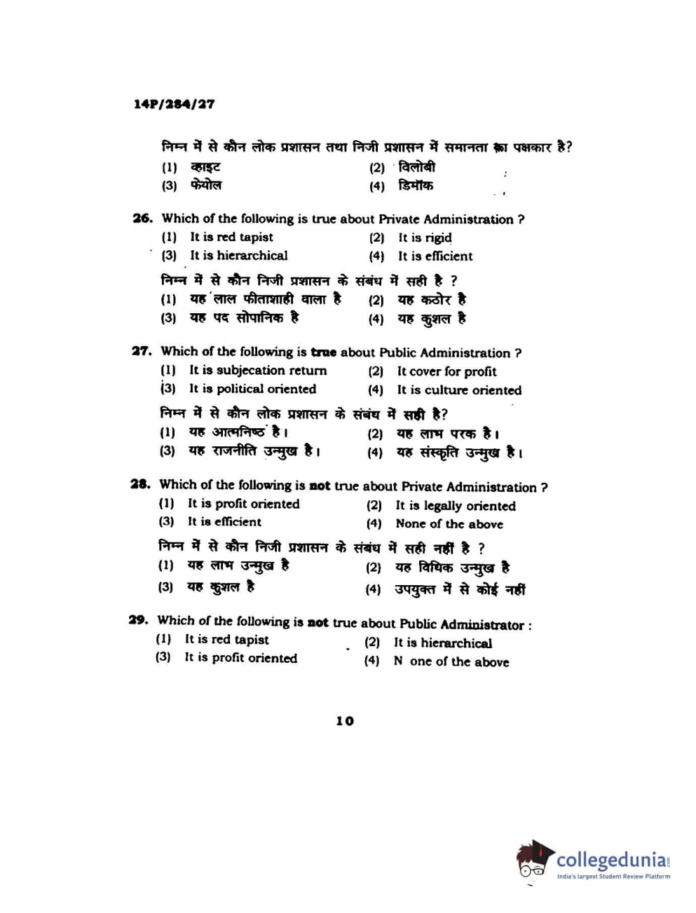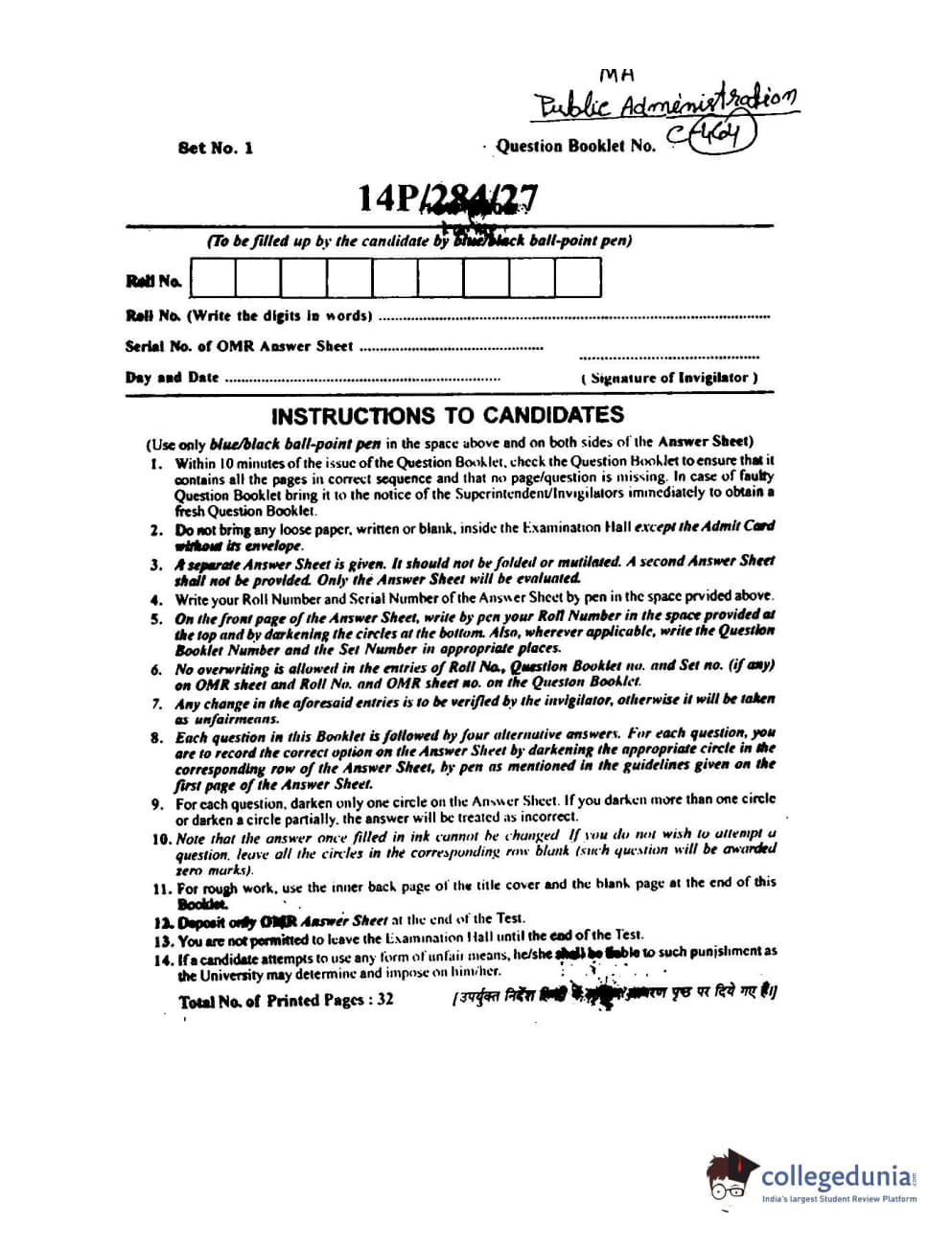 BHU PET 2014 M.A. Public Administration Question Paper with Answer Key PDFs
