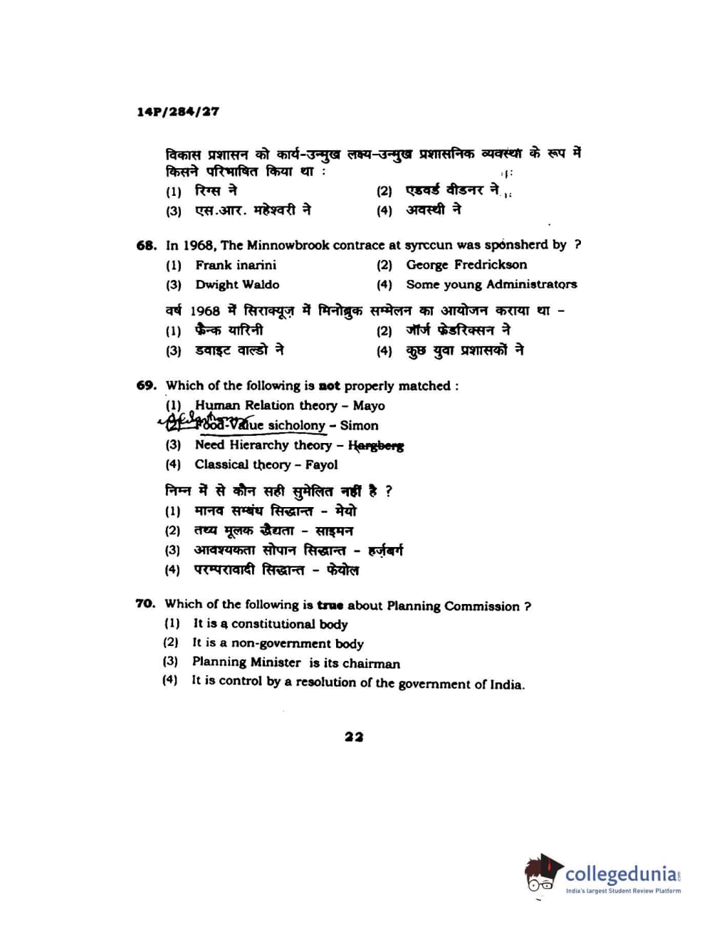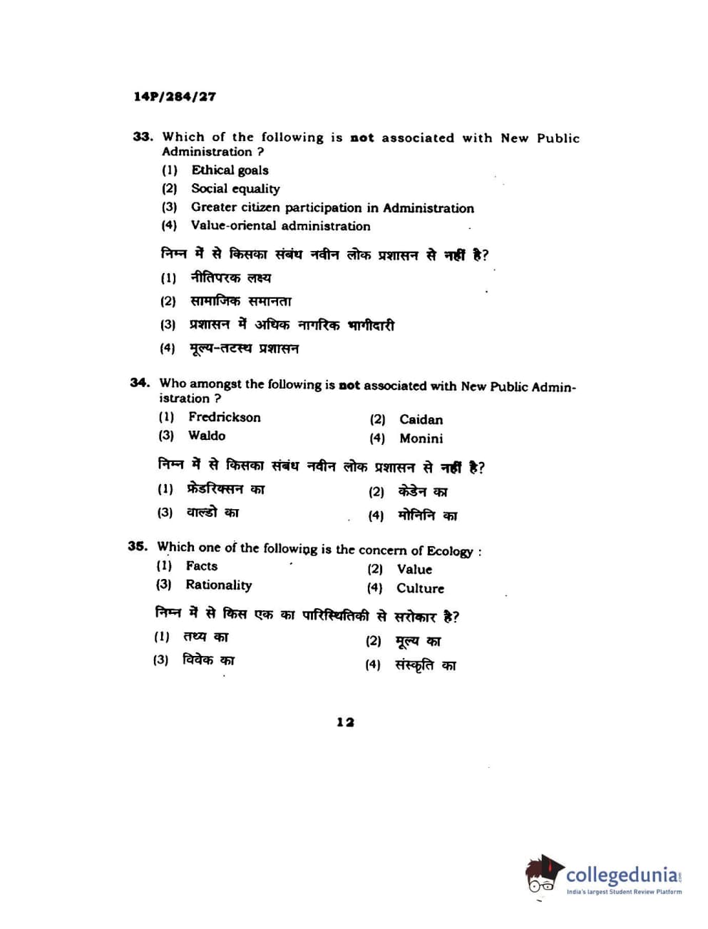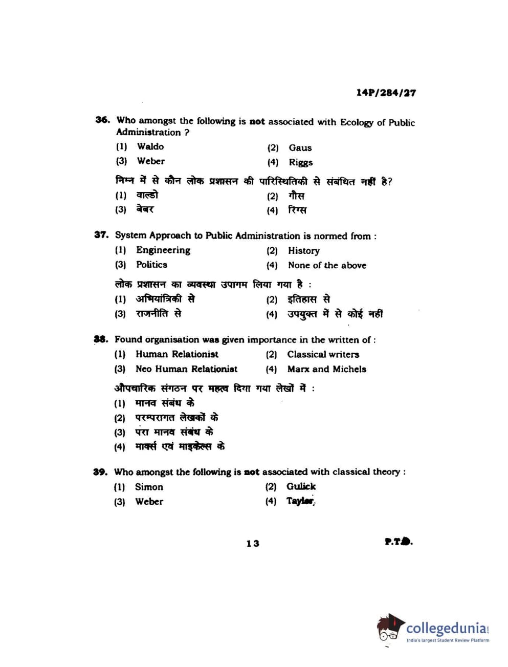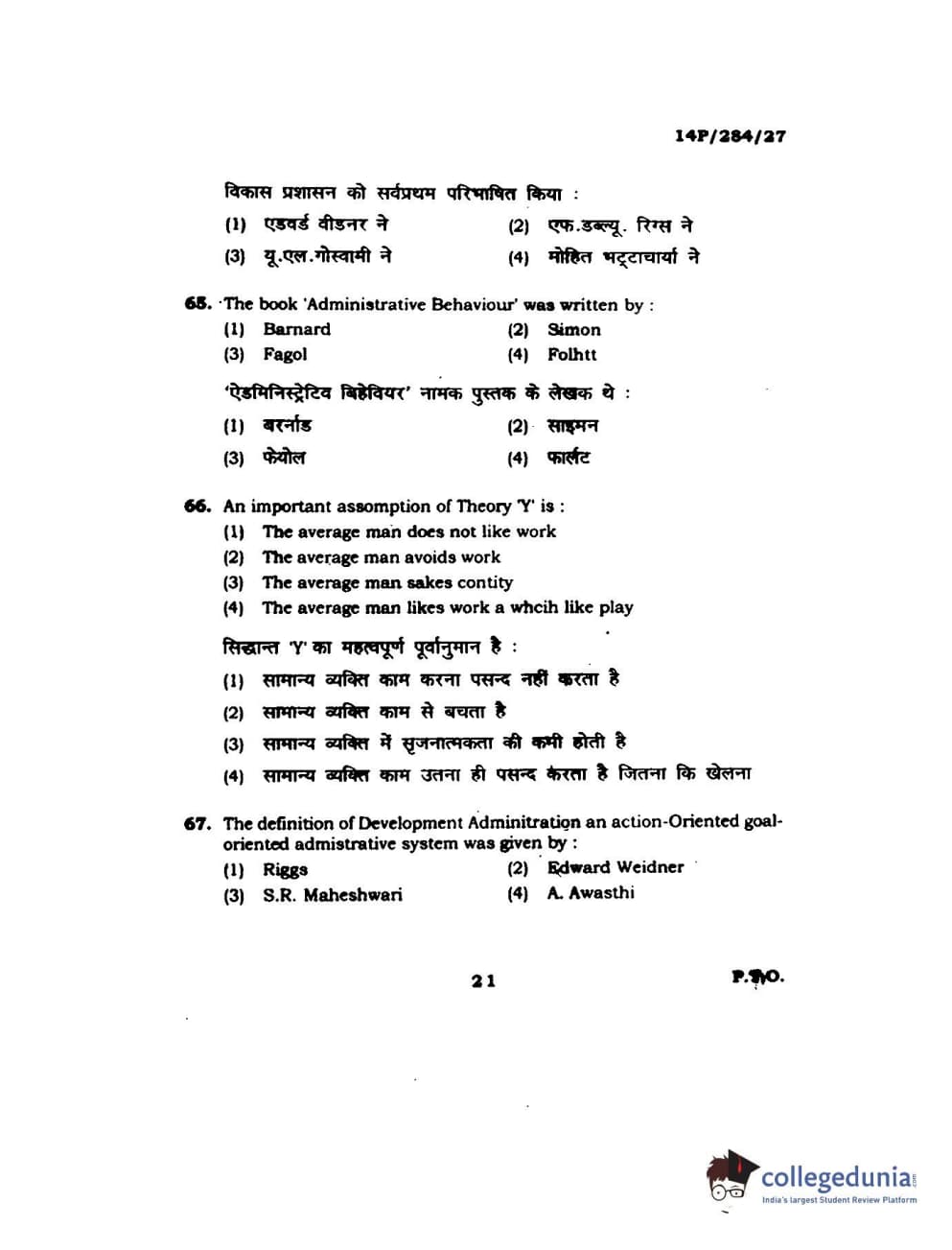 BHU PET 2014 M.A. Public Administration Question Paper with Answer Key PDFs