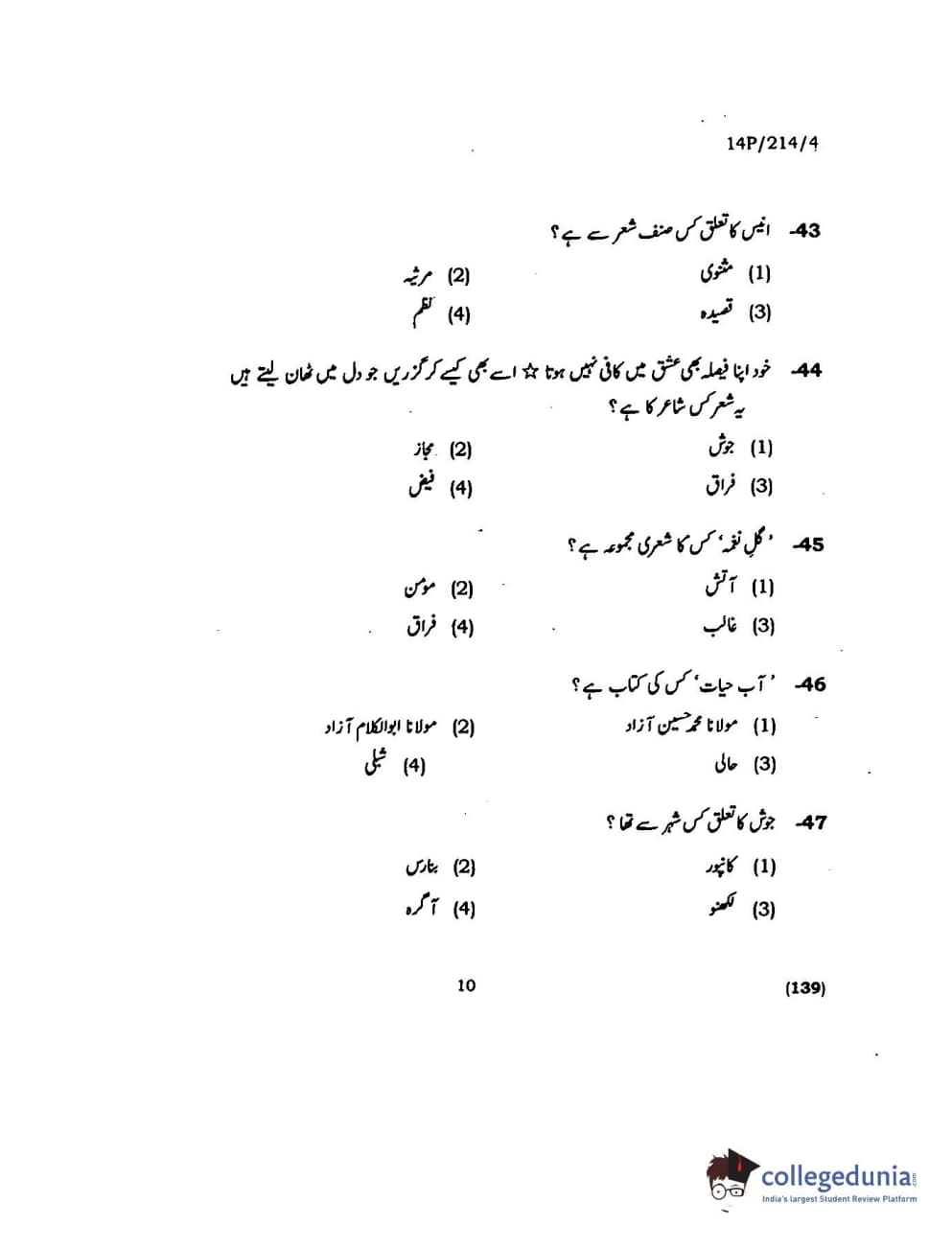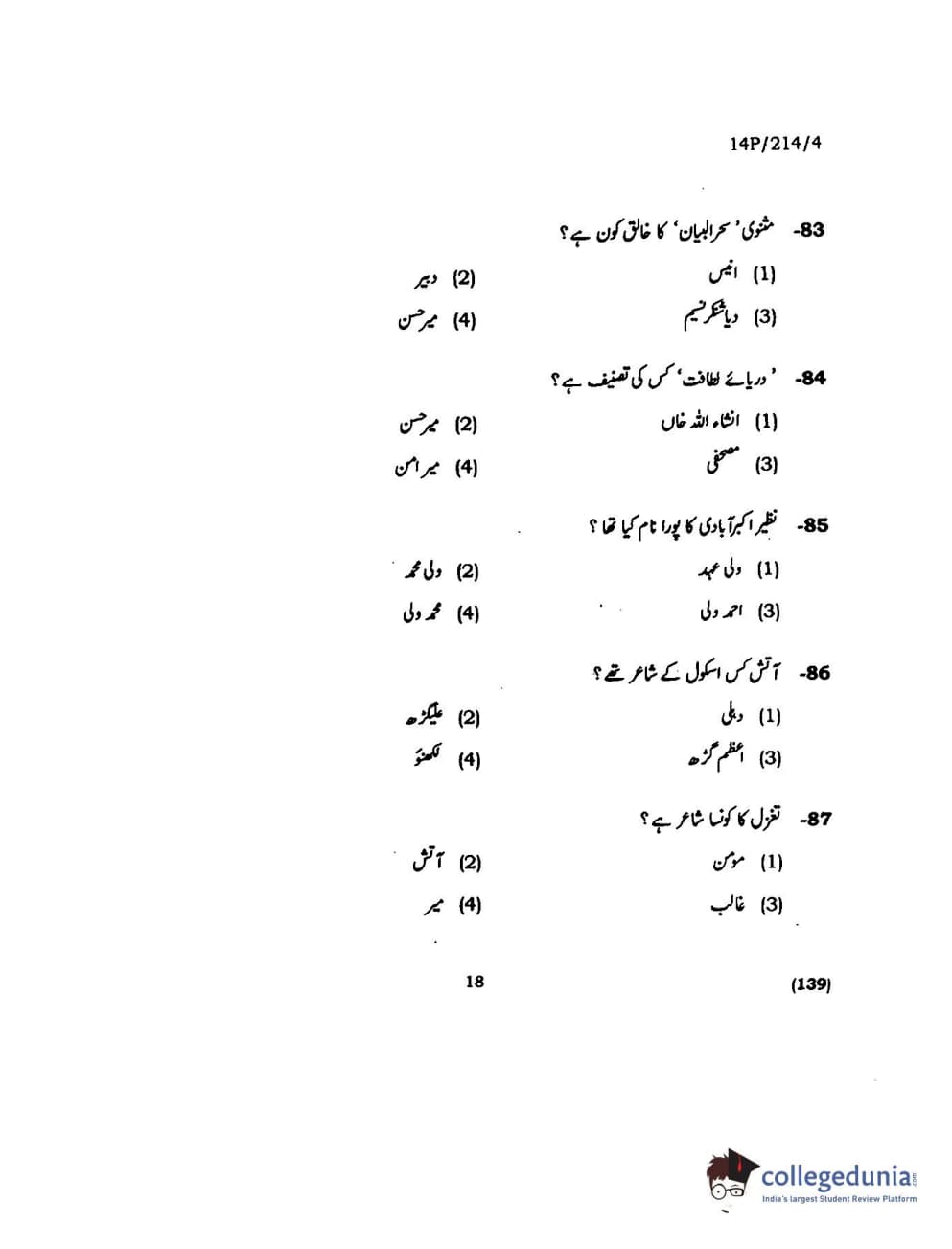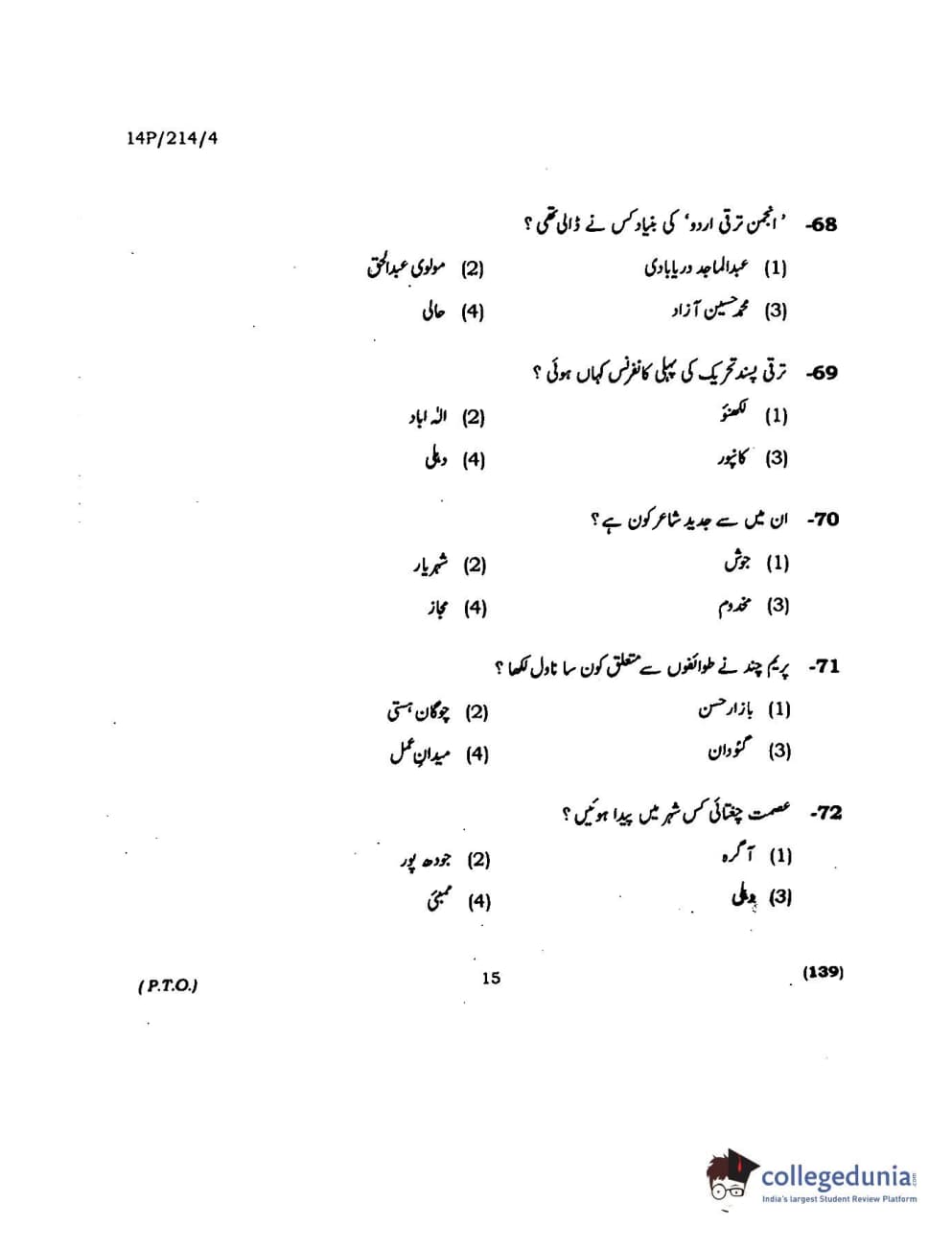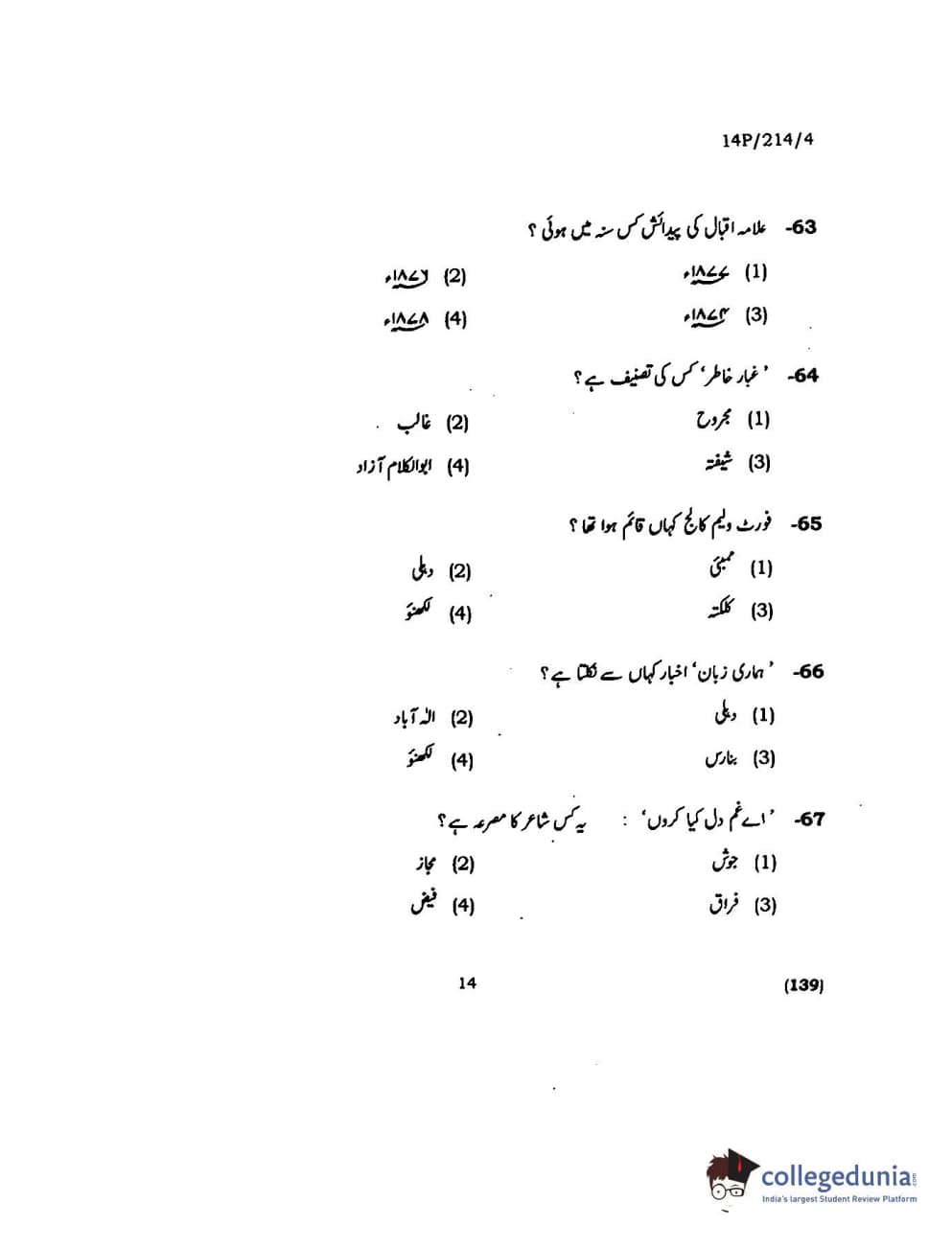 BHU PET 2014 M.A. Urdu Question Paper with Answer Key PDFs