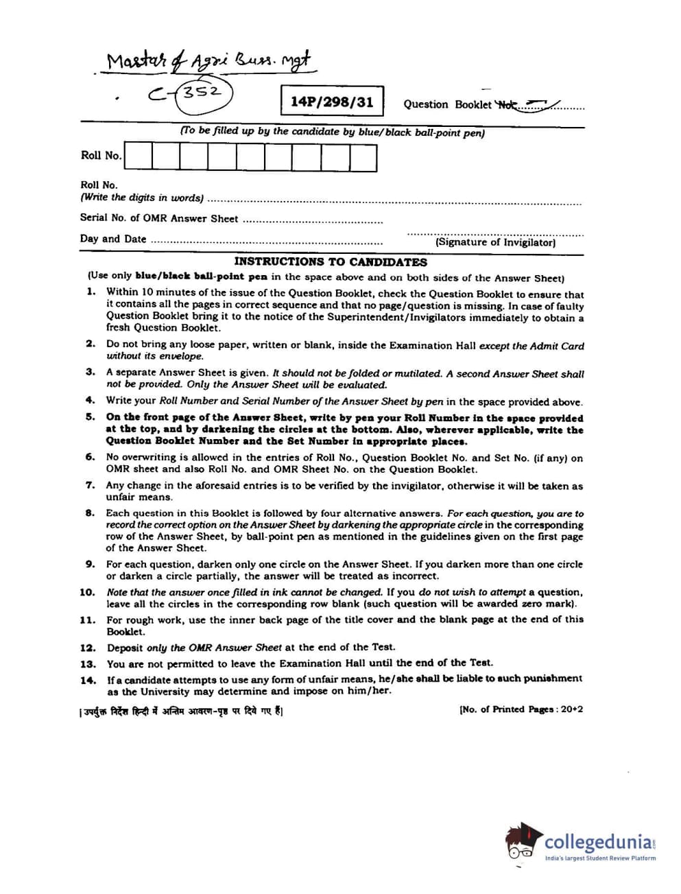BHU PET 2014 Master of AgriBussiness Maneagment Question Paper with Answer Key PDFs