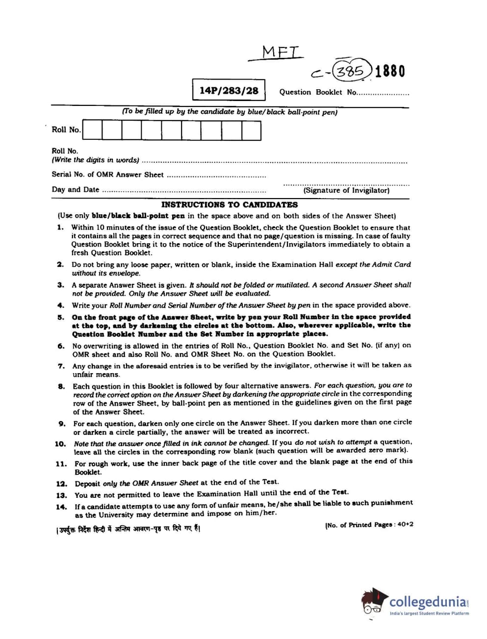BHU PET 2014 M.F.M.R.I MFM, MFT. Question paper with answer key pdf is available for download. The exam was successfully organized by Banaras Hindu University (BHU). The question paper comprised a total of 150 questions.