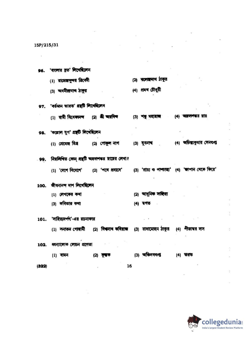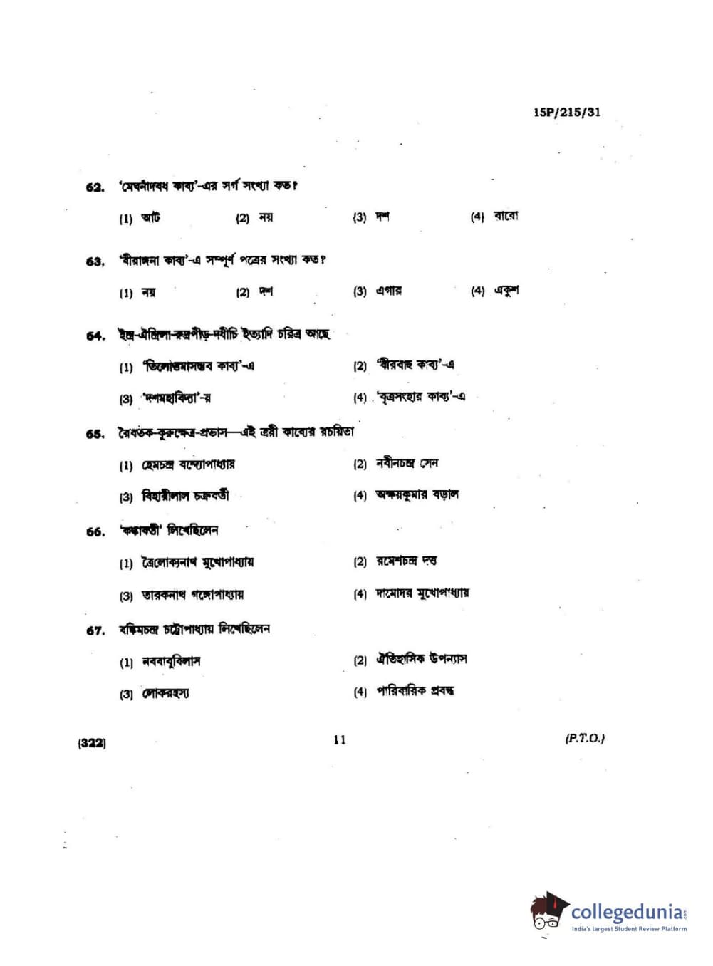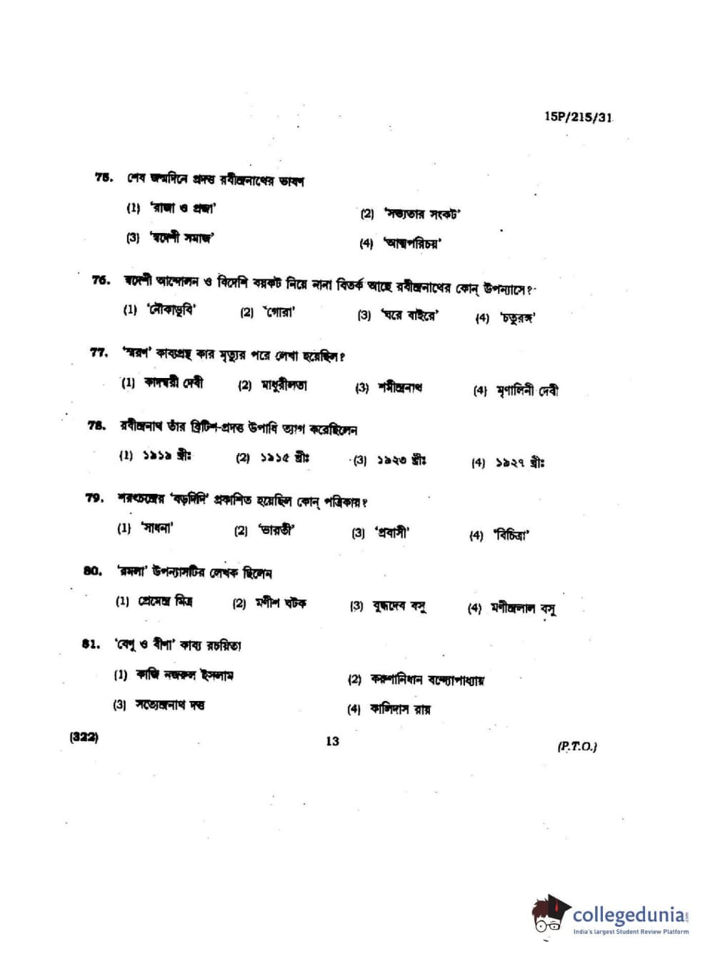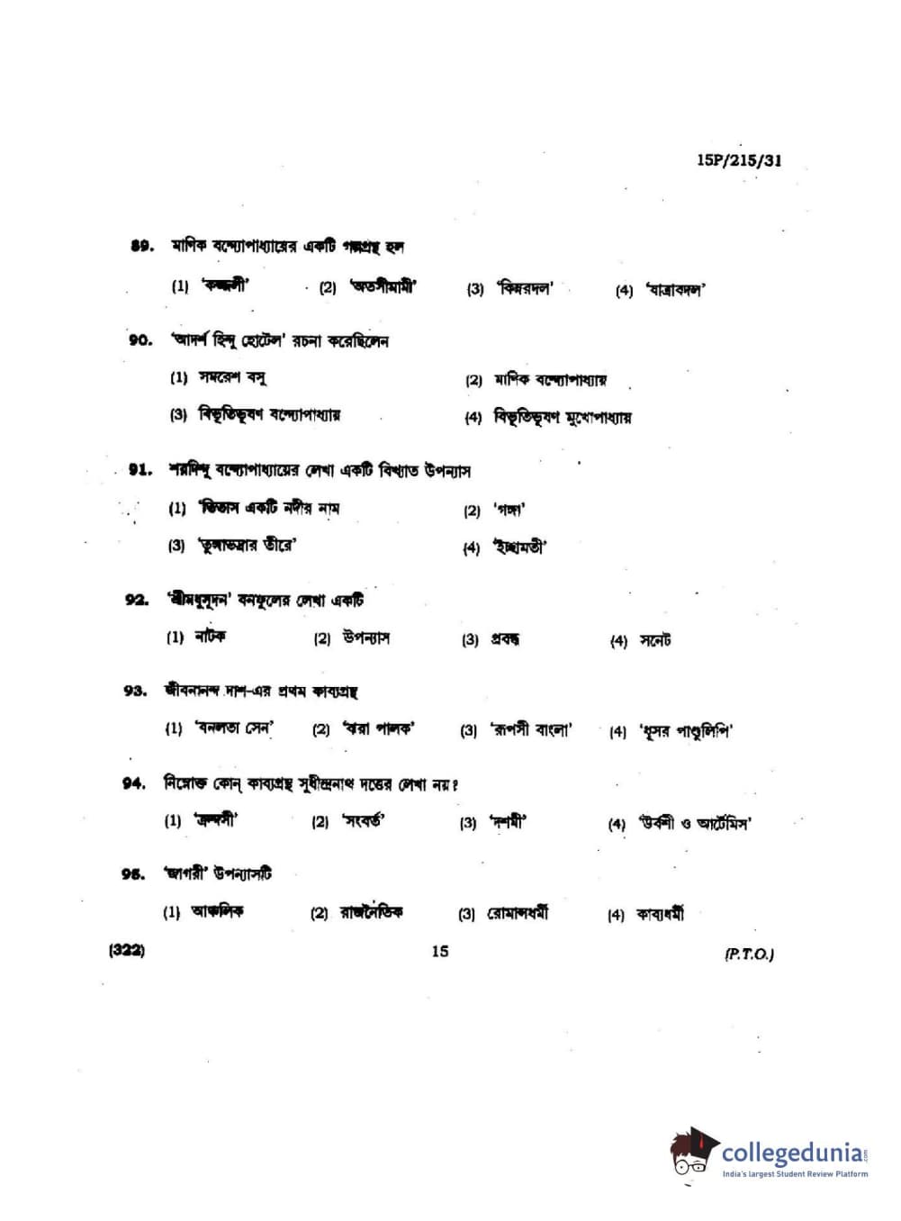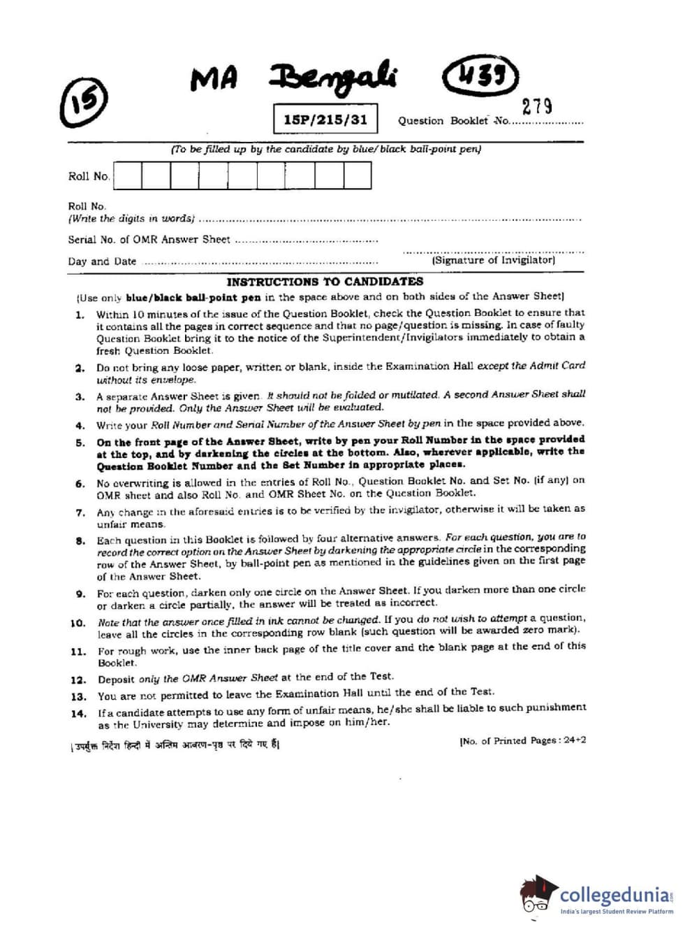 BHU PET 2015 M.A. Bengali Question Paper with Answer Key PDFs