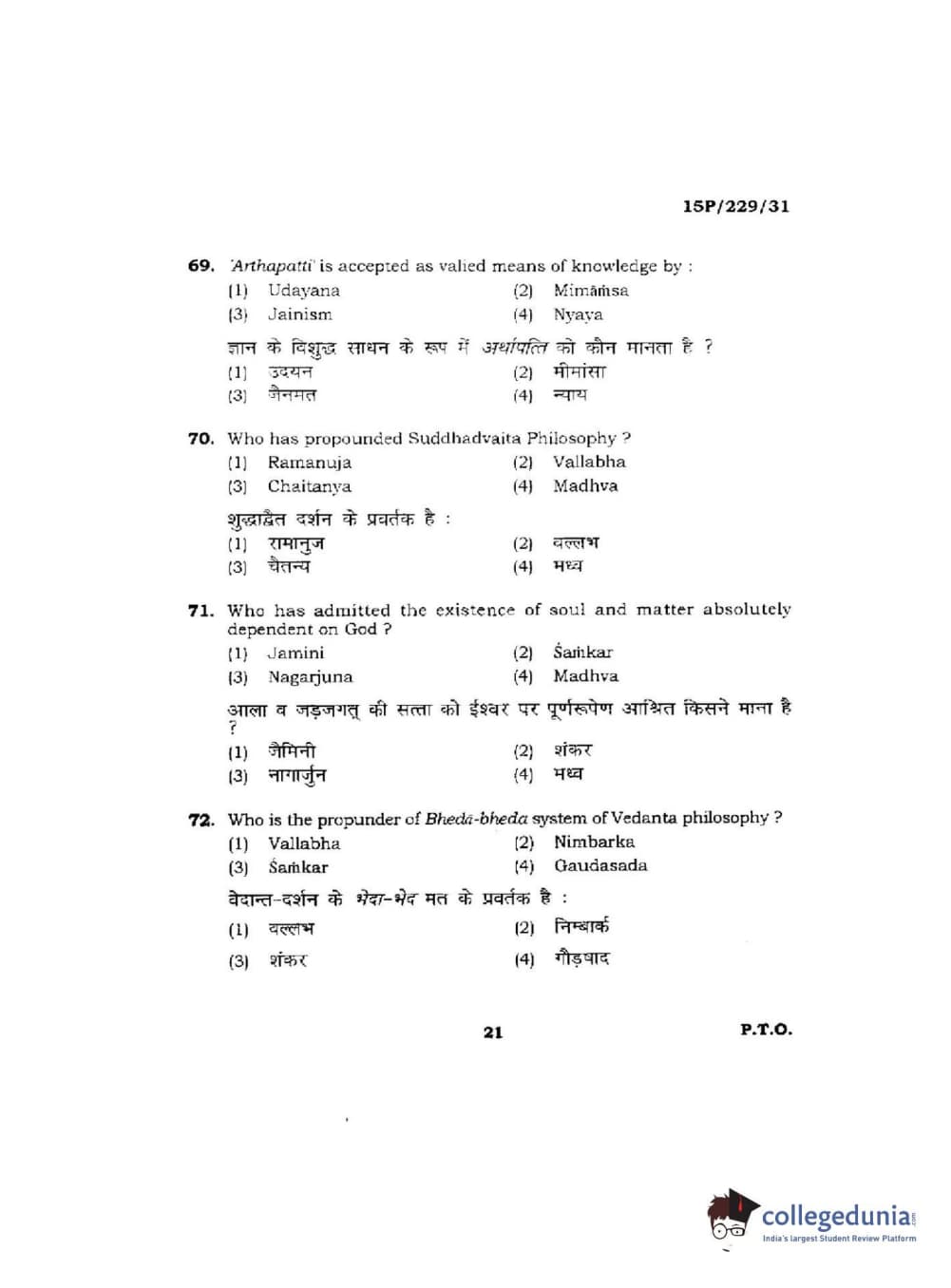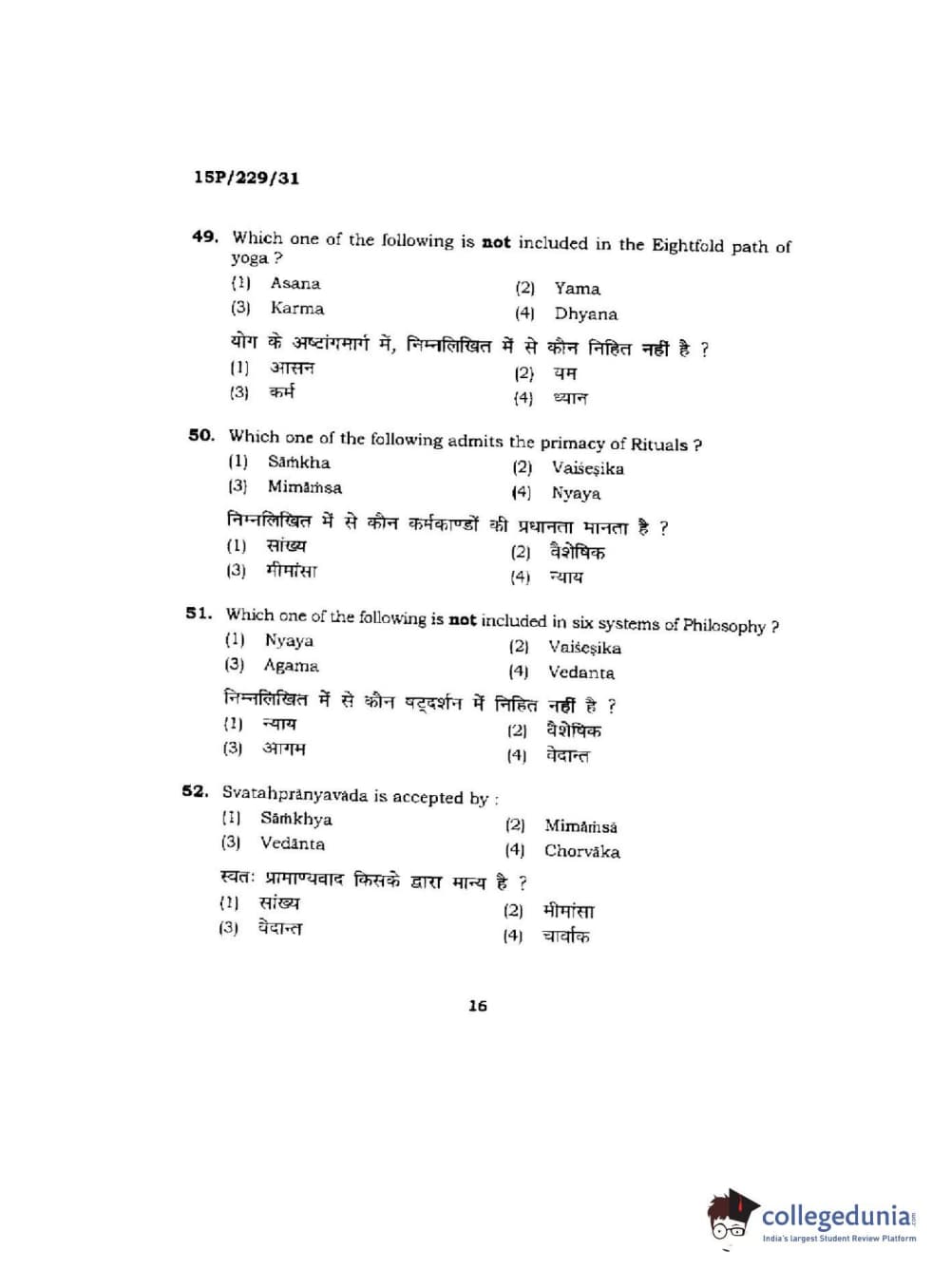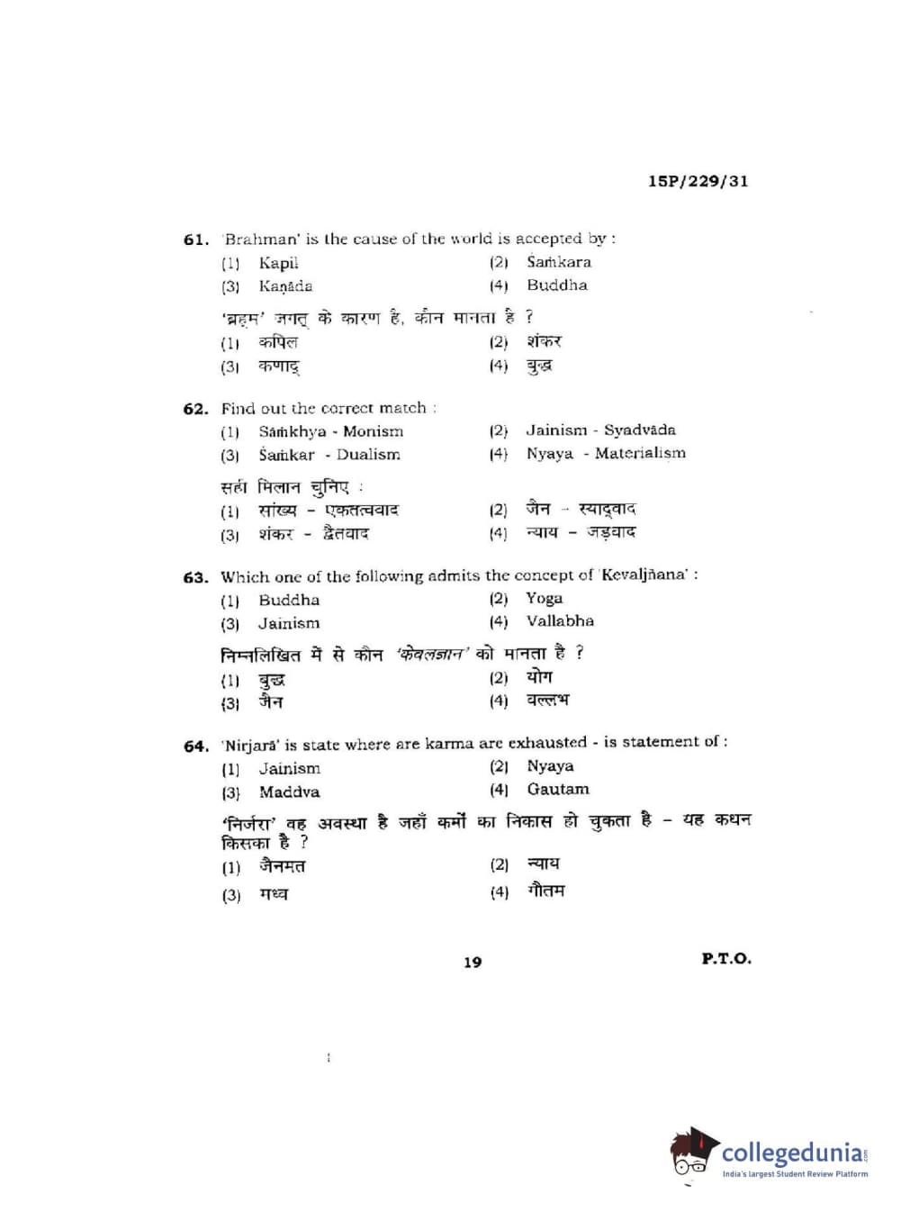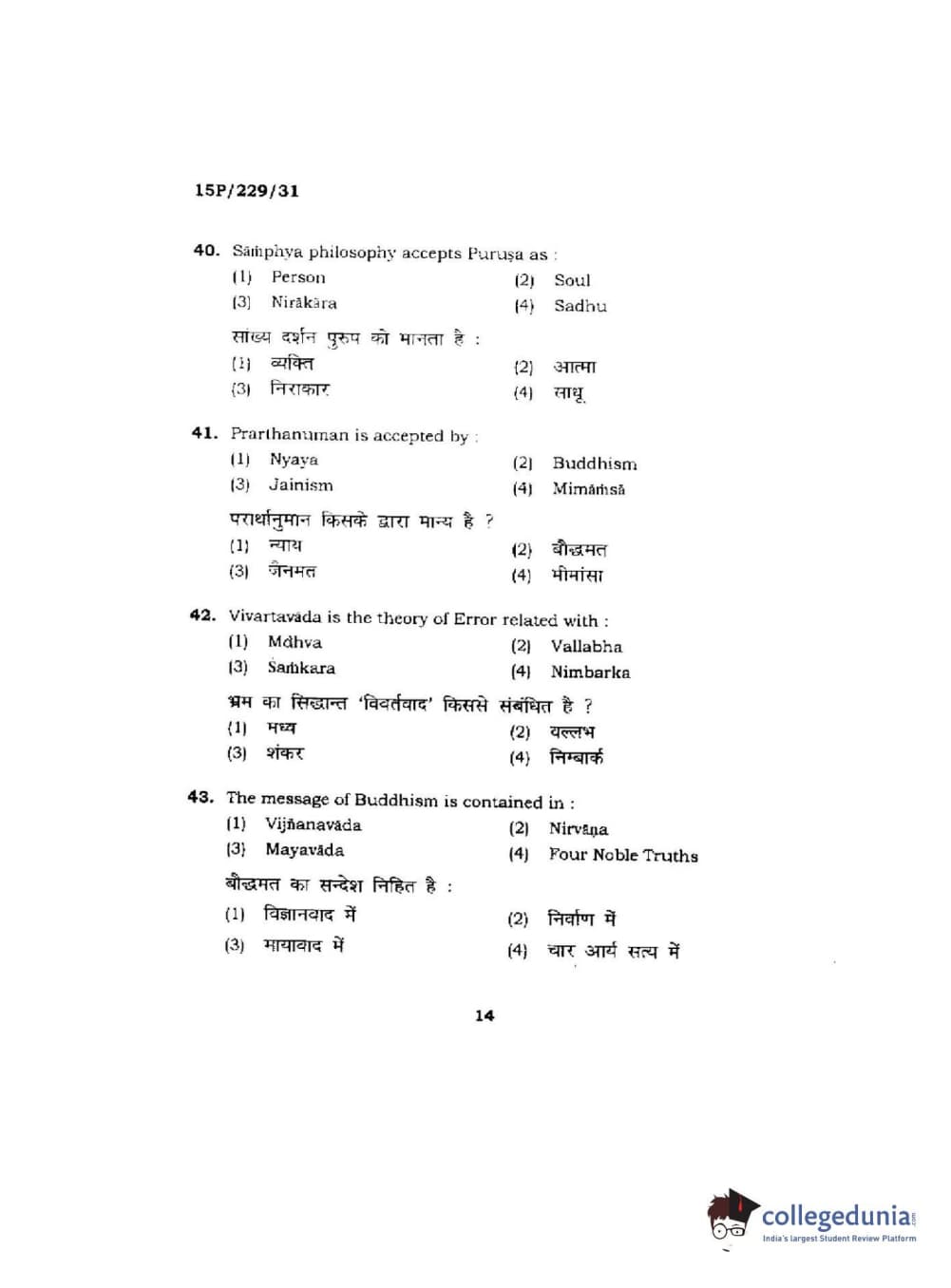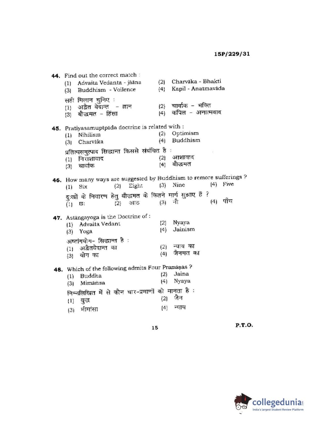 BHU PET 2015 M.A Indian Philosophy & Religion Question Paper with Answer Key PDFs