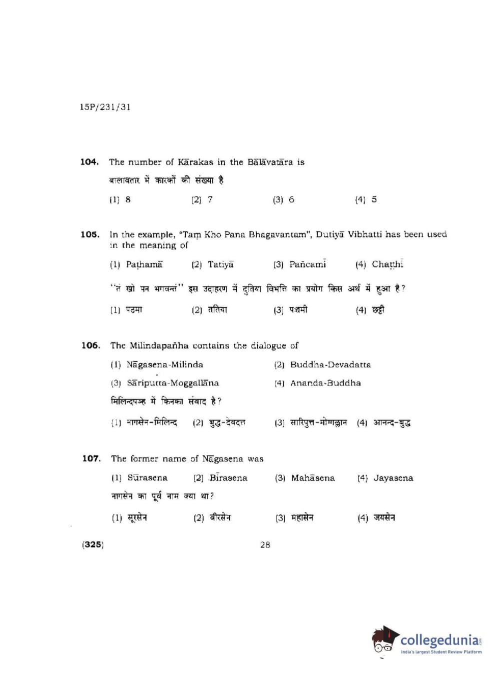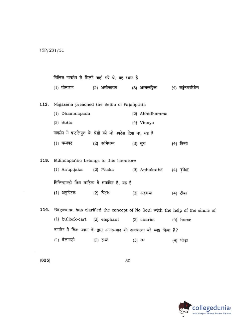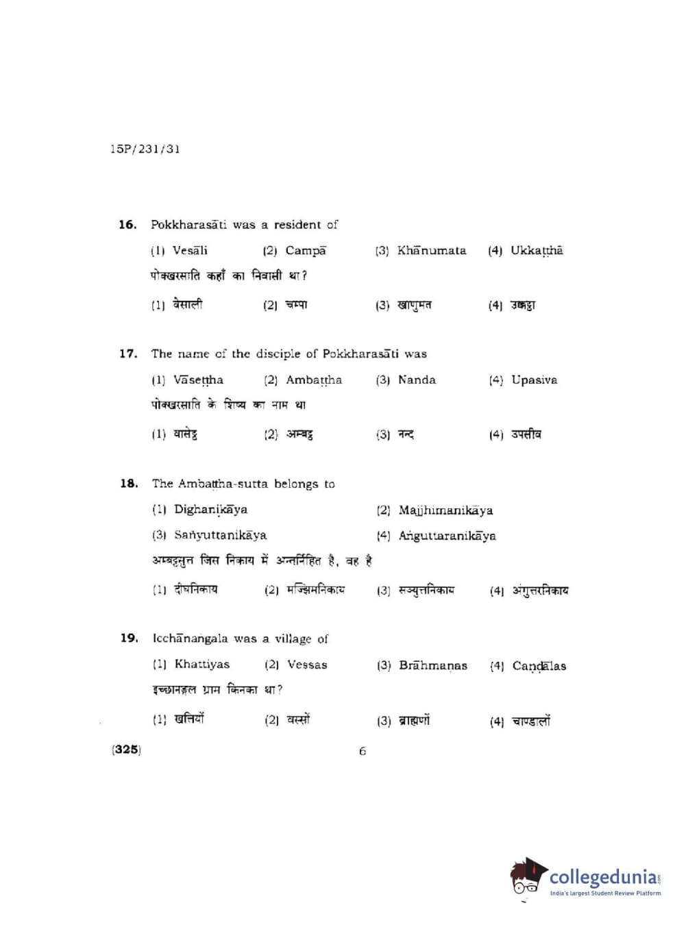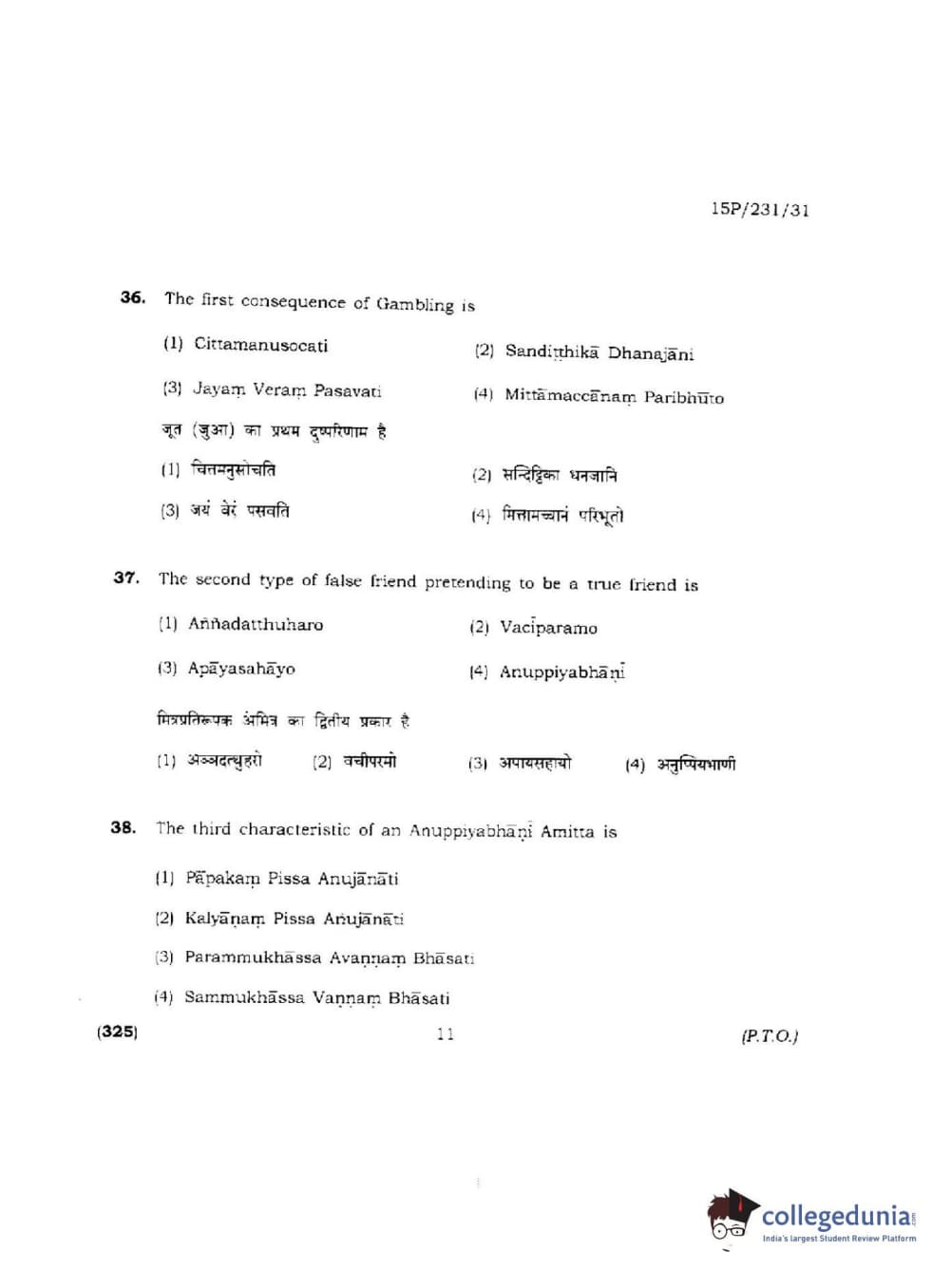 BHU PET 2015 M.A.Pali Question Paper with Answer Key PDFs
