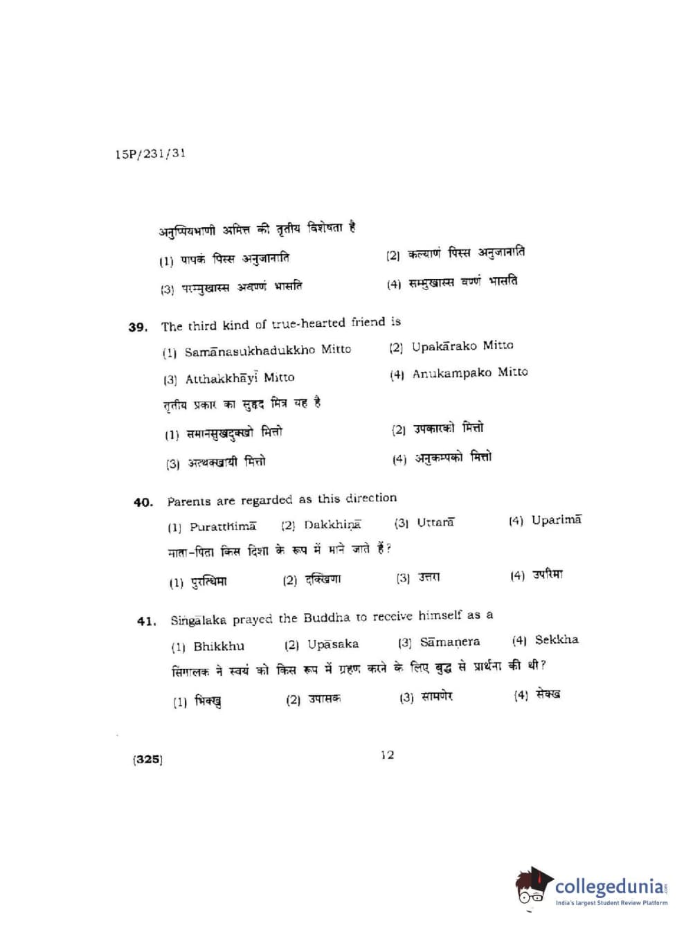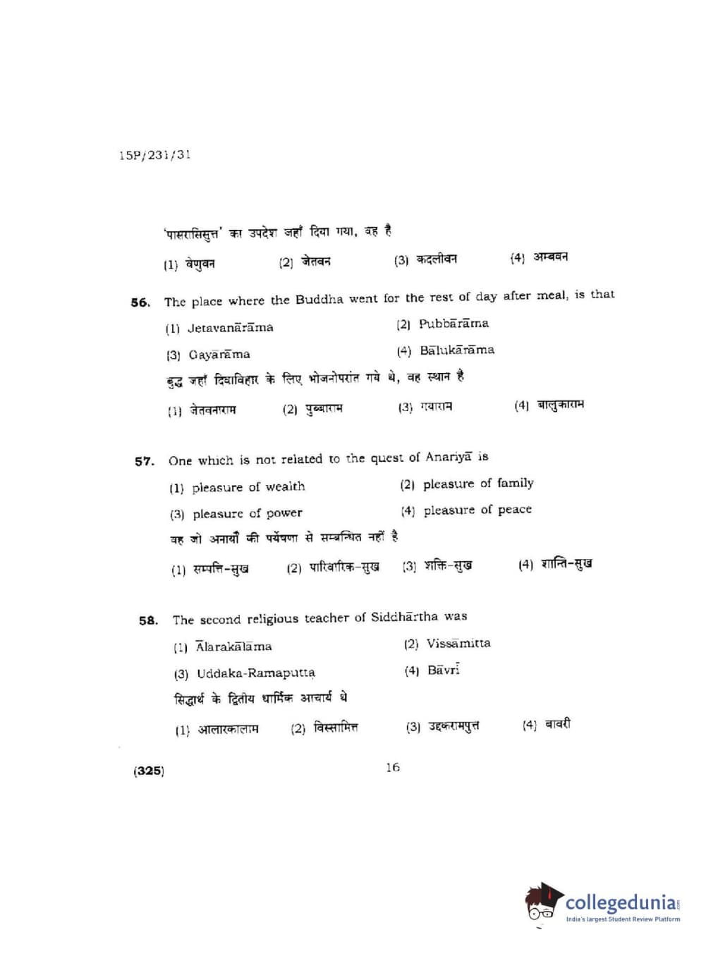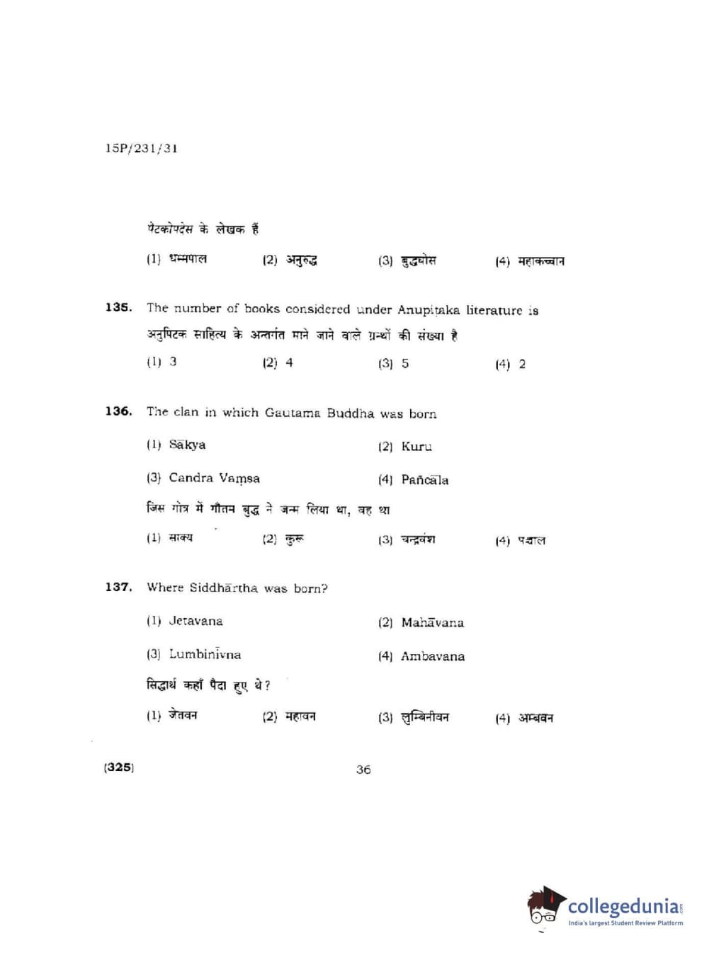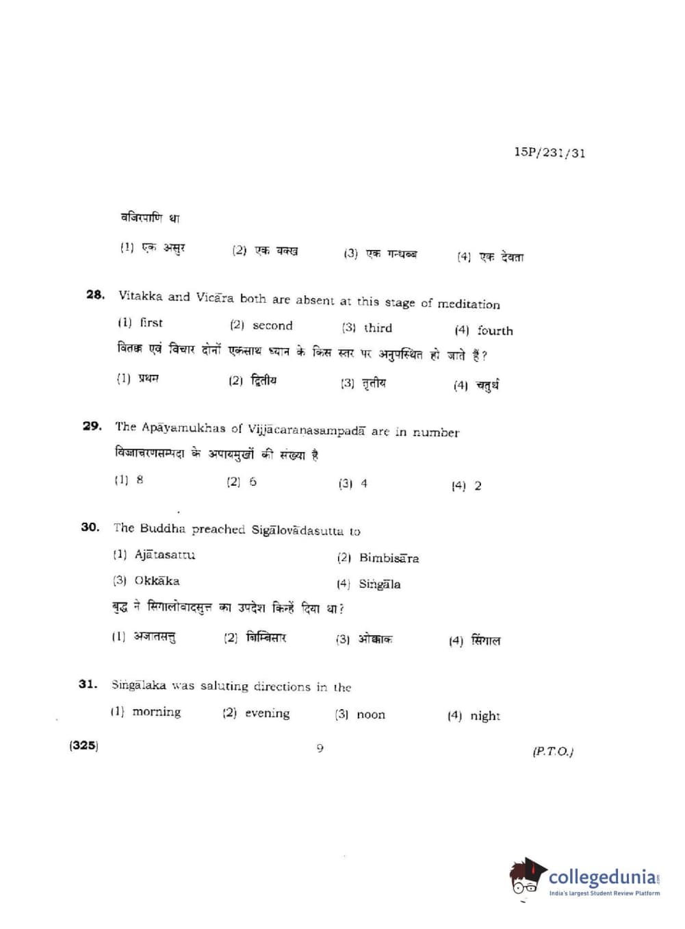 BHU PET 2015 M.A.Pali Question Paper with Answer Key PDFs
