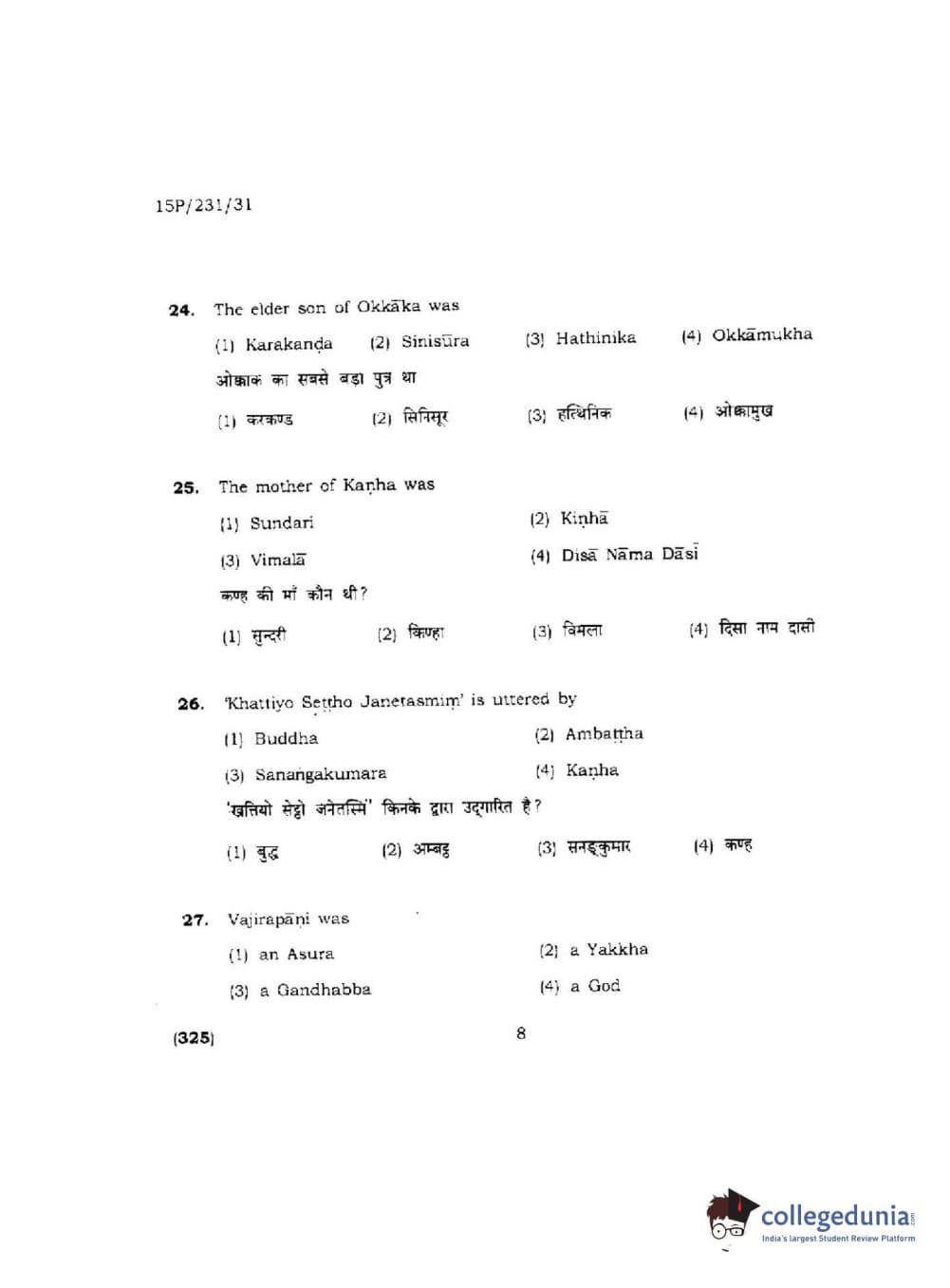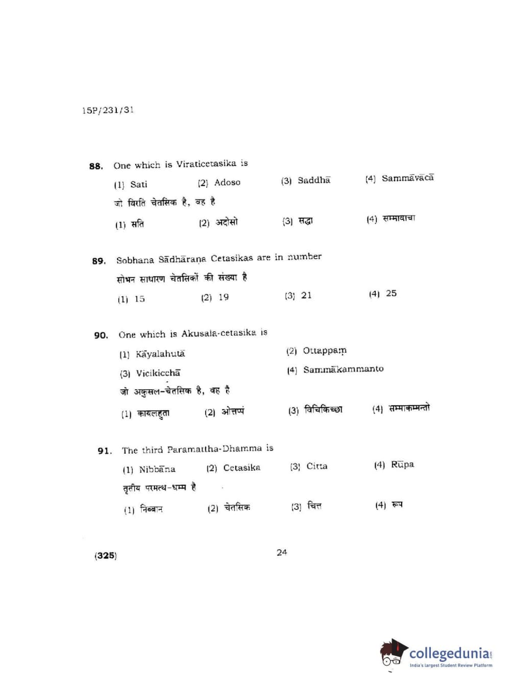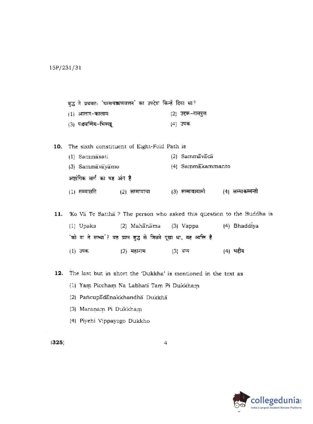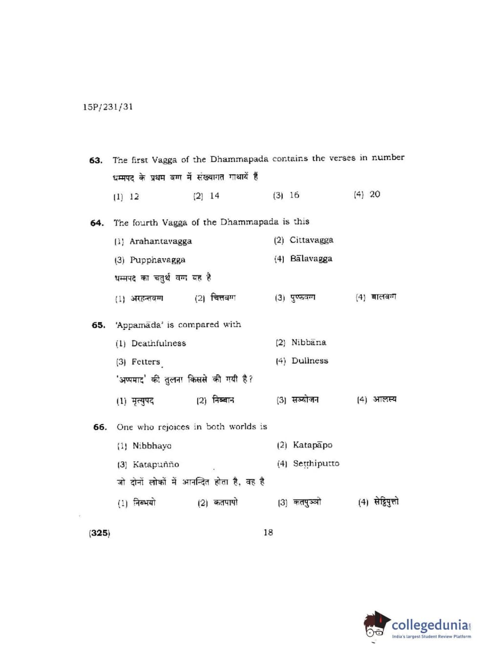 BHU PET 2015 M.A.Pali Question Paper with Answer Key PDFs