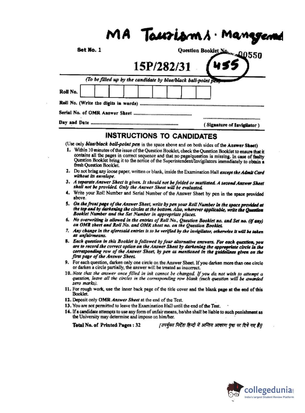 BHU PET 2015 M.A Tourism & Management Question paper with answer key pdf is available for download. The exam was successfully organized by Banaras Hindu University (BHU). The question paper comprised a total of 100 questions.