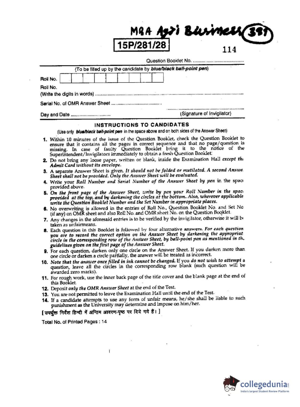 BHU PET 2015 MBA - AgriBusiness Question paper with answer key pdf is available for download. The exam was successfully organized by Banaras Hindu University (BHU). The question paper comprised a total of 100 questions.