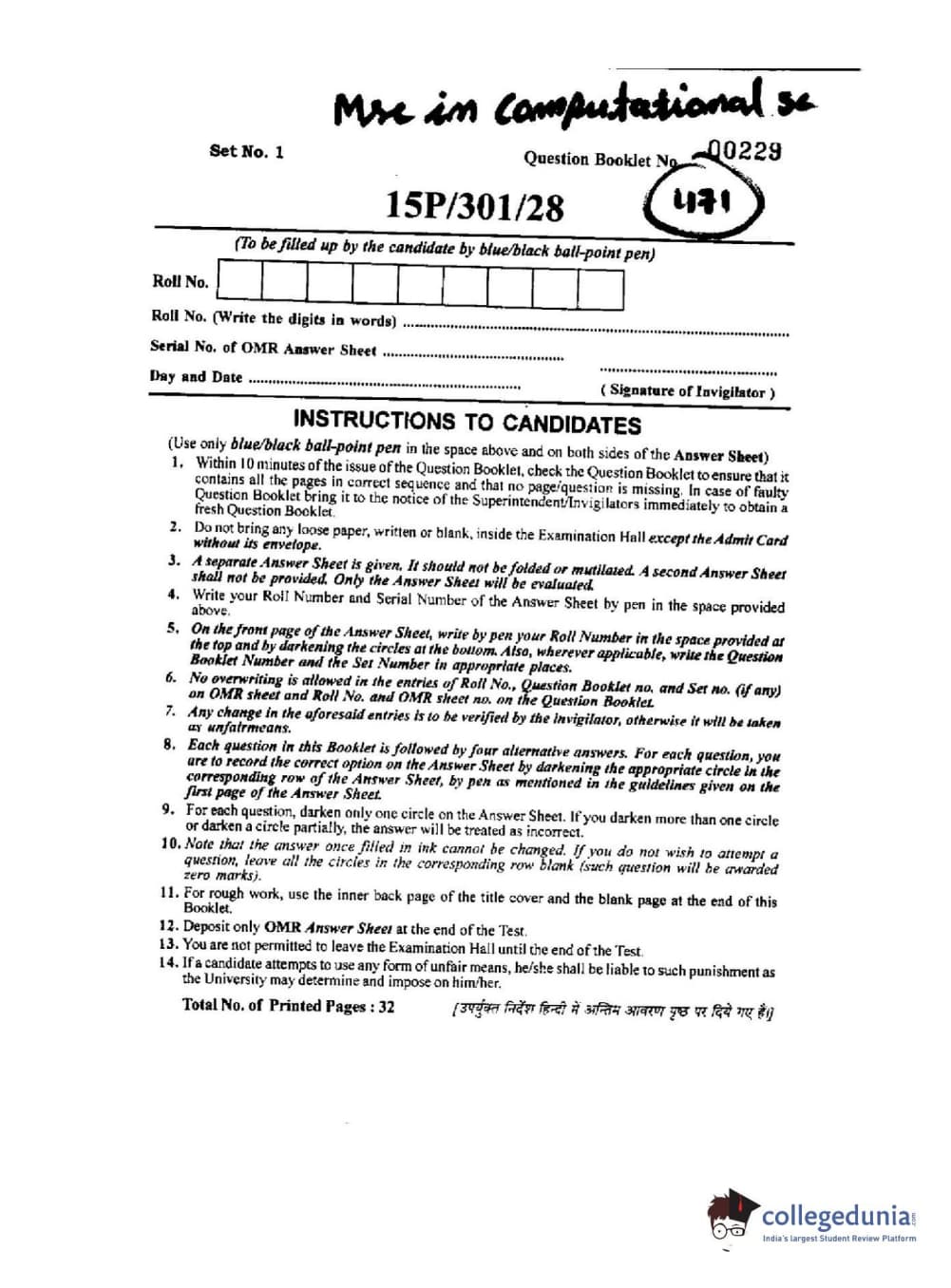 BHU PET 2015 M.Sc. in Computational Sc Question Paper with Answer Key PDFs