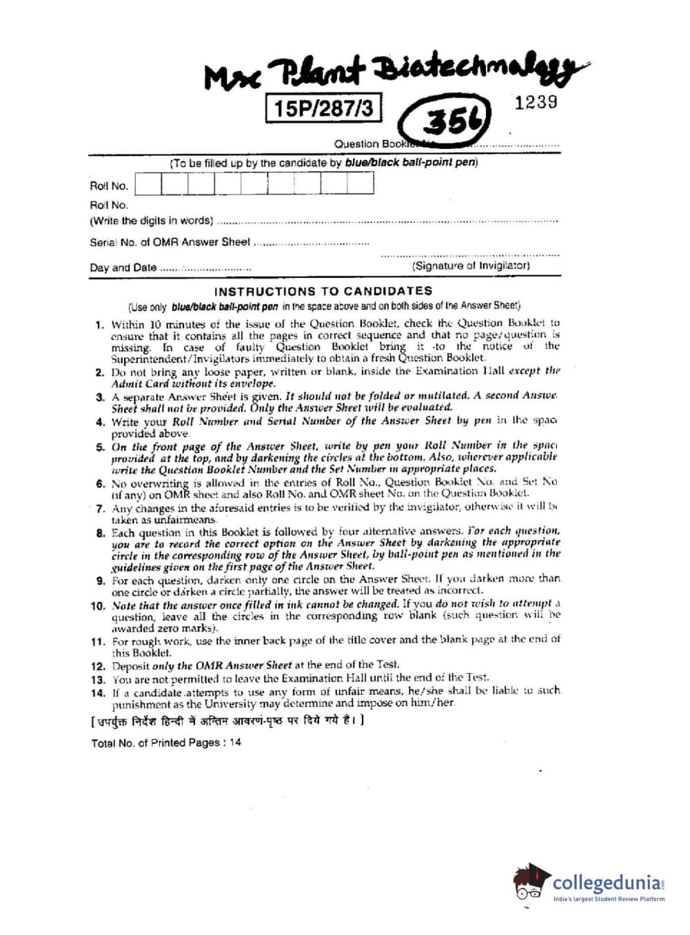 BHU PET 2015 M.Sc. Plant Biotechnology Question paper with answer key pdf is available for download. The exam was successfully organized by Banaras Hindu University (BHU). The question paper comprised a total of 120 questions.
