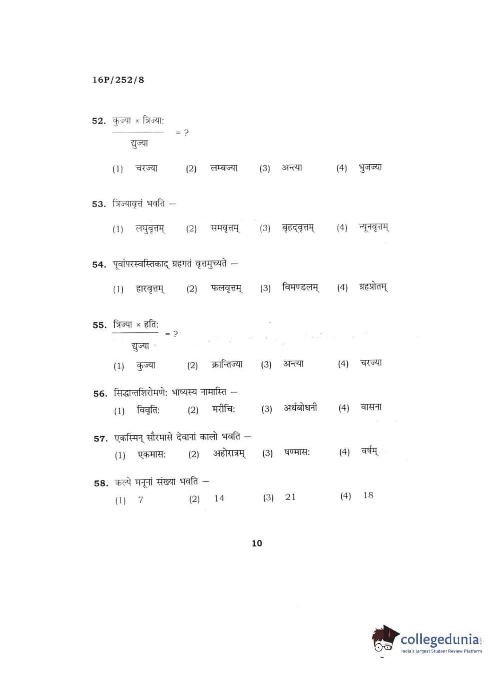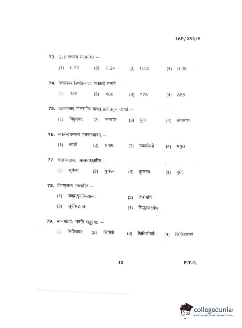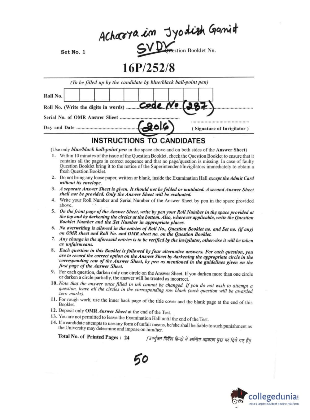 BHU PET 2016 ACHARYA IN JYOTISH GANIT Question Paper with Answer Key PDFs