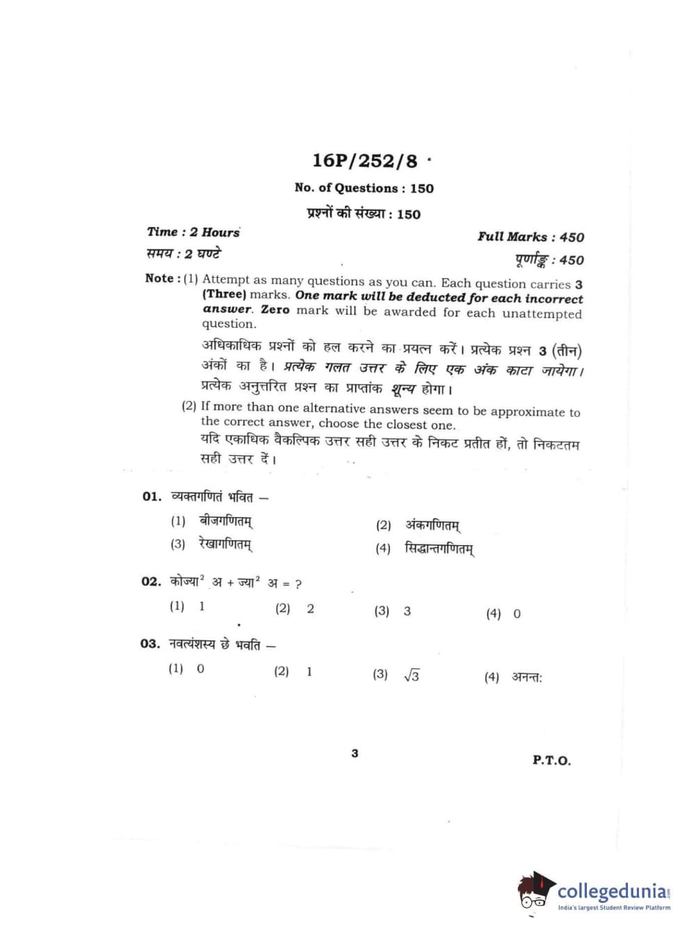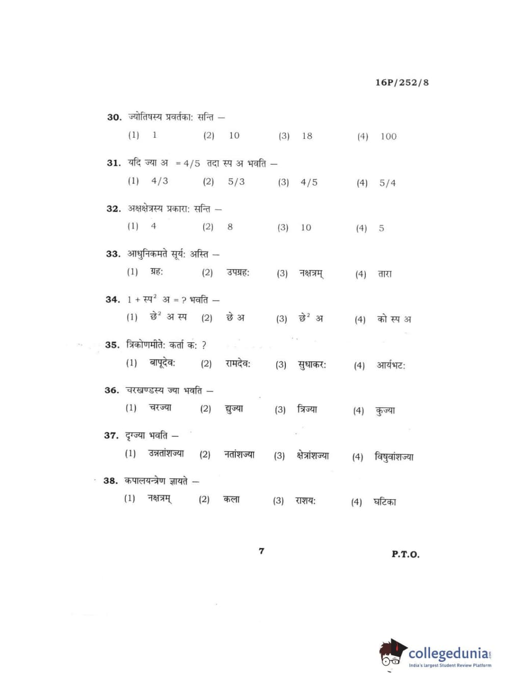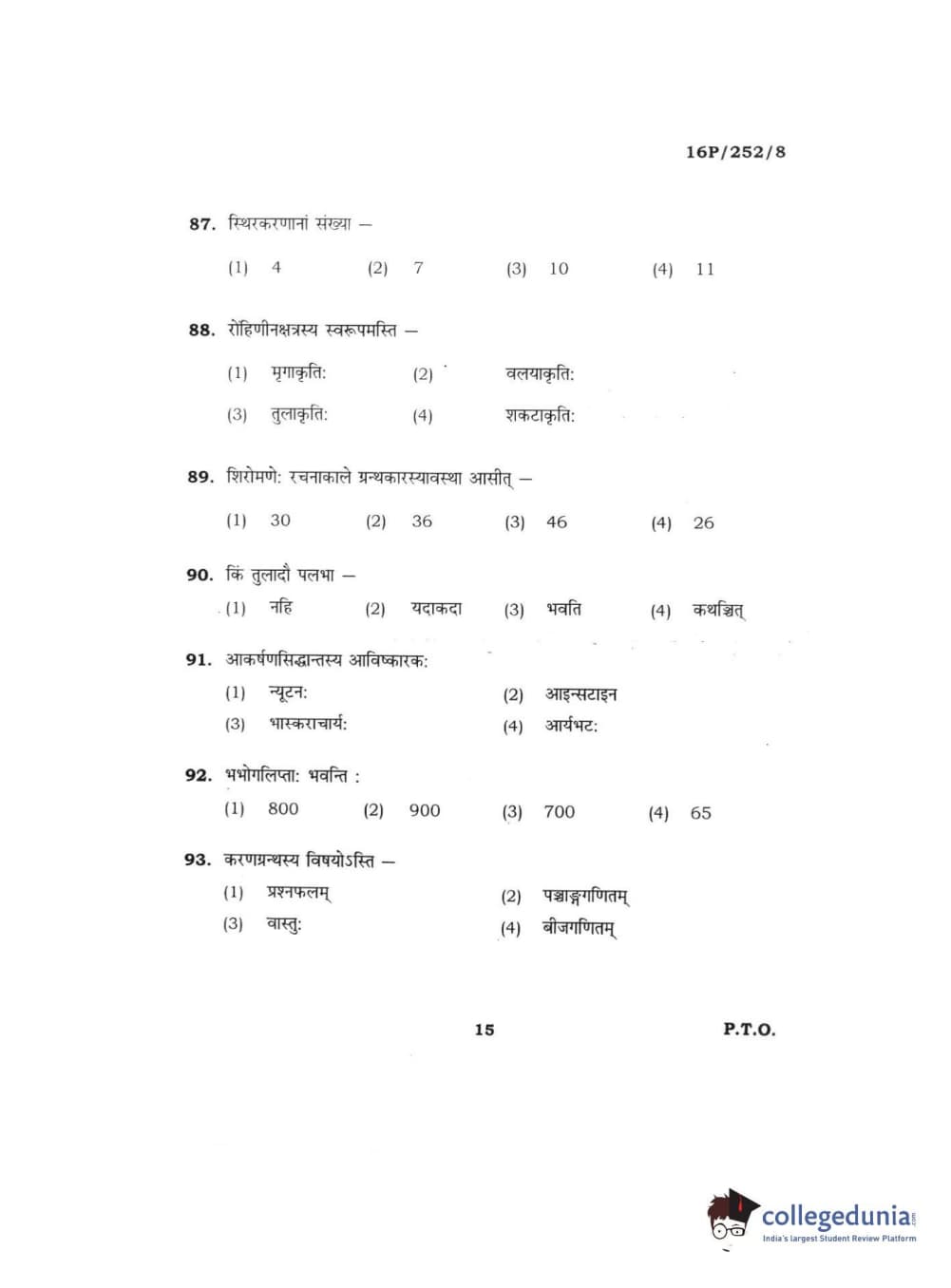 BHU PET 2016 ACHARYA IN JYOTISH GANIT Question Paper with Answer Key PDFs