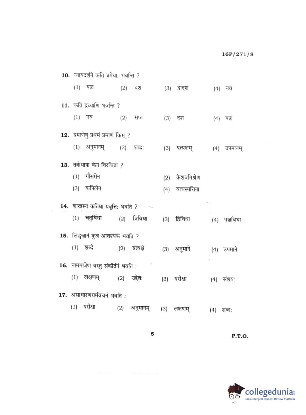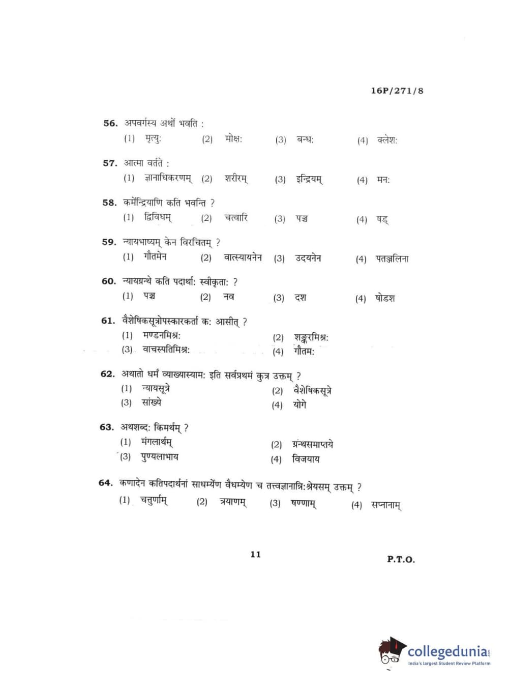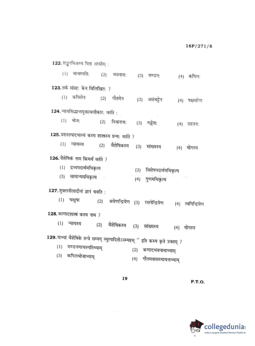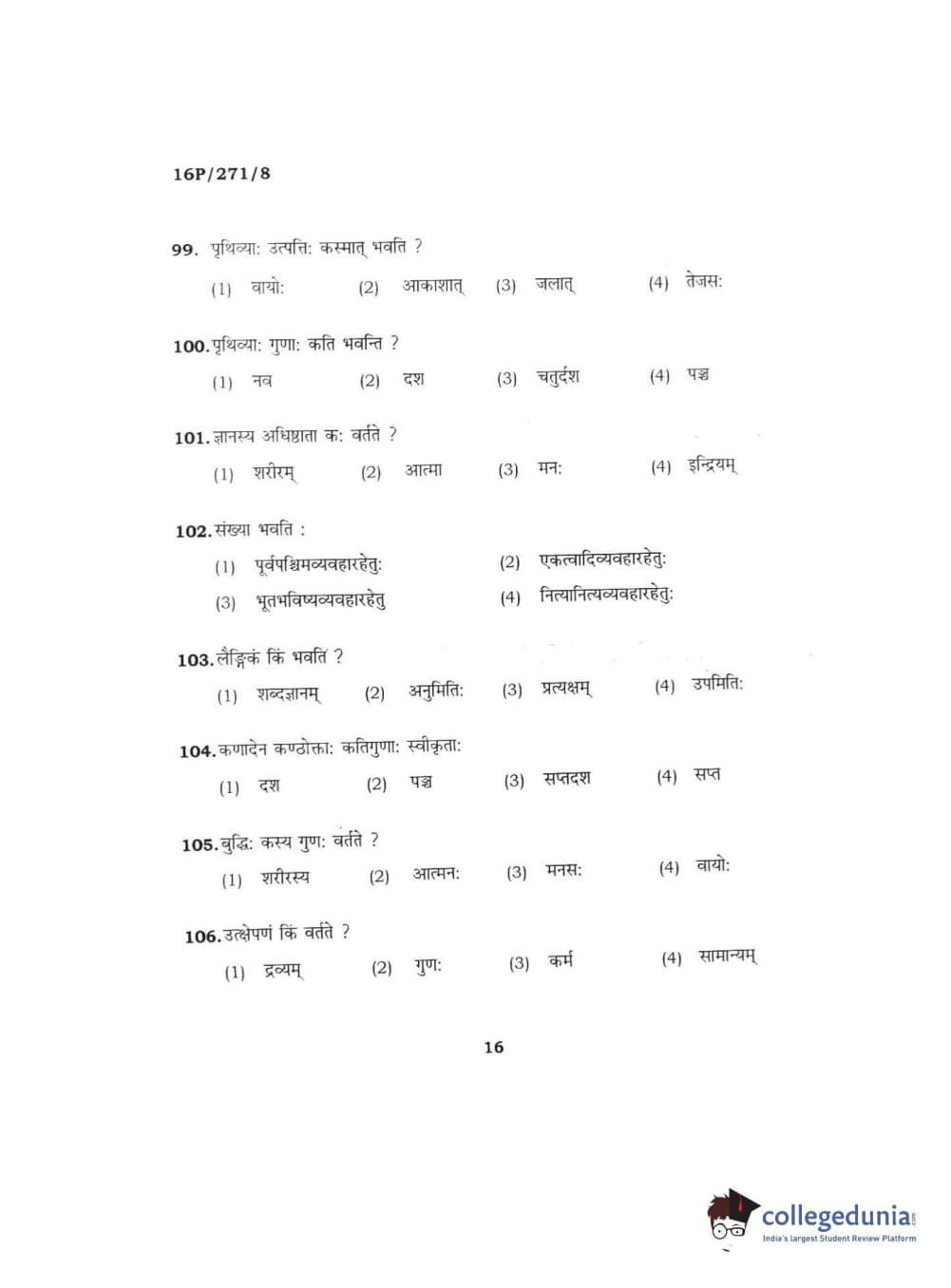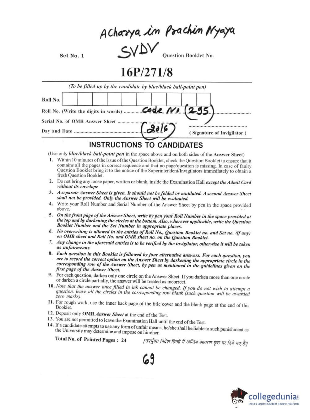 BHU PET 2016 ACHARYA IN PRACHIN NYAYA Question Paper with Answer Key PDFs