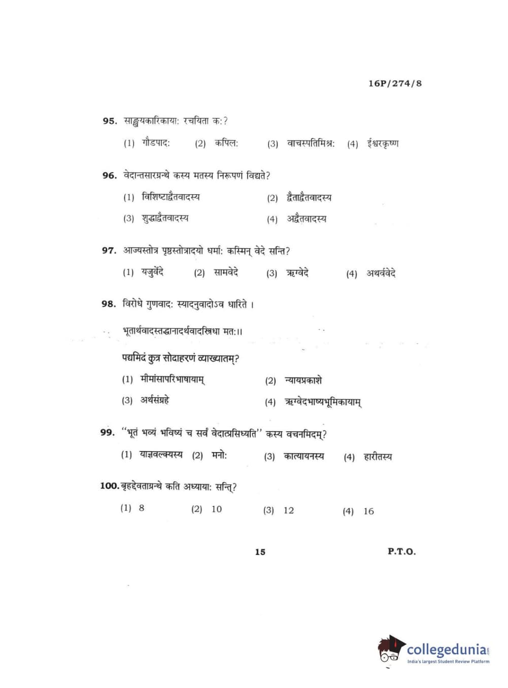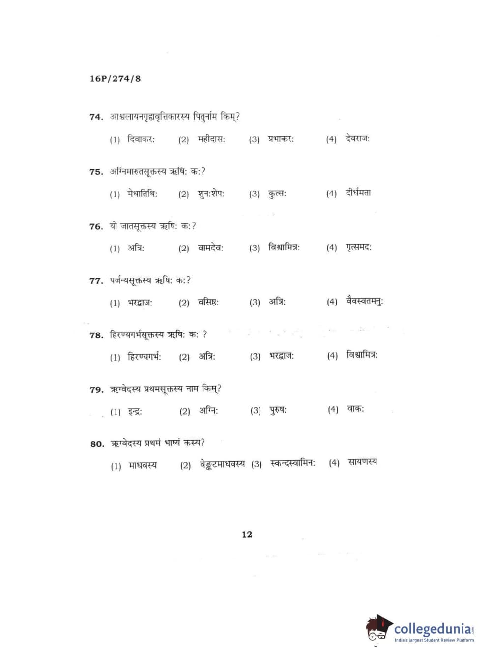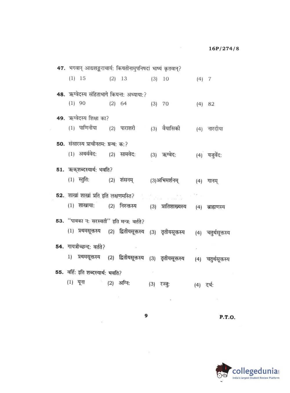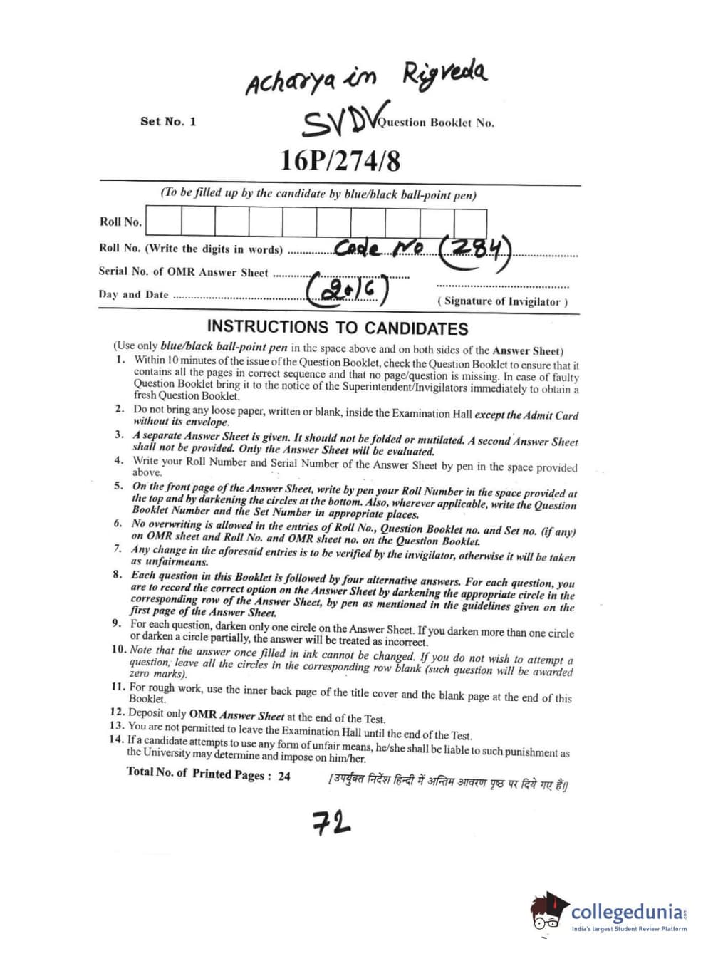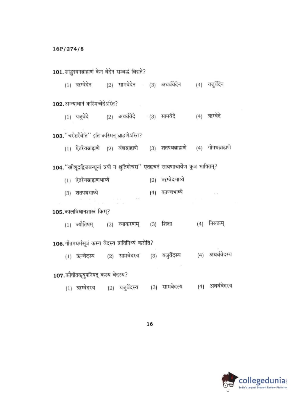 BHU PET 2016 ACHARYA IN RIGVEDA Question Paper with Answer Key PDFs