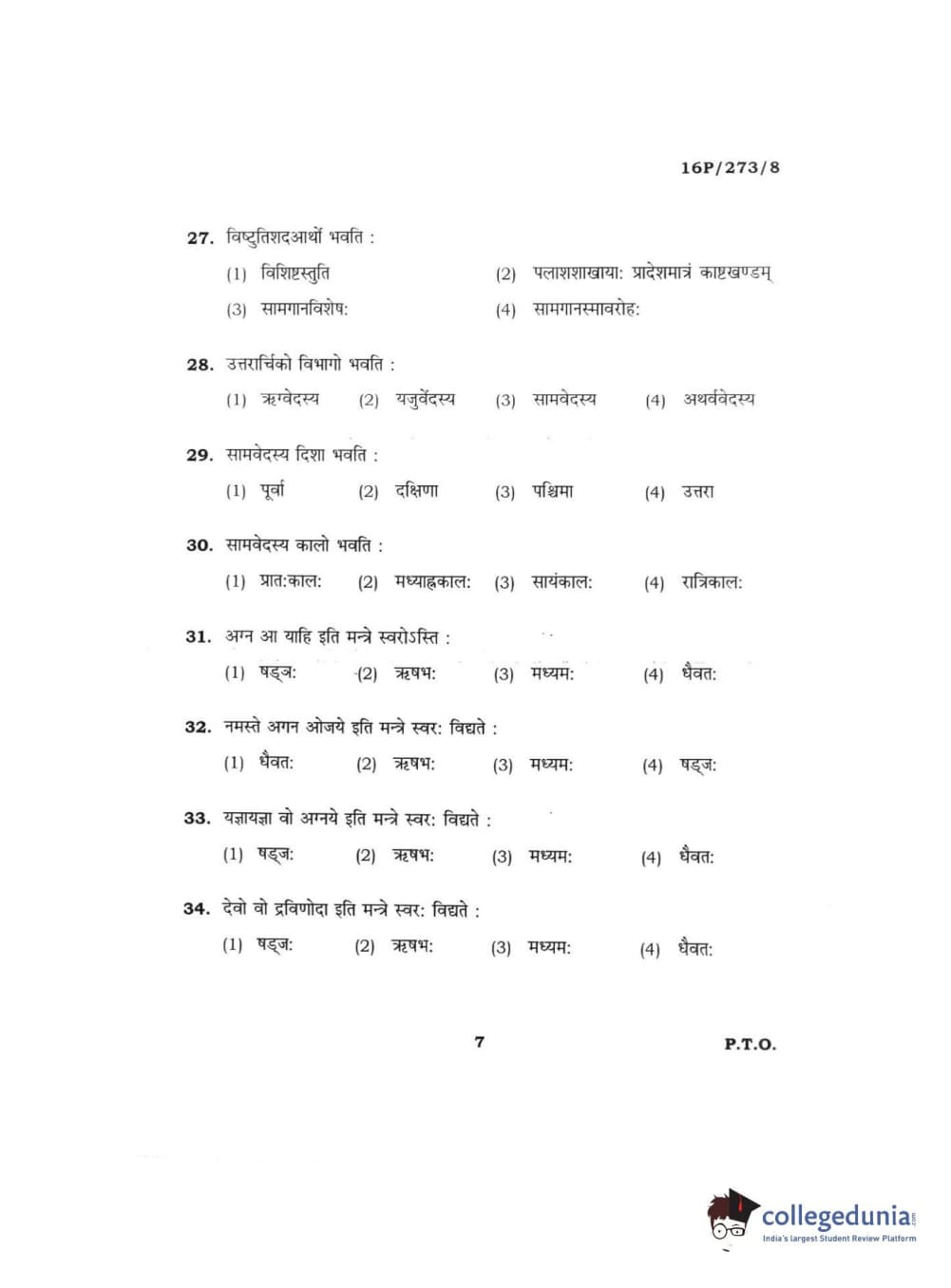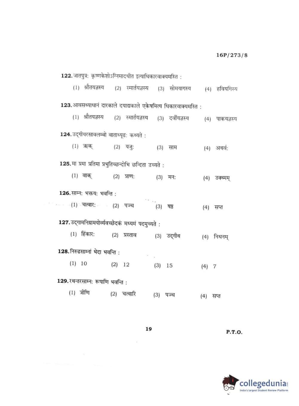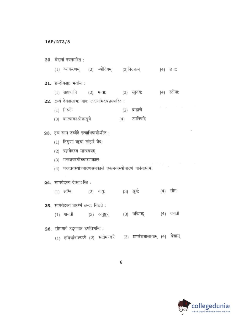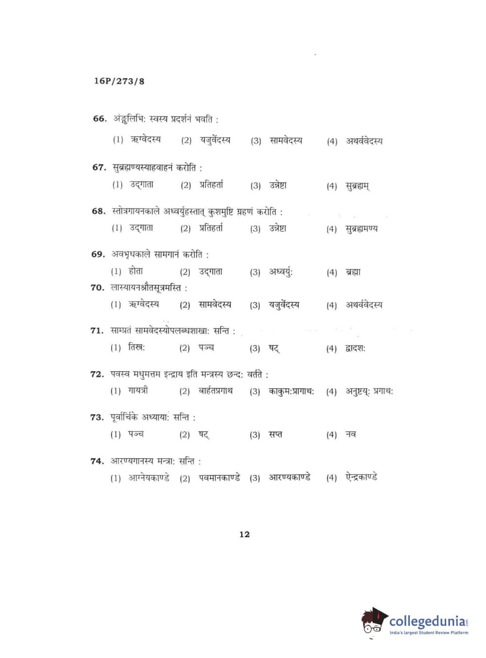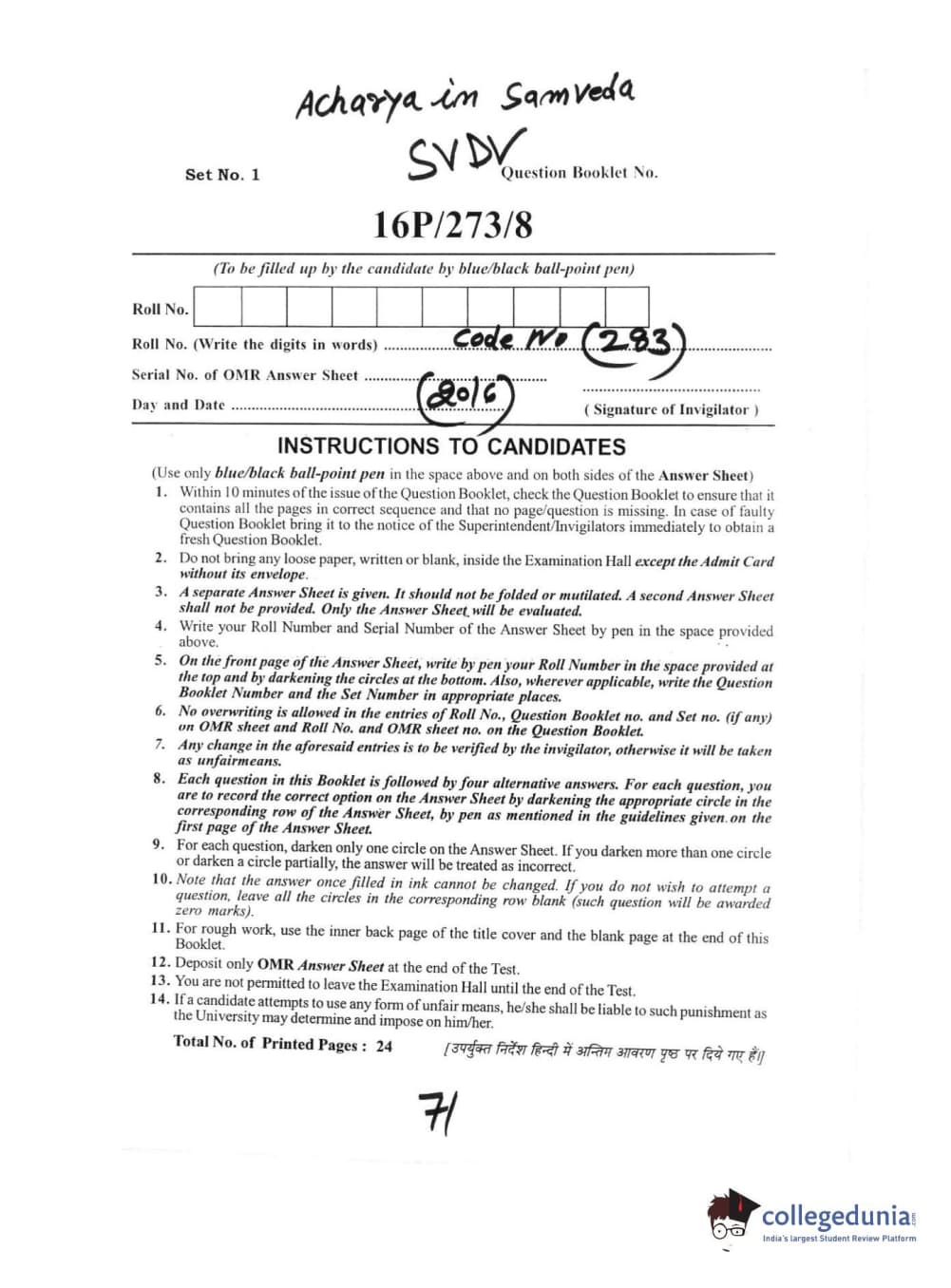 BHU PET 2016 ACHARYA IN SAMVEDA Question Paper with Answer Key PDFs