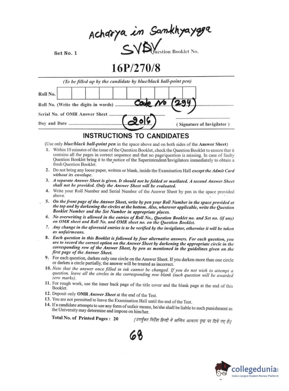 BHU PET 2016 ACHARYA IN SANKHYA Question paper with answer key pdf June 8, 2016 in Shift 2 is available for download. The exam was successfully organized by Banaras Hindu University (BHU). The question paper comprised a total of 150 questions.