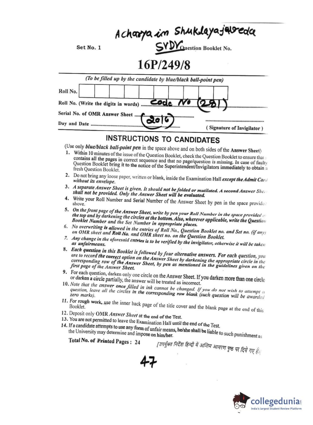 | BHU PET 2016 ACHARYA IN SHUKLAYA Question Paper PDF | BHU PET 2016 ACHARYA IN SHUKLAYA Answer Key PDF |