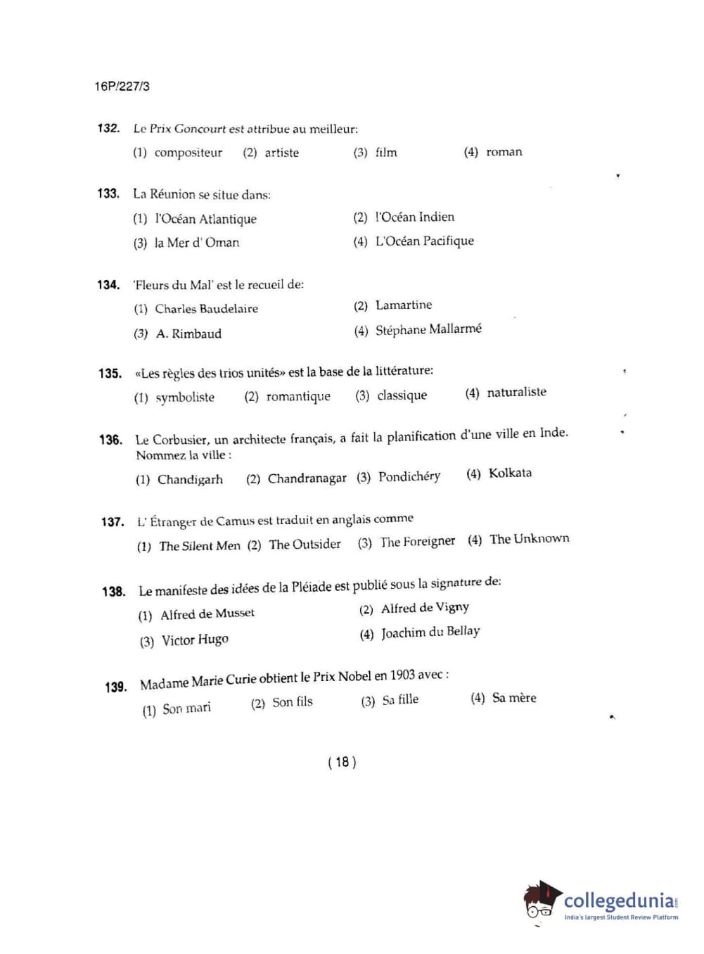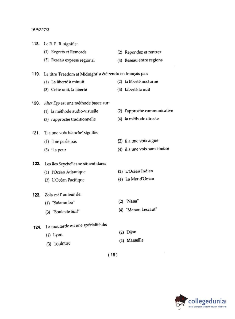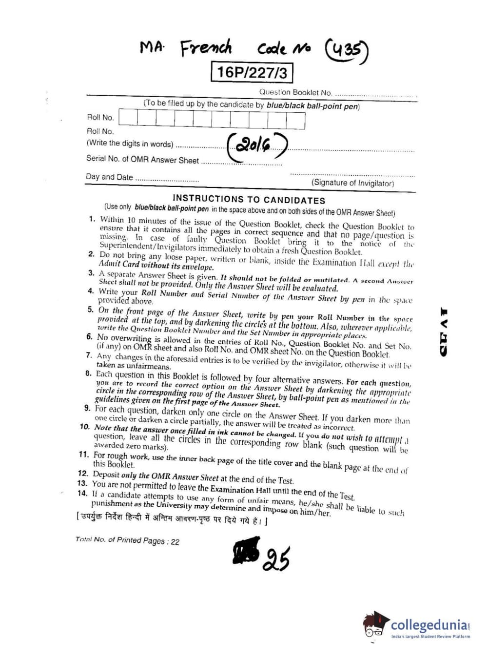 BHU PET 2016 M.A. FRENCH Question Paper with Answer Key PDFs