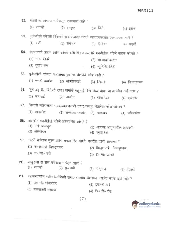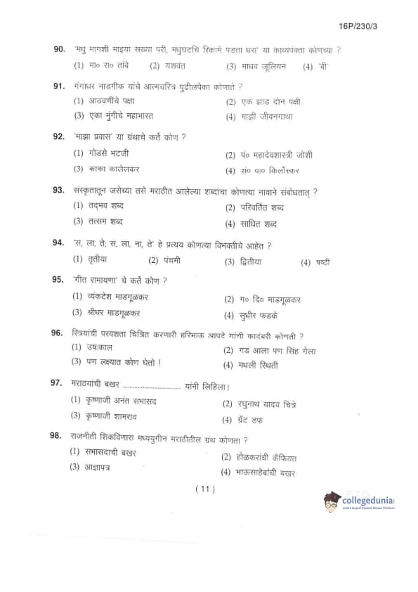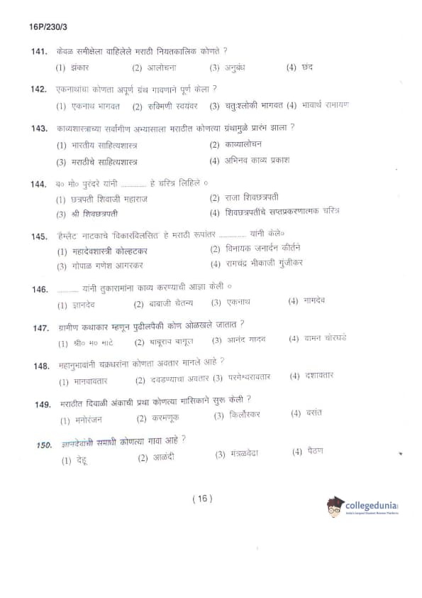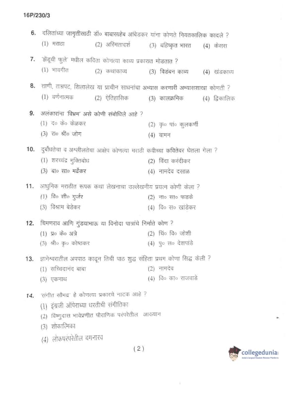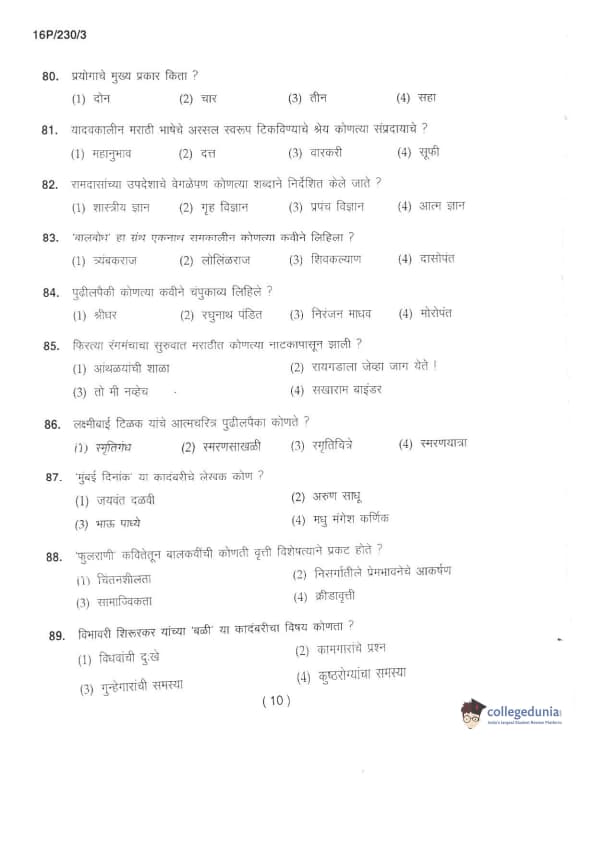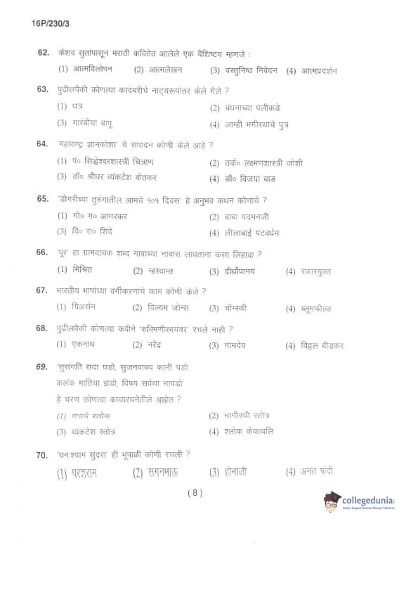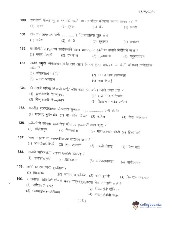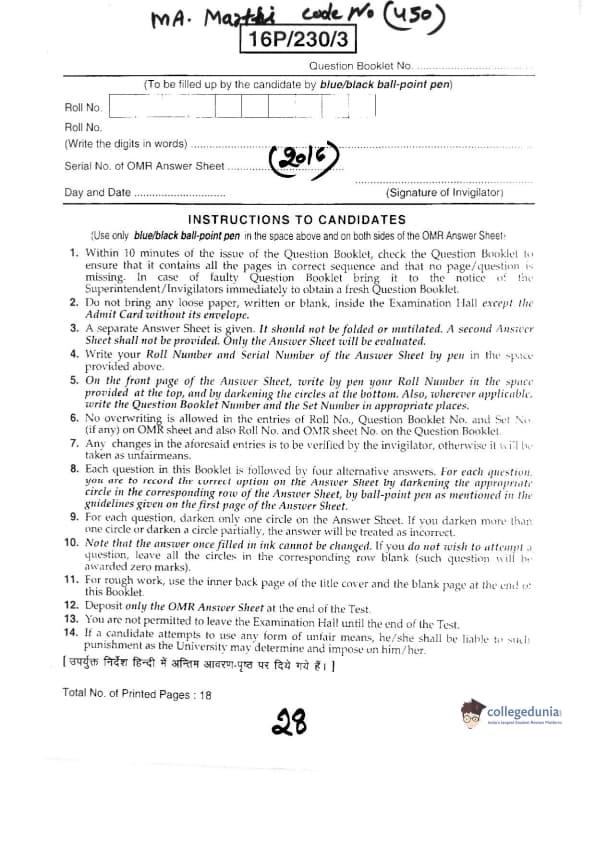 BHU PET 2016 M.A. MARTHI Question Paper with Answer Key PDFs in Marathi