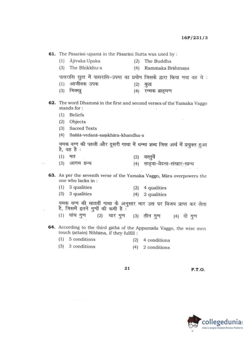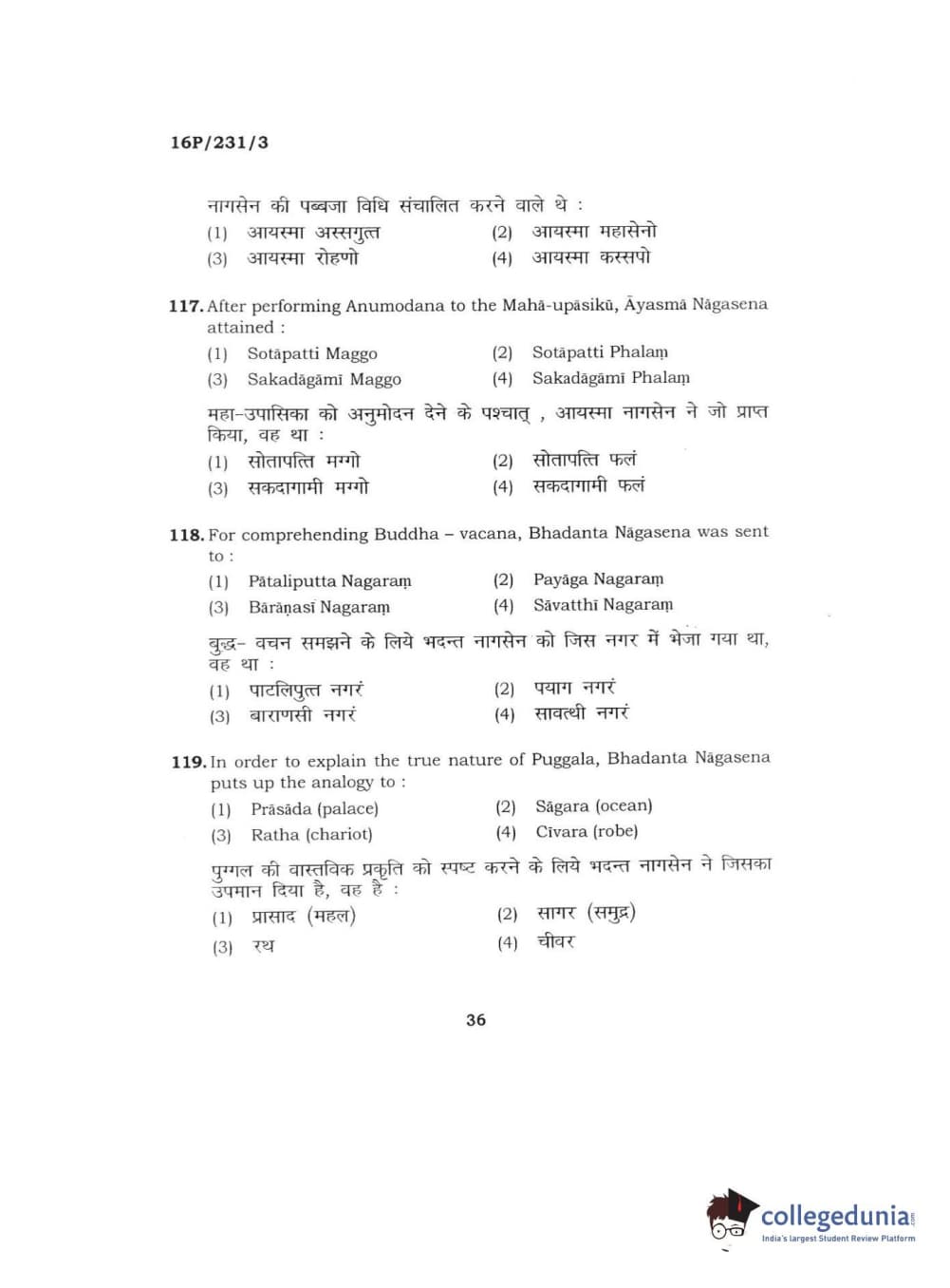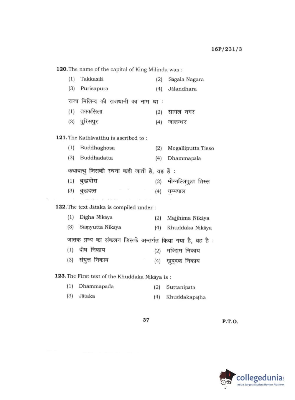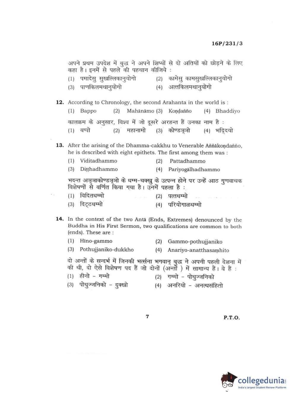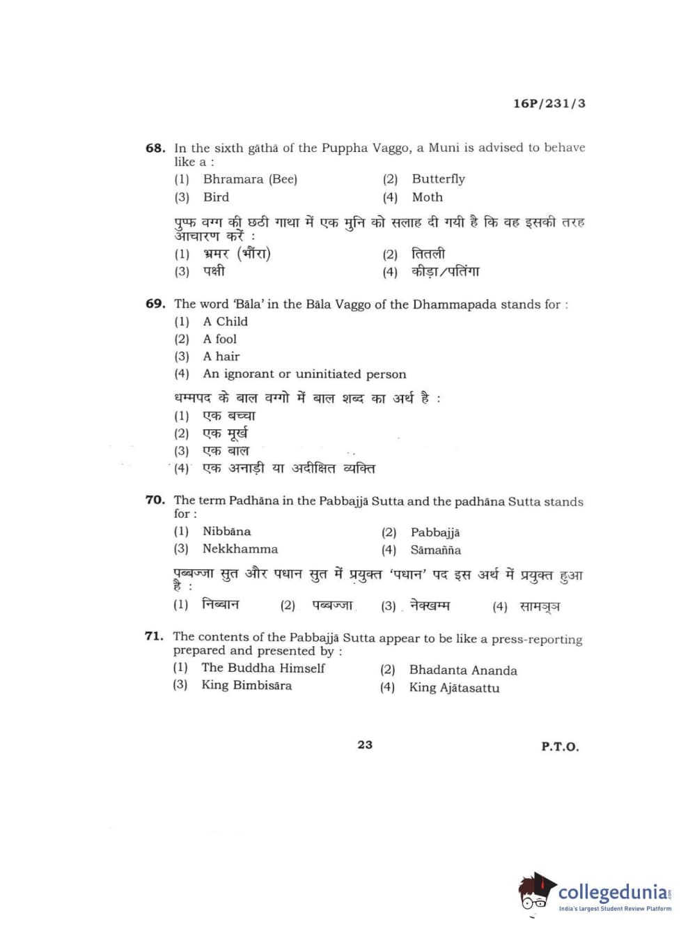 BHU PET 2016 M.A. PALI Question Paper with Answer Key PDFs