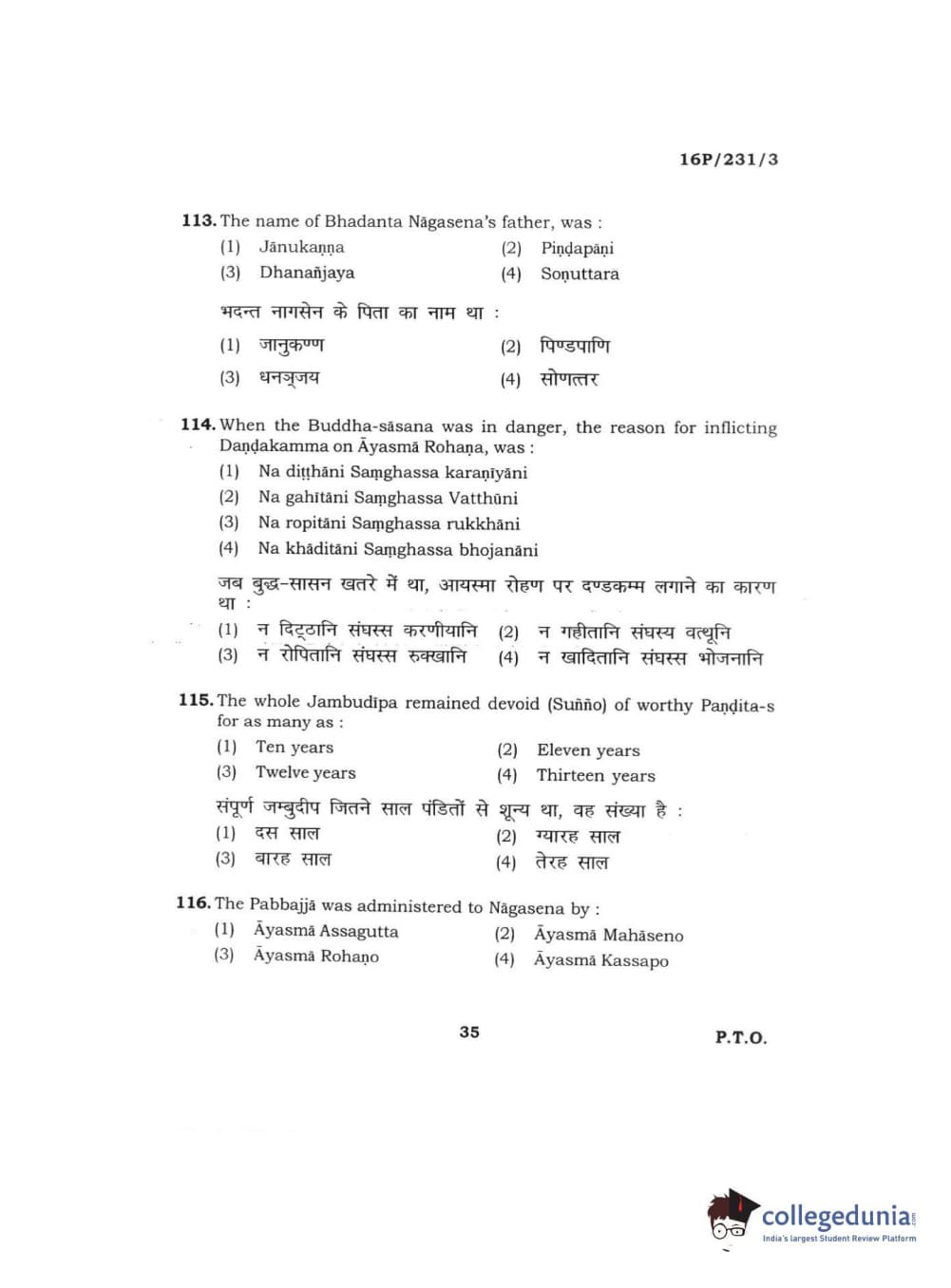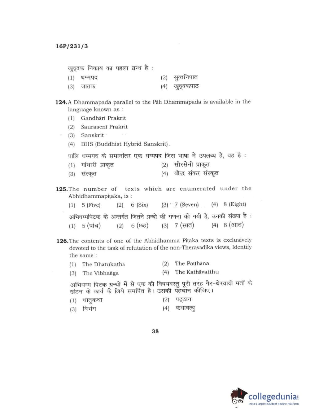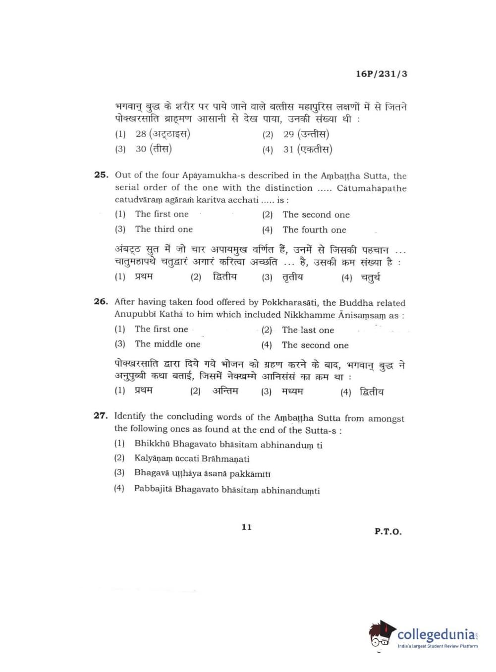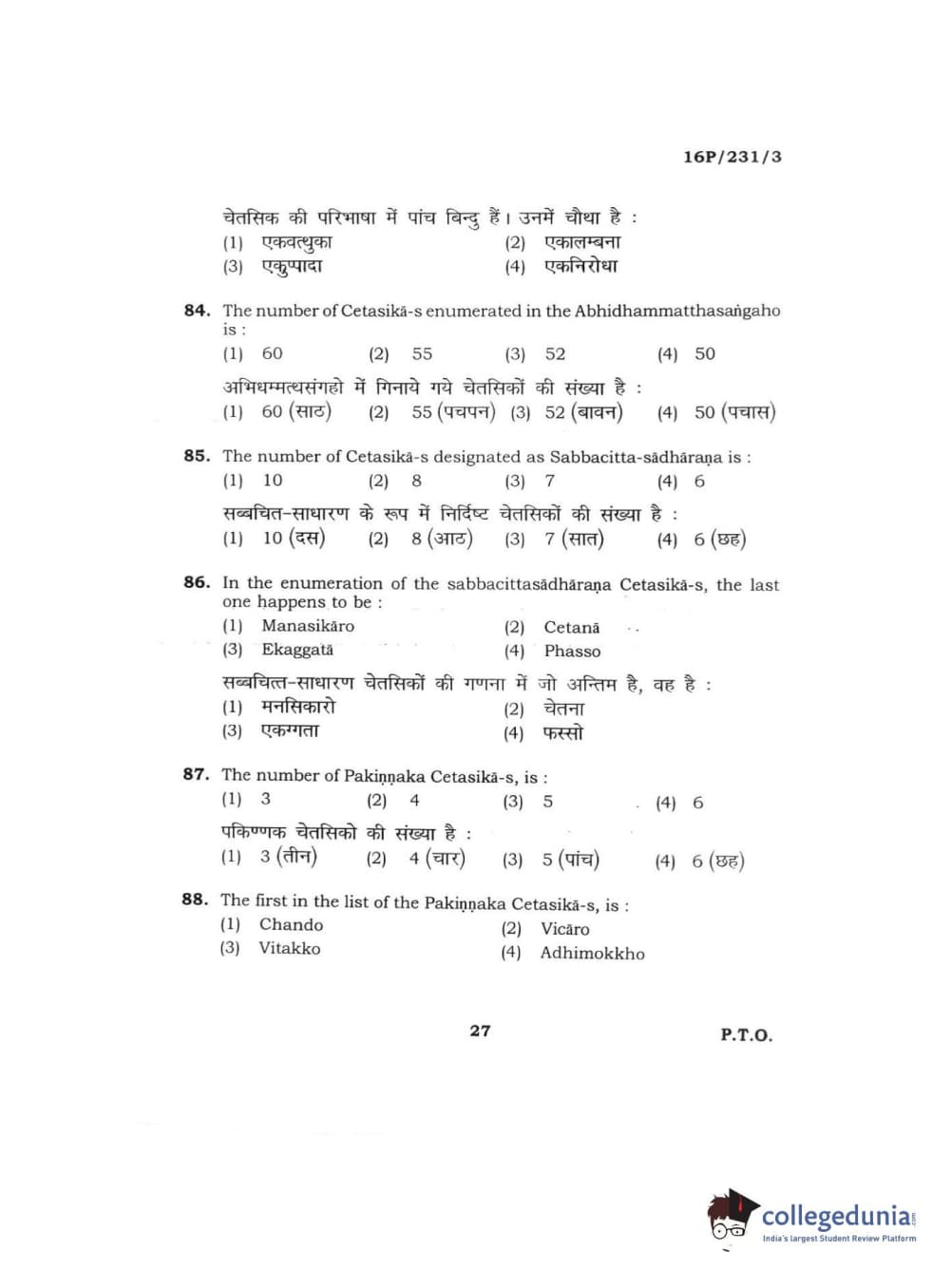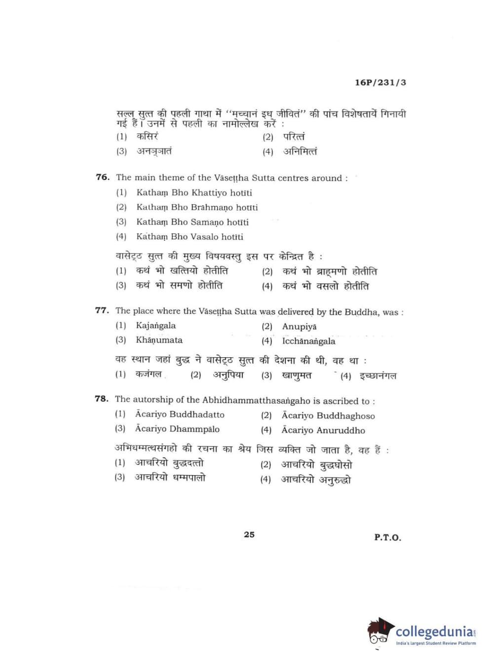 BHU PET 2016 M.A. PALI Question Paper with Answer Key PDFs