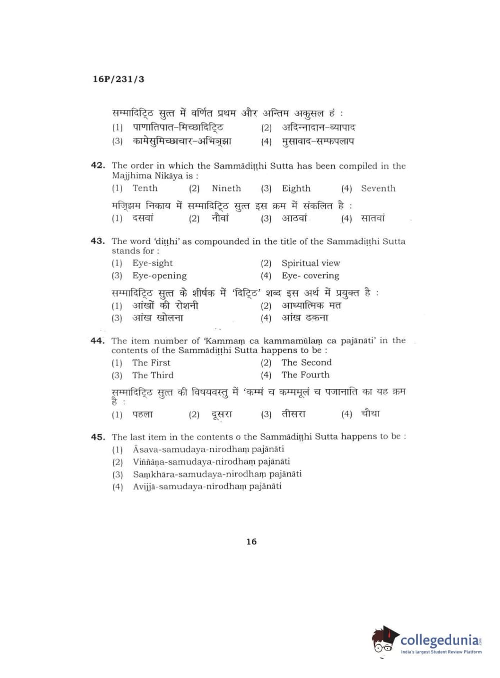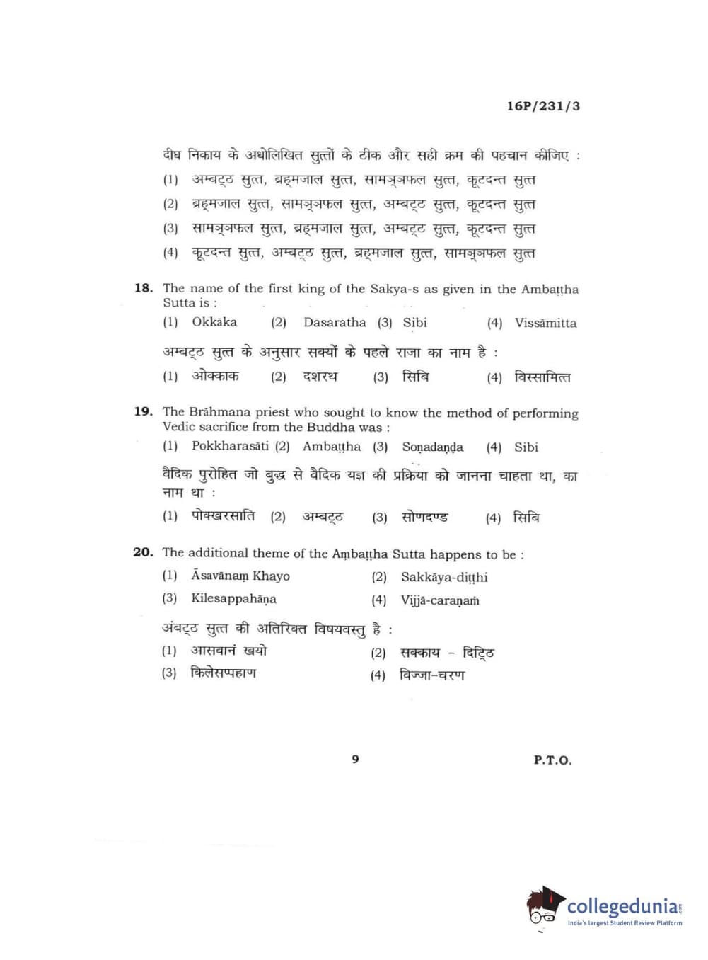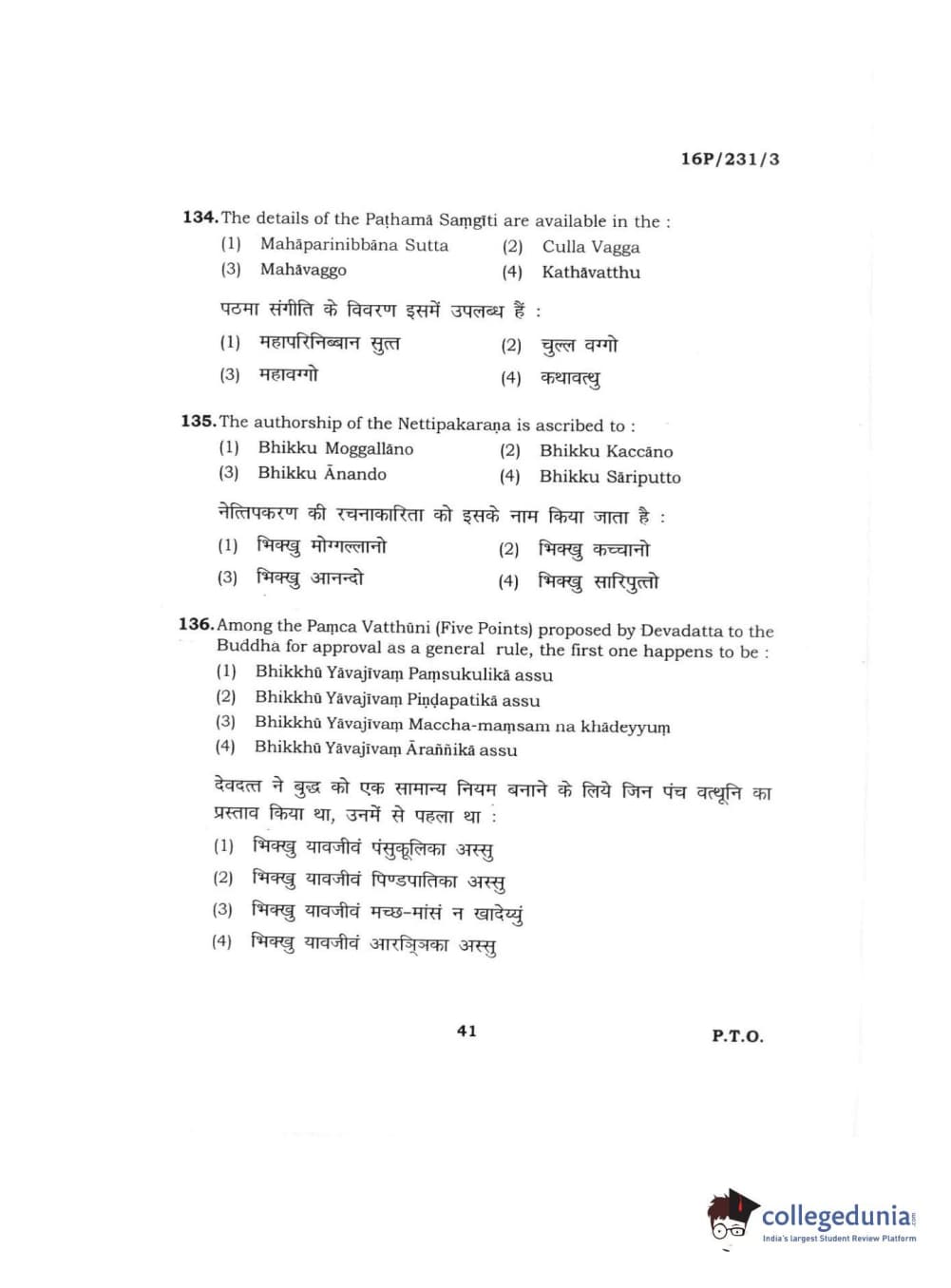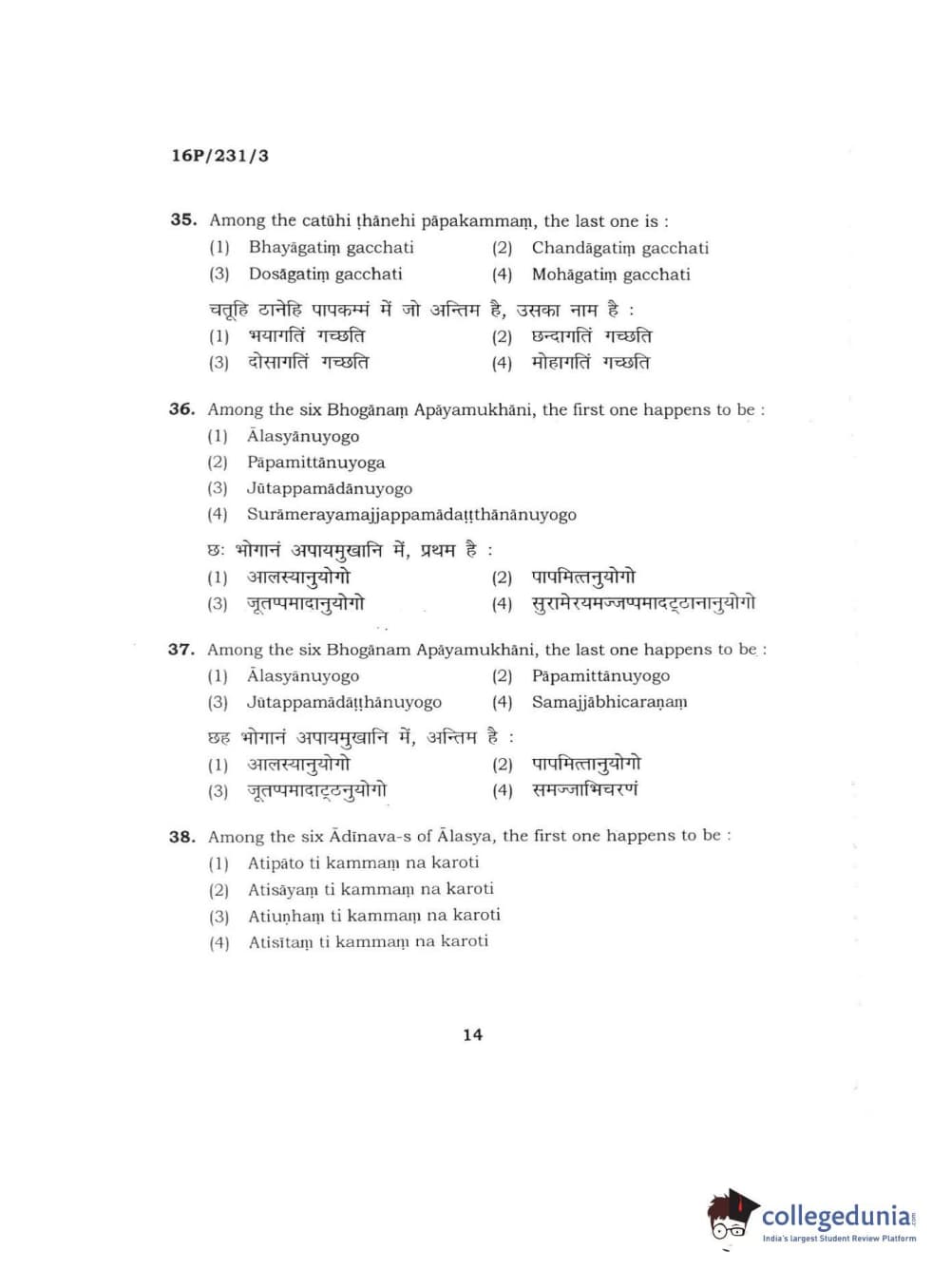 BHU PET 2016 M.A. PALI Question Paper with Answer Key PDFs