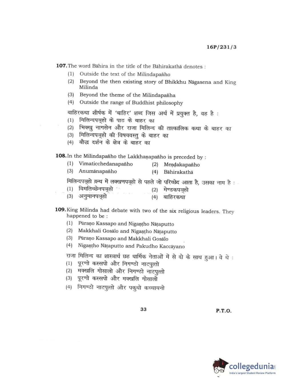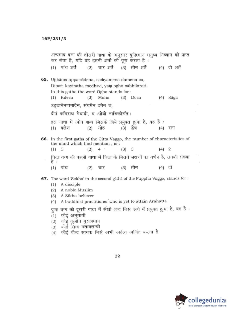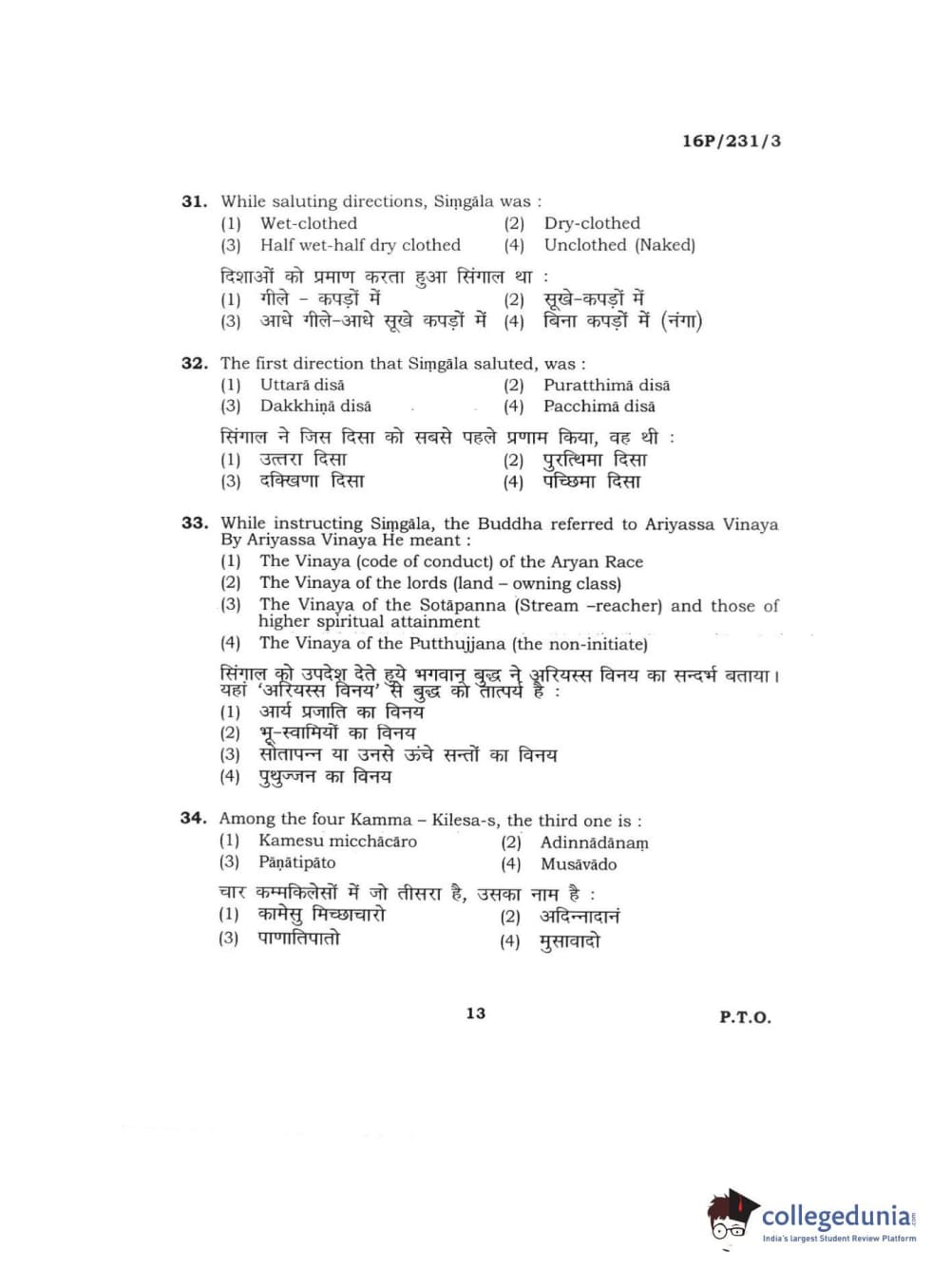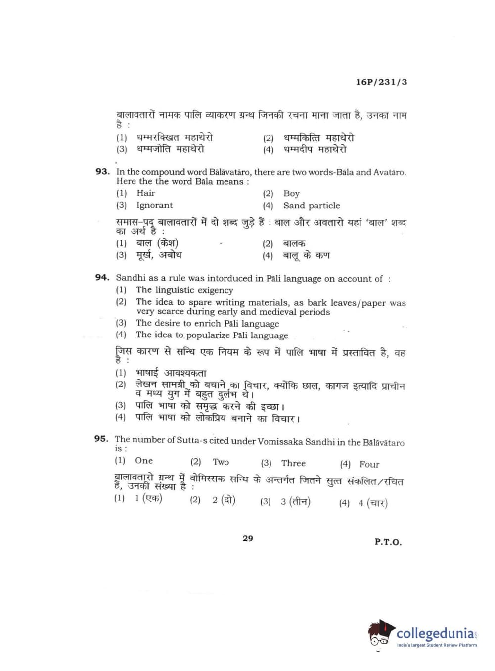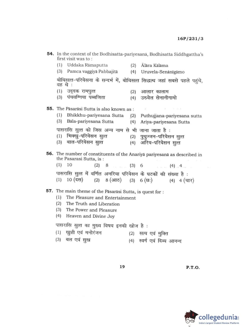 BHU PET 2016 M.A. PALI Question Paper with Answer Key PDFs