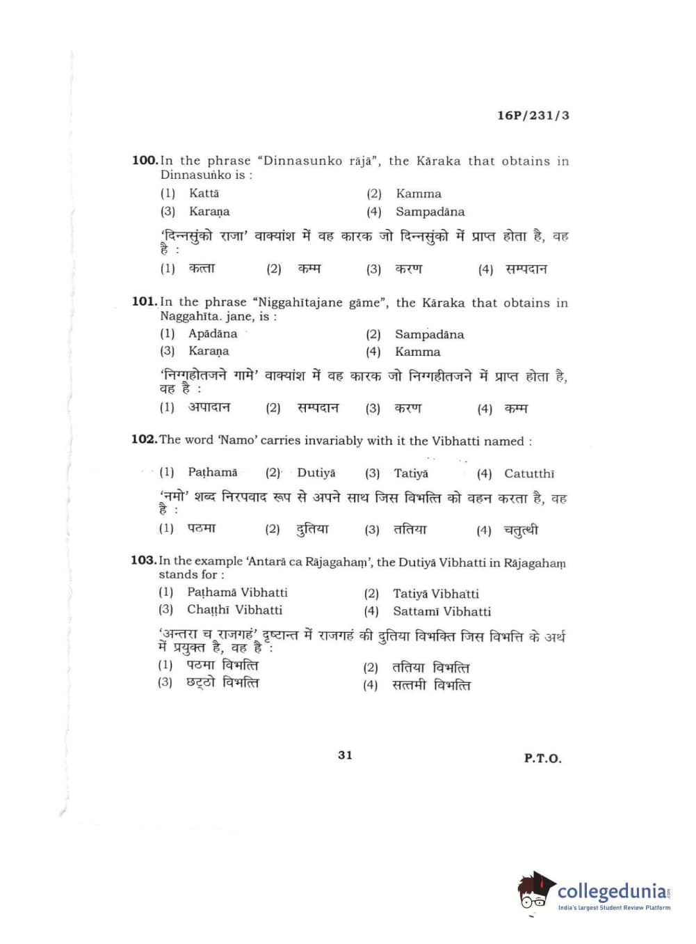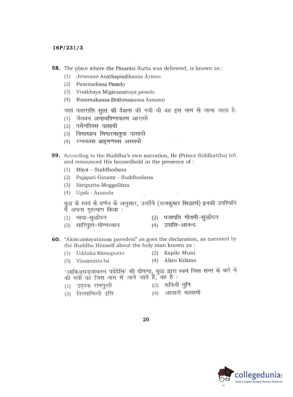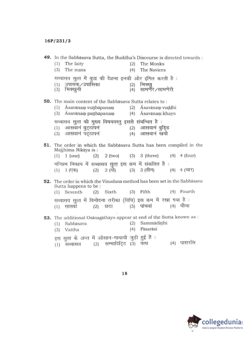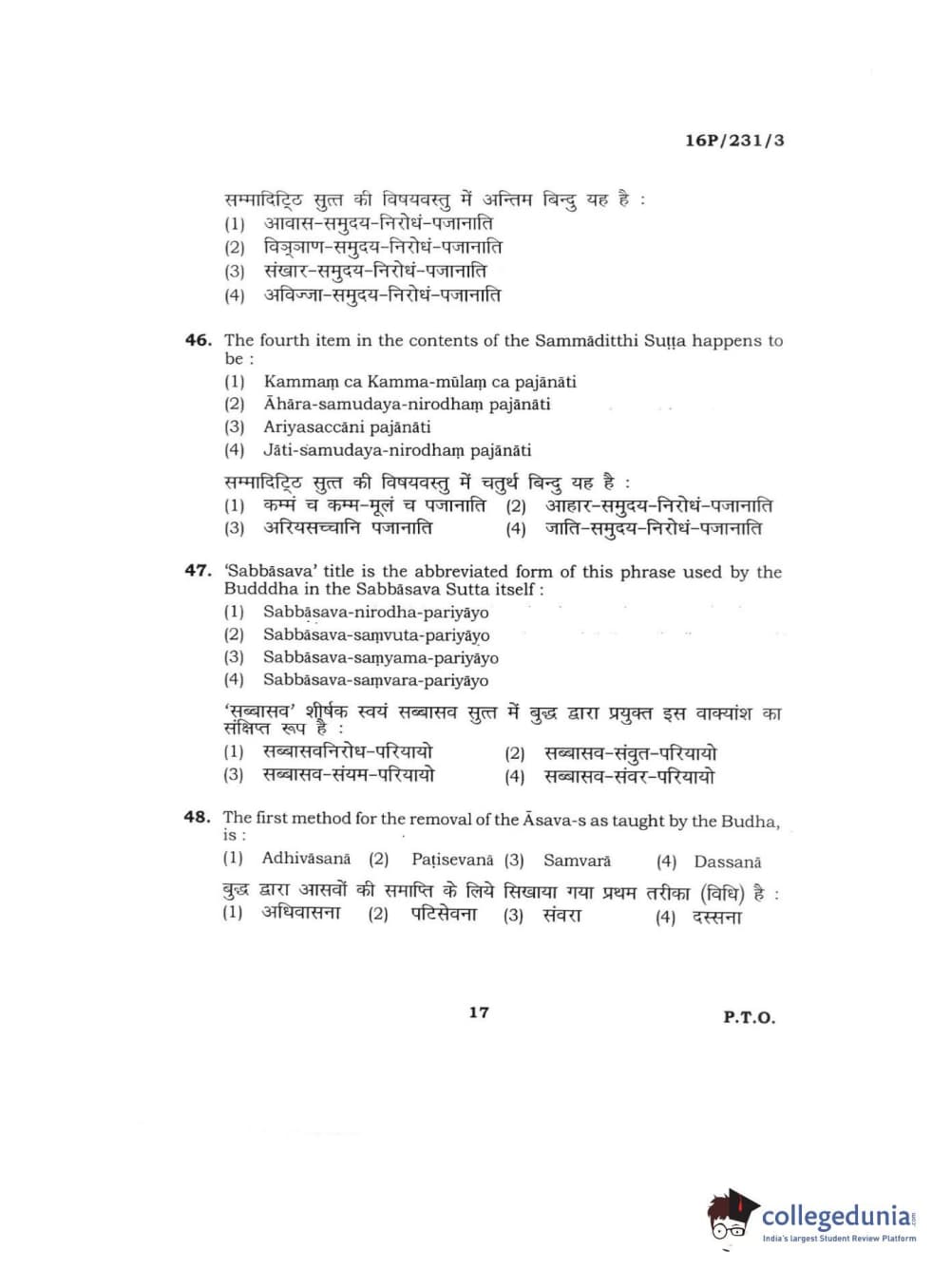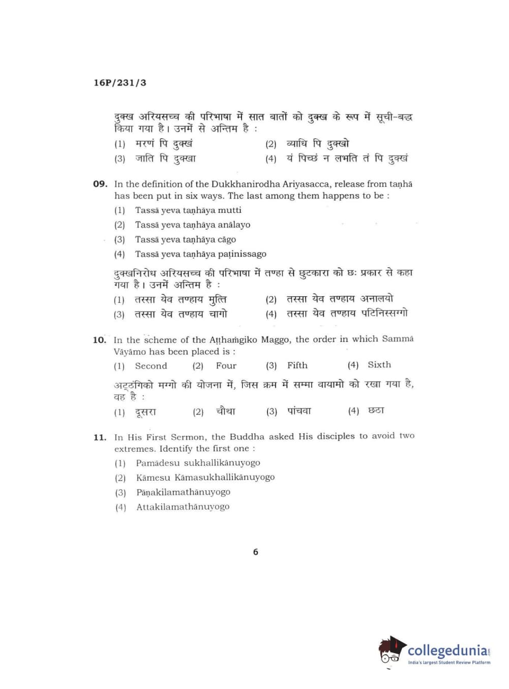 BHU PET 2016 M.A. PALI Question Paper with Answer Key PDFs