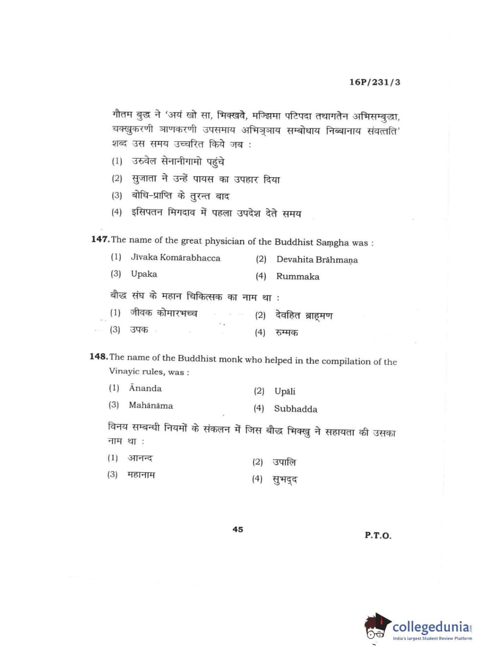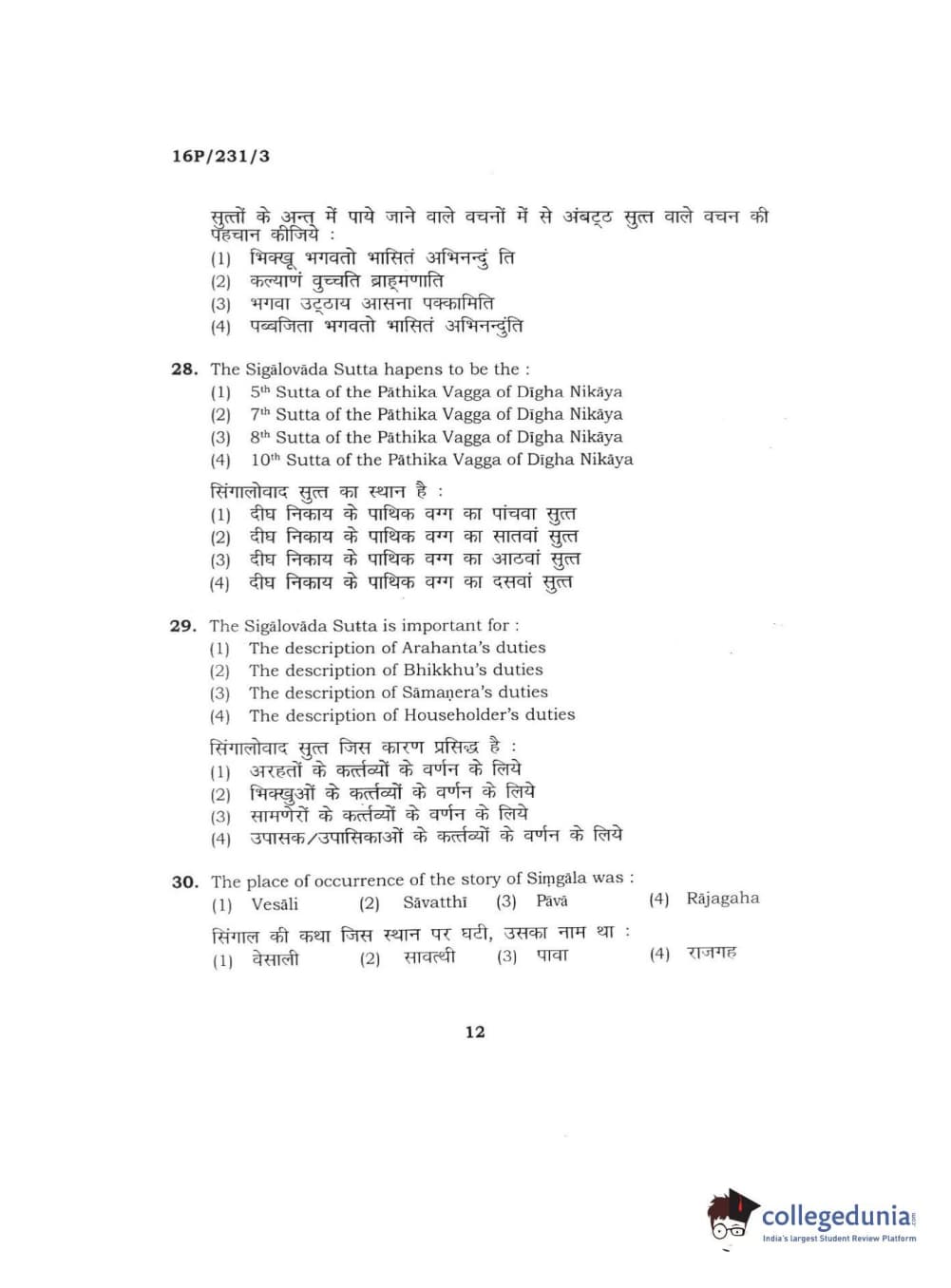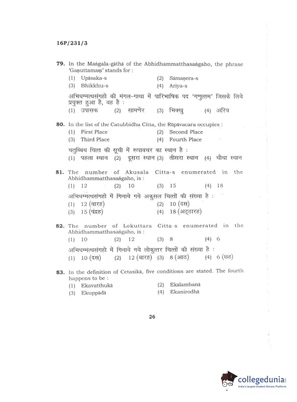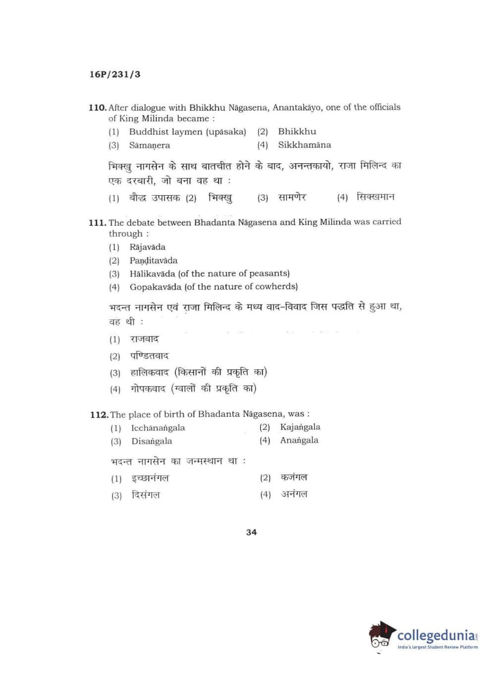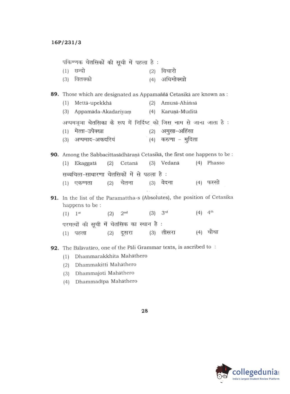 BHU PET 2016 M.A. PALI Question Paper with Answer Key PDFs