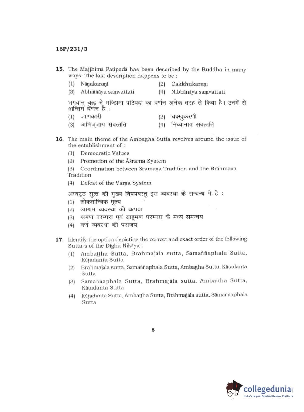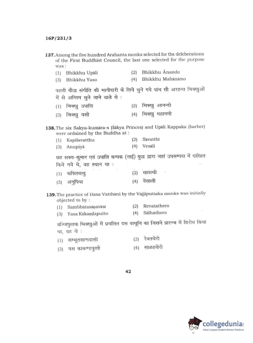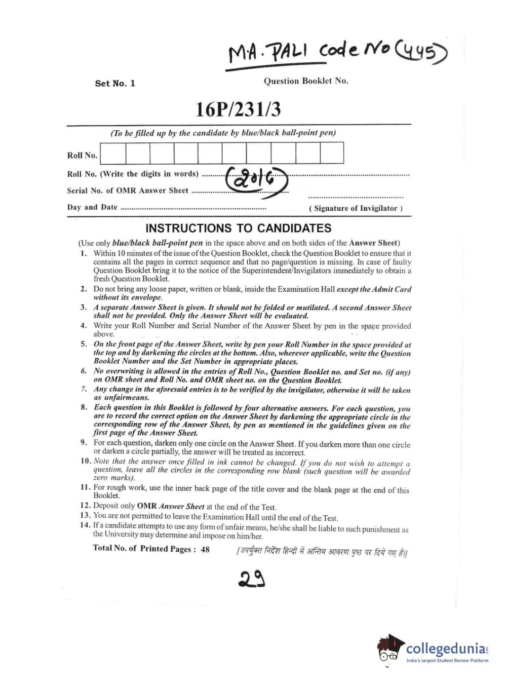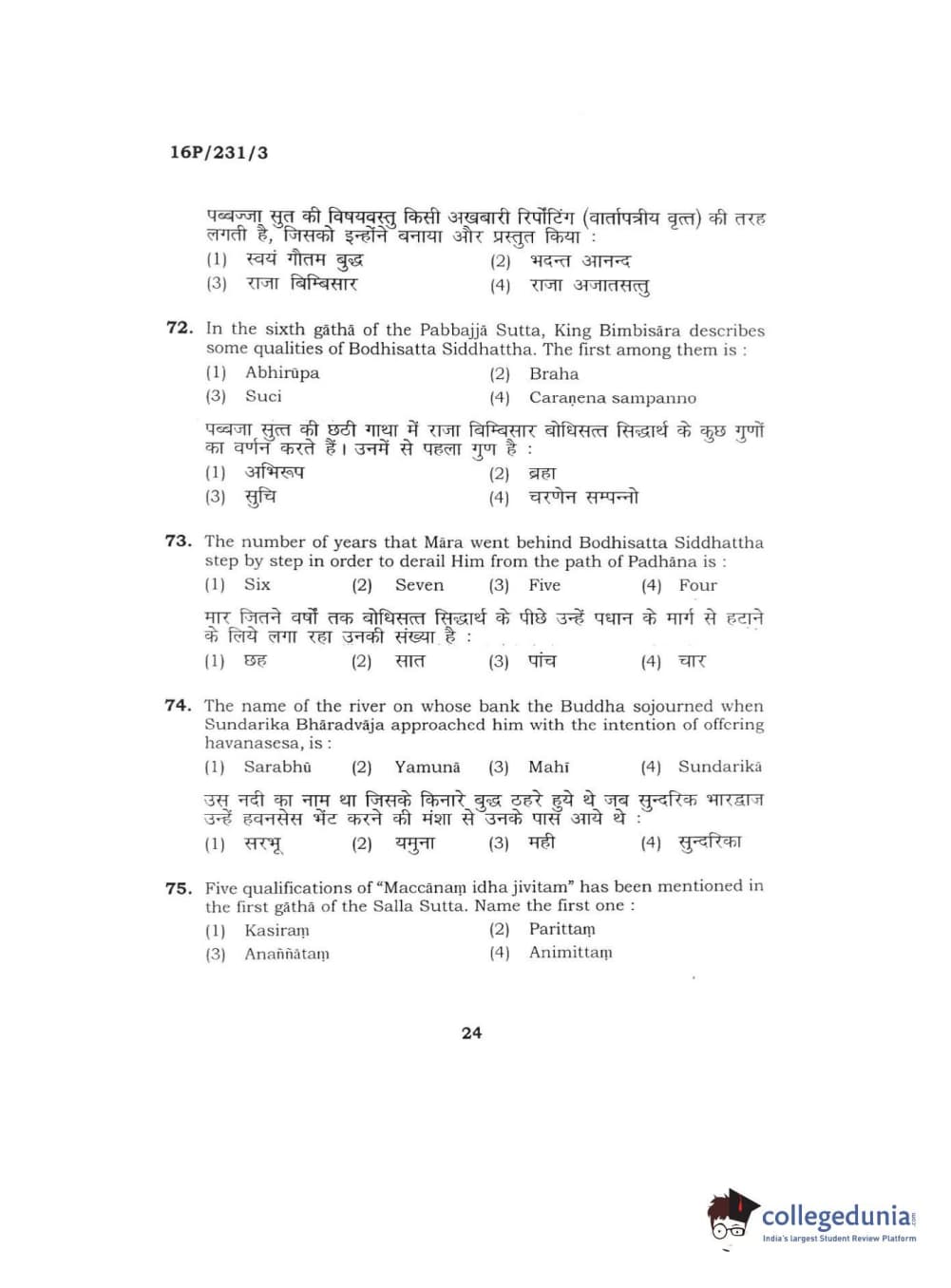 BHU PET 2016 M.A. PALI Question Paper with Answer Key PDFs