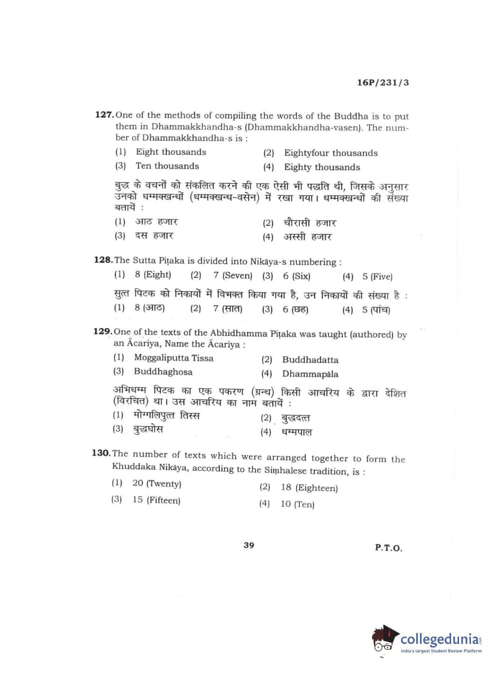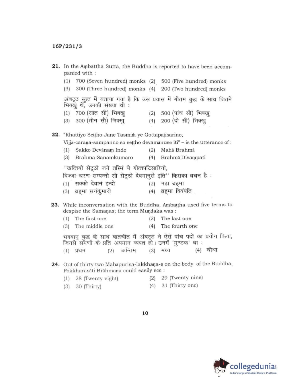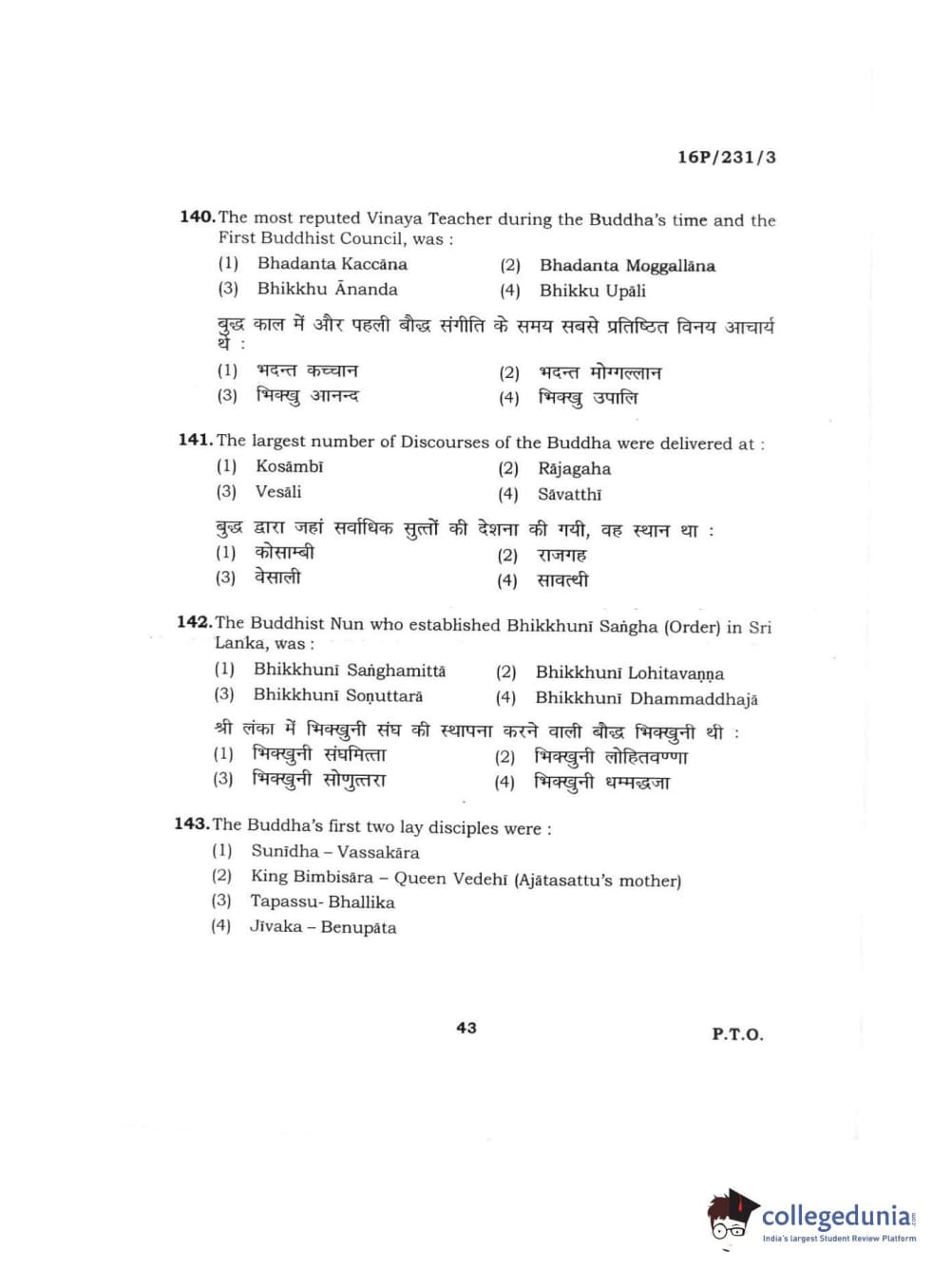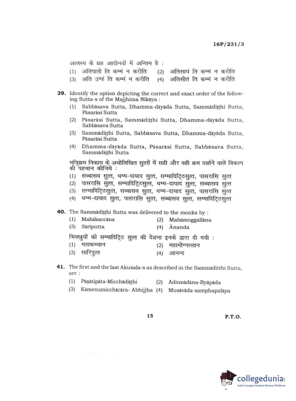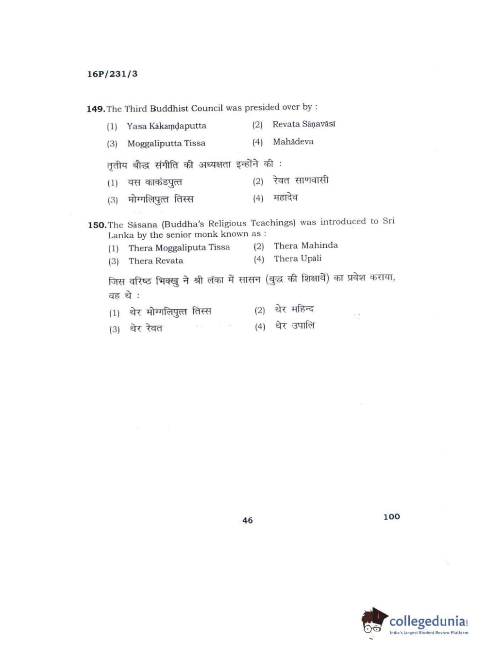 BHU PET 2016 M.A. PALI Question Paper with Answer Key PDFs