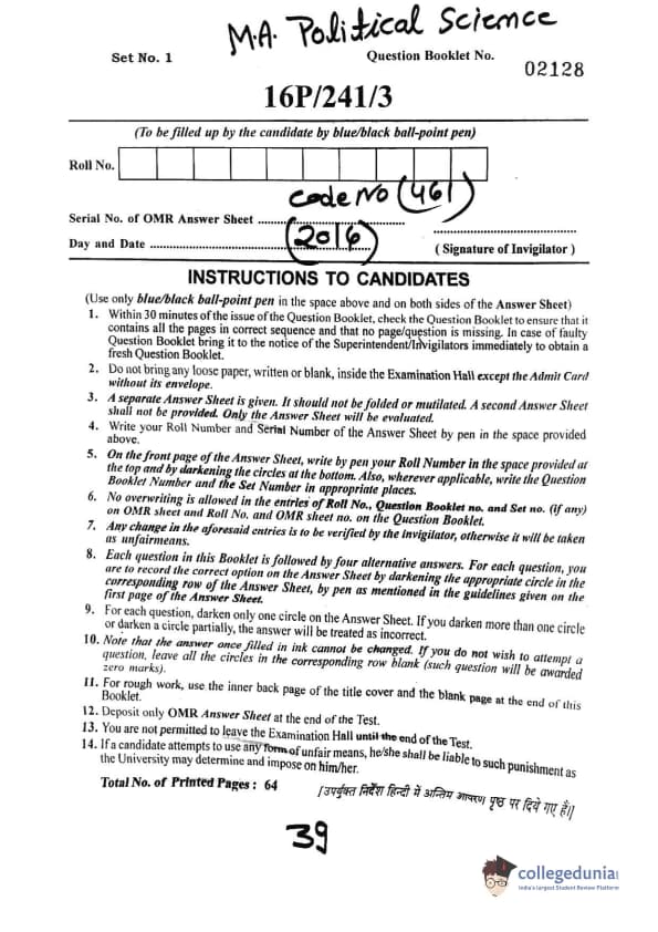 BHU PET 2016 M.A. POLITICAL SCIENCE Question paper with answer key pdf is available for download. The exam was successfully organized by Banaras Hindu University (BHU). The question paper comprised a total of 150 questions.