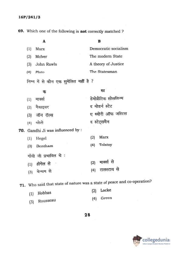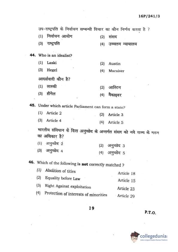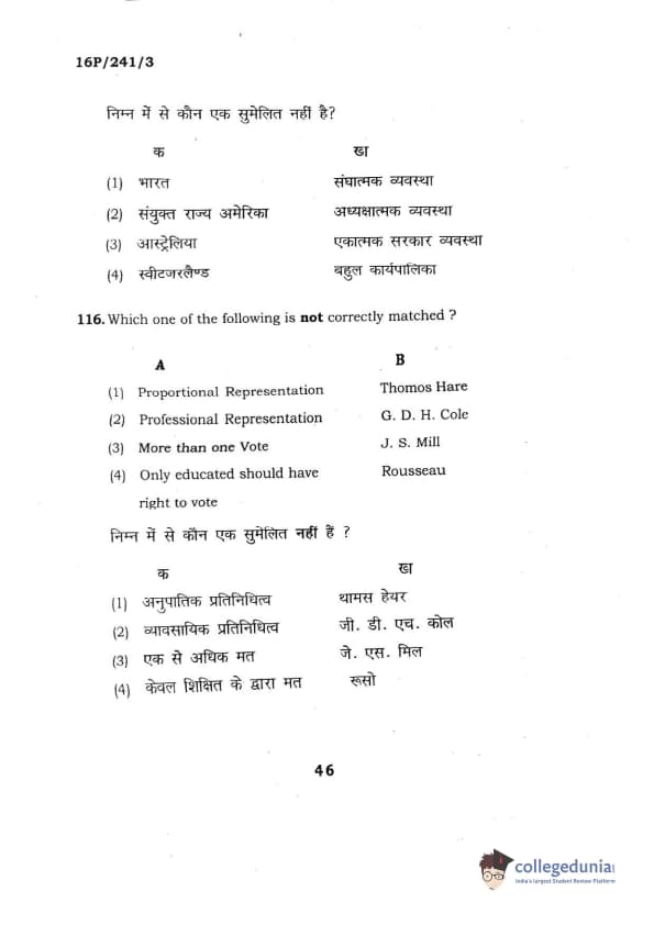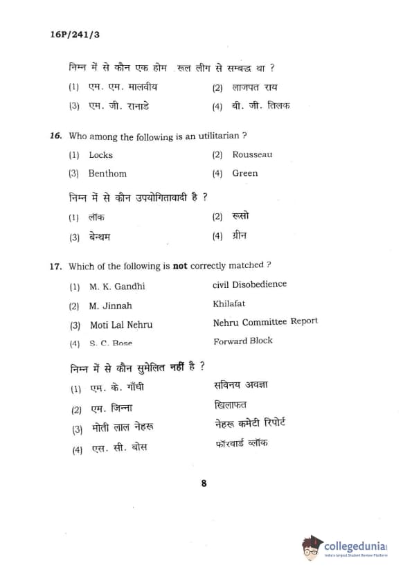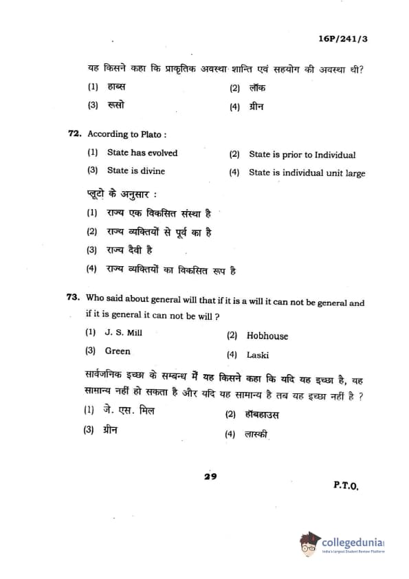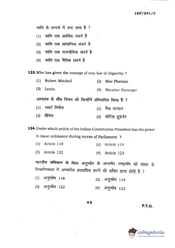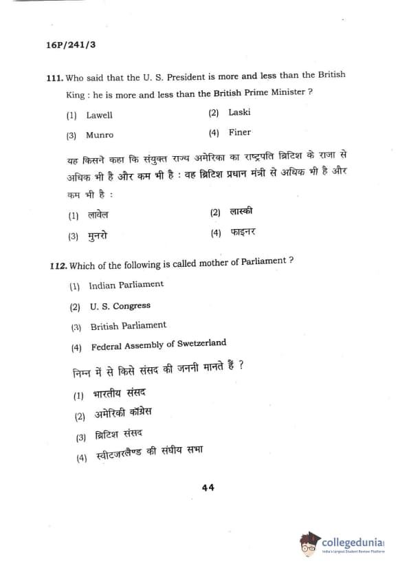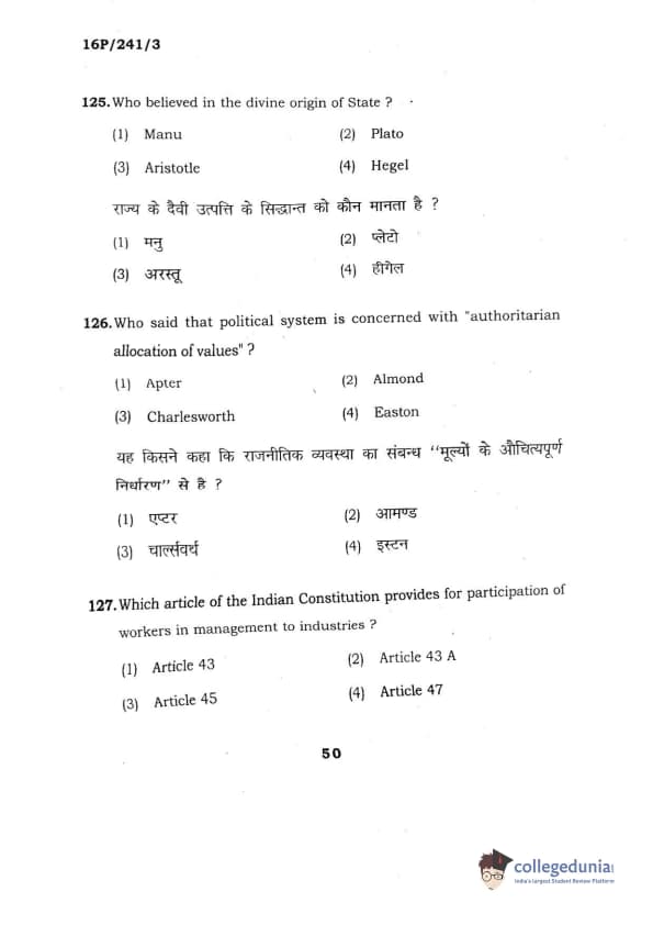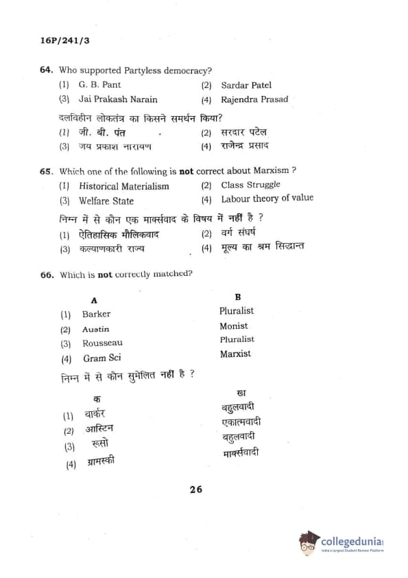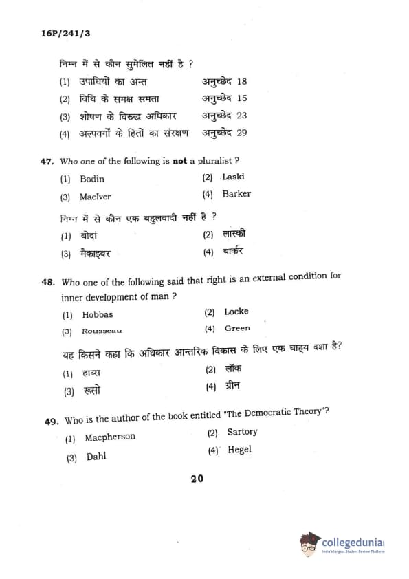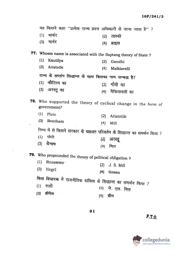 BHU PET 2016 M.A. POLITICAL SCIENCE Question Paper with Answer Key PDFs